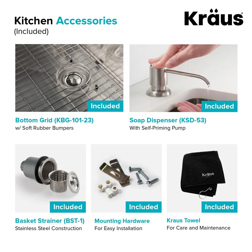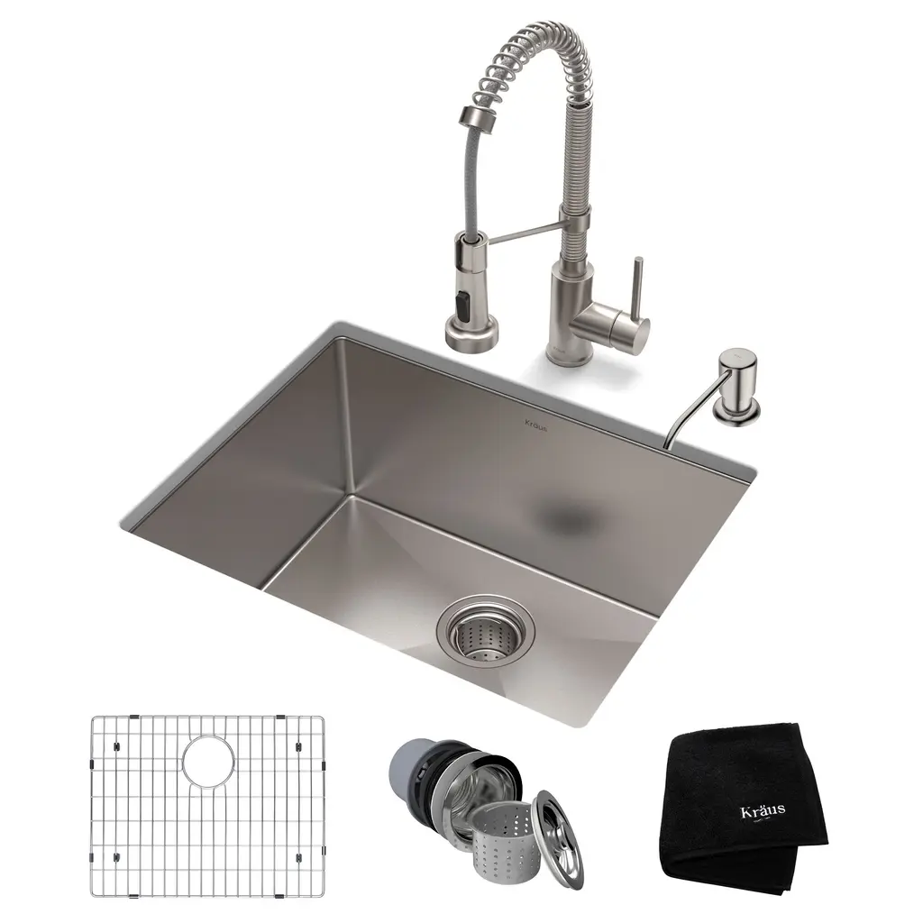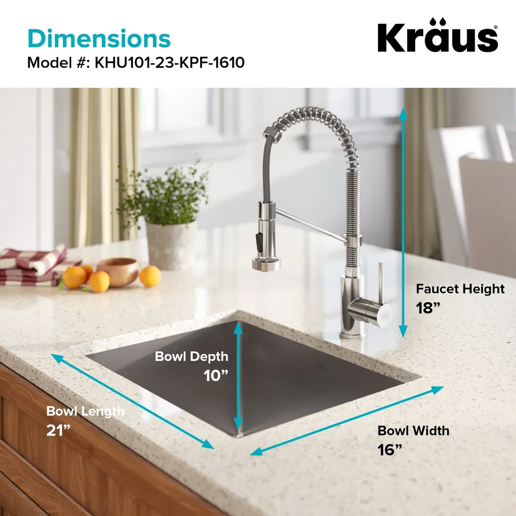 KRAUS KHU101-23 Standart PRO 23-inch 16 Gauge Undermount Single Bowl Stainless Steel Kitchen Sink. Enjoy the advantage of high-end kitchen sinks with the best-selling Standart PRO Series. This KRAUS sink features a clean contemporary design and wear-resistant finish with a beautiful sheen that complements most kitchen appliances.Features: Included: Dimensions: Warranty and certification: Compatible with: KRAUS KPF-1610 Bolden 18-Inch Commercial Kitchen Faucet with Dual Function Pull-Down Sprayhead. The Bolden commercial-style faucet creates a captivating industrial look with a high-arc open coil spout, and offers the advantage of a compact 18 inches height that fits underneath most kitchen cabinets.Features: Included: Finishes: Dimensions: Warranty and certification: