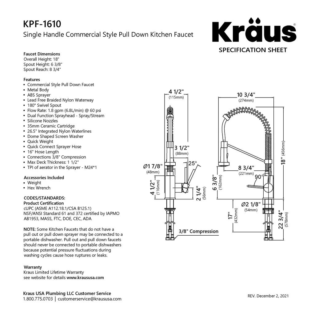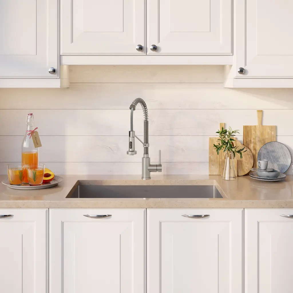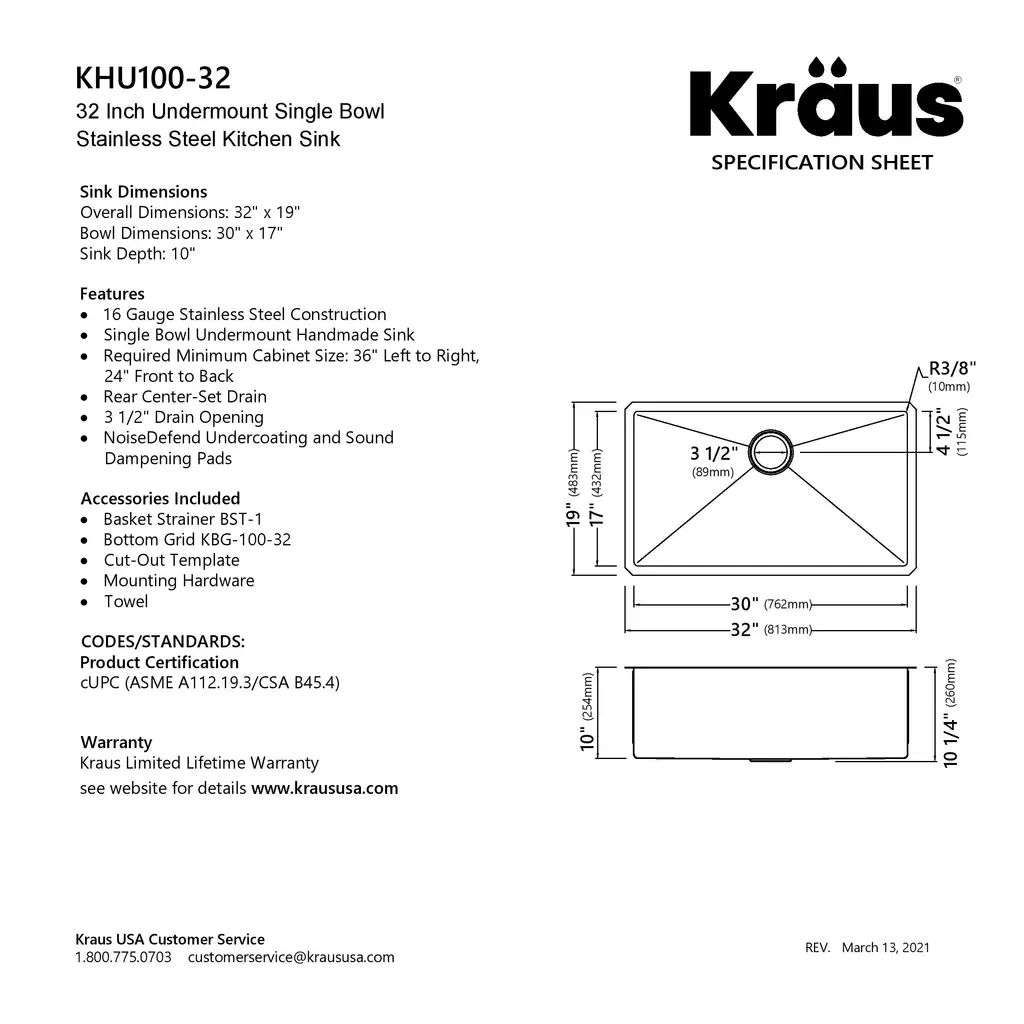 KRAUS KHU100-32 Standart PRO 32-inch 16 Gauge Undermount Single Bowl Stainless Steel Kitchen Sink. Enjoy the advantage of high-end kitchen sinks with the best-selling Standart PRO Series. This KRAUS sink features a clean contemporary design and wear-resistant finish with a beautiful sheen that complements most kitchen appliances.Features: Included: Dimensions: Warranty and certification: Compatible with: KRAUS KPF-1610 Bolden 18-Inch Commercial Kitchen Faucet with Dual Function Pull-Down Sprayhead. The Bolden commercial-style faucet creates a captivating industrial look with a high-arc open coil spout, and offers the advantage of a compact 18 inches height that fits underneath most kitchen cabinets.Features: Included: Finishes: Dimensions: Warranty and certification: