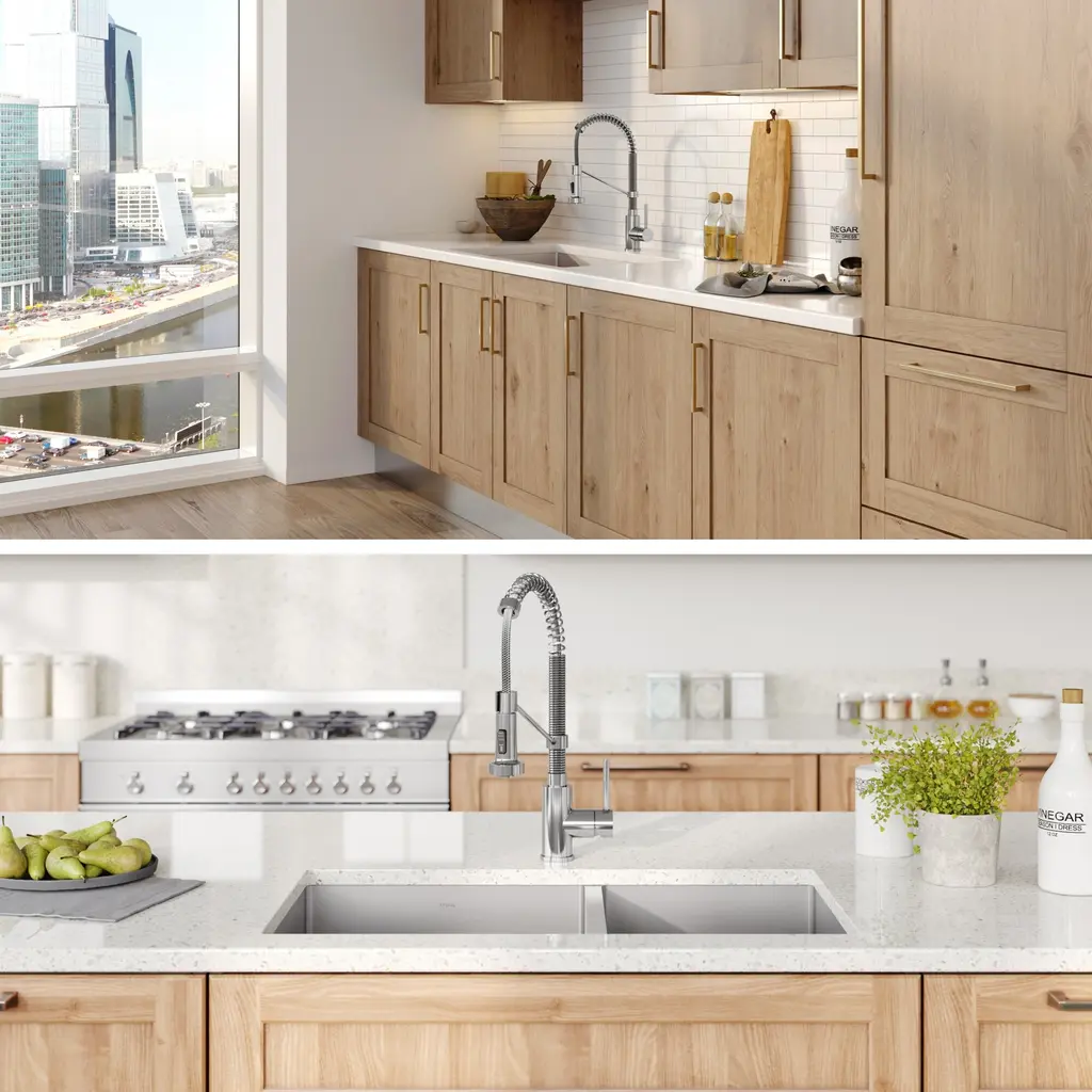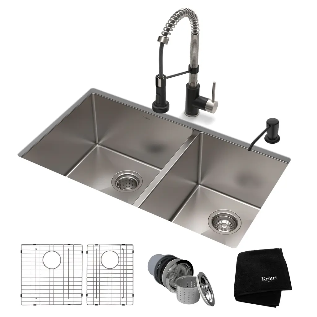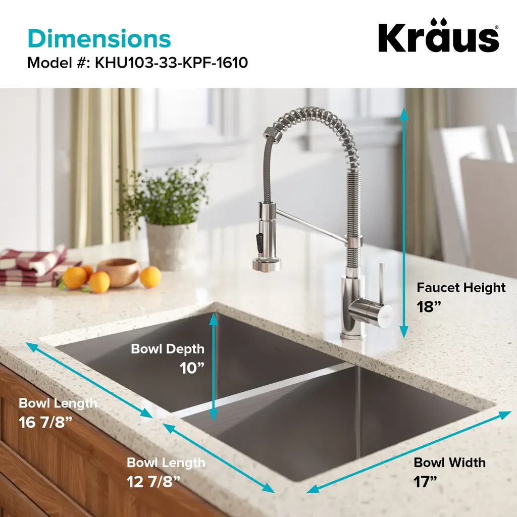 KRAUS KHU103-33 Standart PRO 33-inch 16 Gauge Undermount 60/40 Double Bowl Stainless Steel Kitchen Sink. Enjoy the advantage of high-end kitchen sinks with the best-selling Standart PRO Series. This KRAUS sink features a clean contemporary design and wear-resistant finish with a beautiful sheen that complements most kitchen appliances.Features: Included: Dimensions: Warranty and certification: Compatible with: KRAUS KPF-1610 Bolden 18-Inch Commercial Kitchen Faucet with Dual Function Pull-Down Sprayhead. The Bolden commercial-style faucet creates a captivating industrial look with a high-arc open coil spout, and offers the advantage of a compact 18 inches height that fits underneath most kitchen cabinets.Features: Included: Finishes: Dimensions: Warranty and certification: