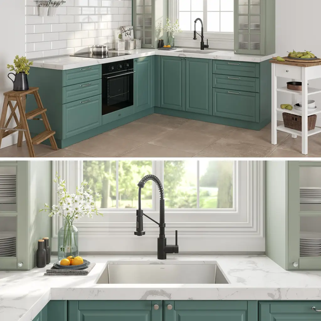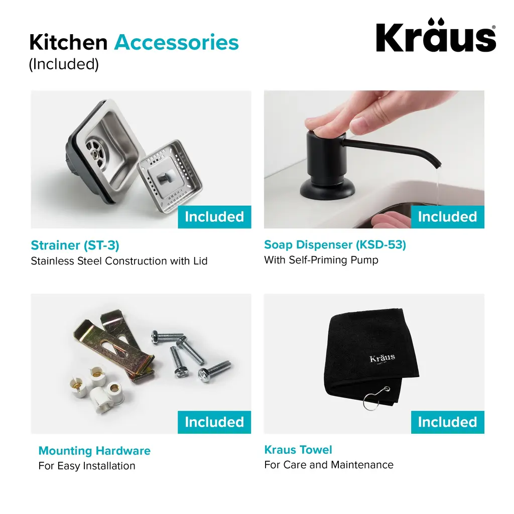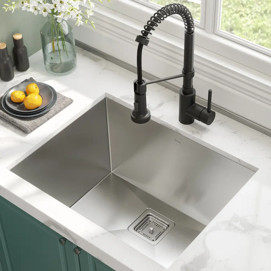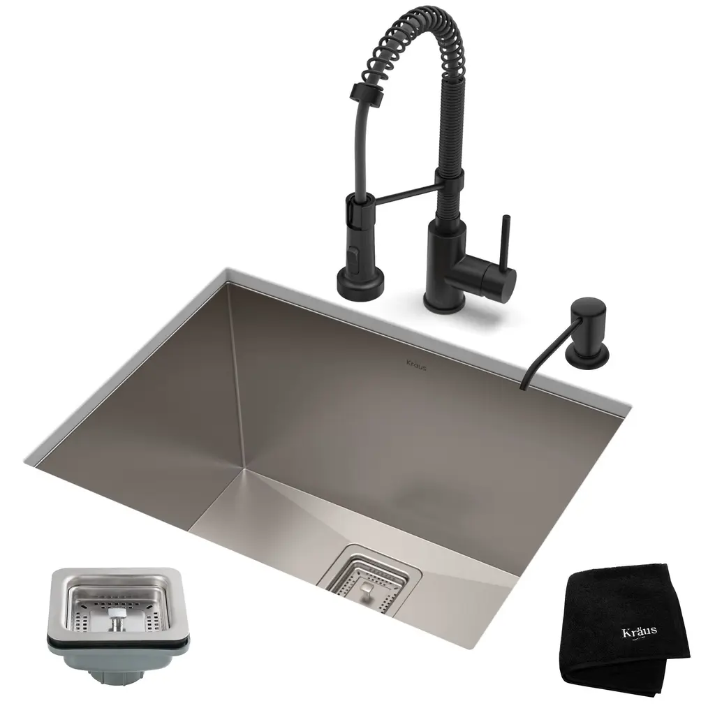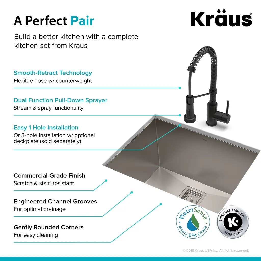 KRAUS KHU24L Pax Zero-Radius 24-inch 18 Gauge Undermount Single Bowl Stainless Steel Laundry and Utility Sink. Scrub stains on clothes or wash big utensils conveniently with this deep, single-bowl, insulated utility sink featuring a square strainer for easy maintenance. Made from heavy-duty, satin-finished stainless steel, this scratch-, rust-, and, corrosion-resistant sink provides lasting use. This sleek undermount sink blends perfectly in your modern kitchen or laundry room.Features: Included: Dimensions: Warranty and certification: KRAUS KPF-1610 Bolden 18-Inch Commercial Kitchen Faucet with Dual Function Pull-Down Sprayhead. The Bolden commercial-style faucet creates a captivating industrial look with a high-arc open coil spout, and offers the advantage of a compact 18 inches height that fits underneath most kitchen cabinets.Features: Included: Finishes: Dimensions: Warranty and certification: