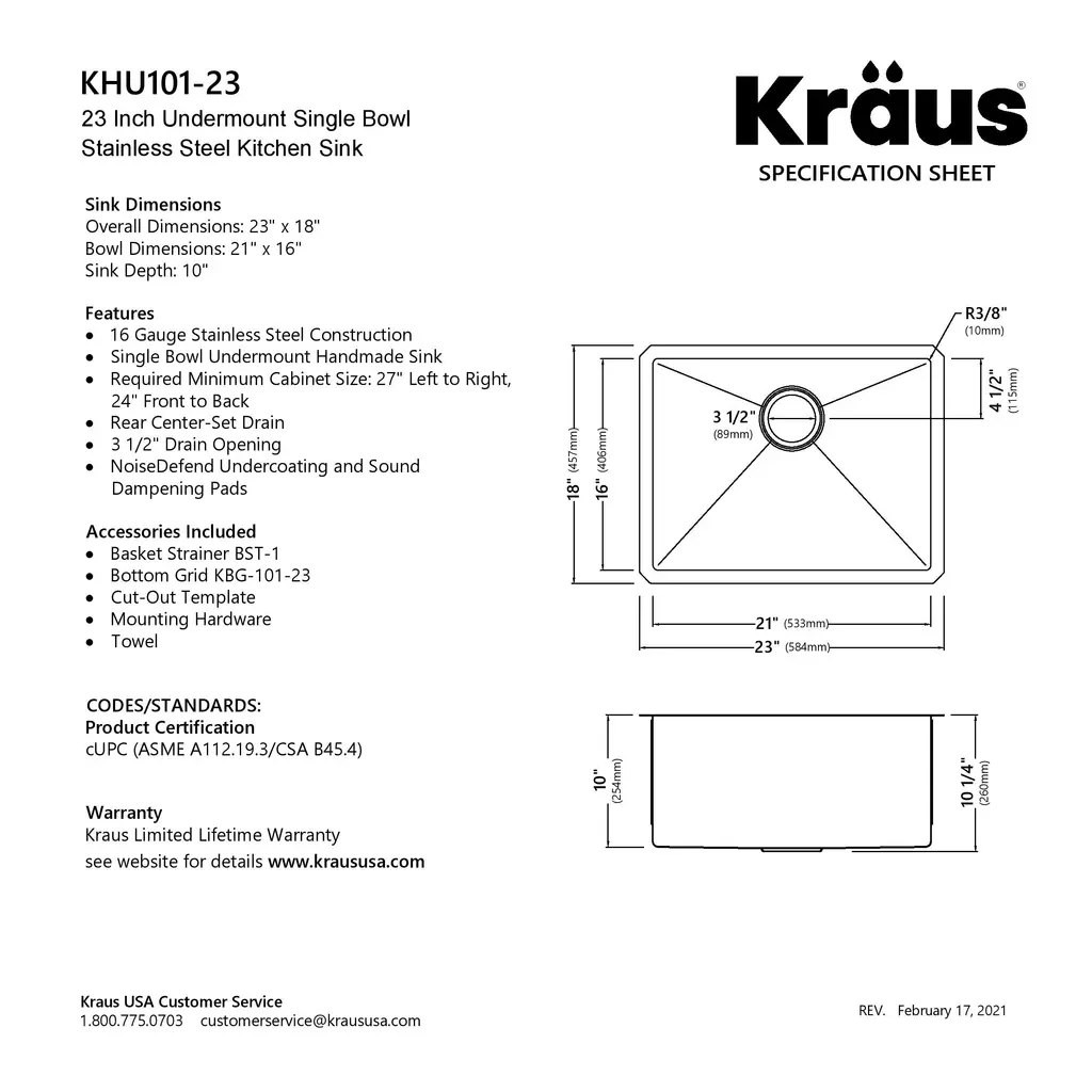 KRAUS KHU101-23 Standart PRO 23-inch 16 Gauge Undermount Single Bowl Stainless Steel Kitchen Sink. Enjoy the advantage of high-end kitchen sinks with the best-selling Standart PRO Series. This KRAUS sink features a clean contemporary design and wear-resistant finish with a beautiful sheen that complements most kitchen appliances.Features: Included: Dimensions: Warranty and certification: Compatible with: KRAUS KPF-1610 Bolden 18-Inch Commercial Kitchen Faucet with Dual Function Pull-Down Sprayhead. The Bolden commercial-style faucet creates a captivating industrial look with a high-arc open coil spout, and offers the advantage of a compact 18 inches height that fits underneath most kitchen cabinets.Features: Included: Finishes: Dimensions: Warranty and certification:
