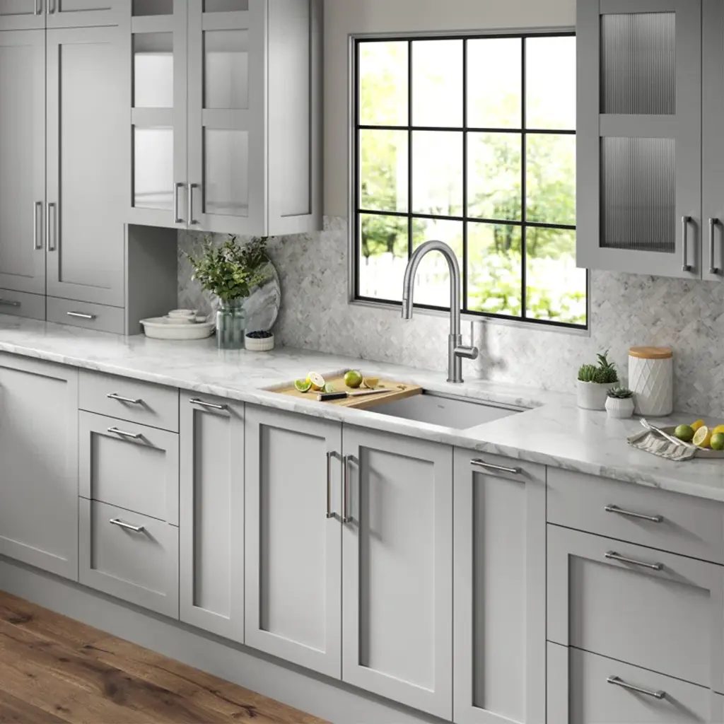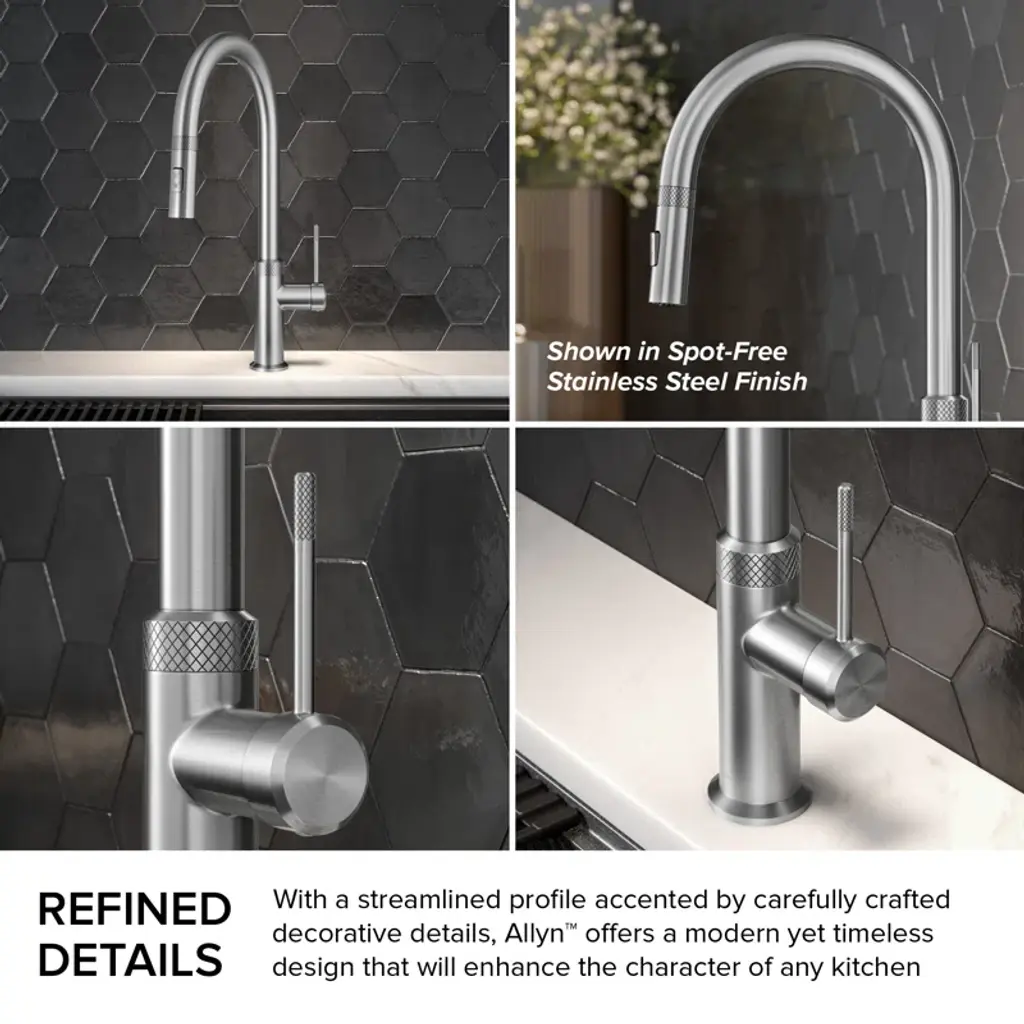 A refined take on the industrial aesthetic, the Modern Pull-Down Faucet combines a streamlined silhouette with diamond-knurled details for the perfect visual balance. The pull-down spray head with a swivel adapter provides maneuverability so you can flex, pivot, and reach all around the sink. A high-arc spout offers ample space for large cookware in the kitchen sink. The single lever handle is designed with 90-degree forward rotation for installation in tight spaces and ease of use. The robust design features a metal body and premium components, including a ceramic cartridge, snap-on counterweight, and quick-connect sprayer hose for leak-free use. Comes with pre-attached water lines and mounting hardware for easy installation.