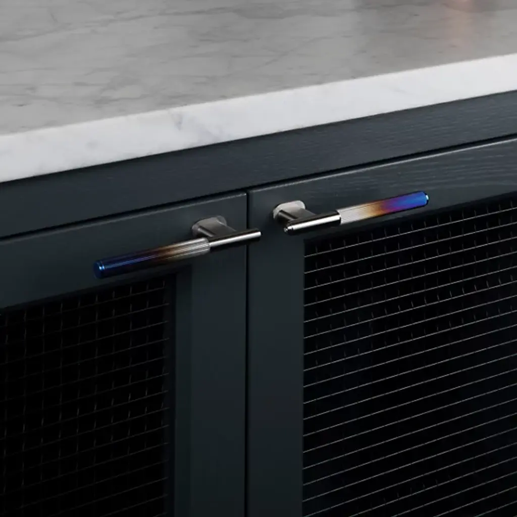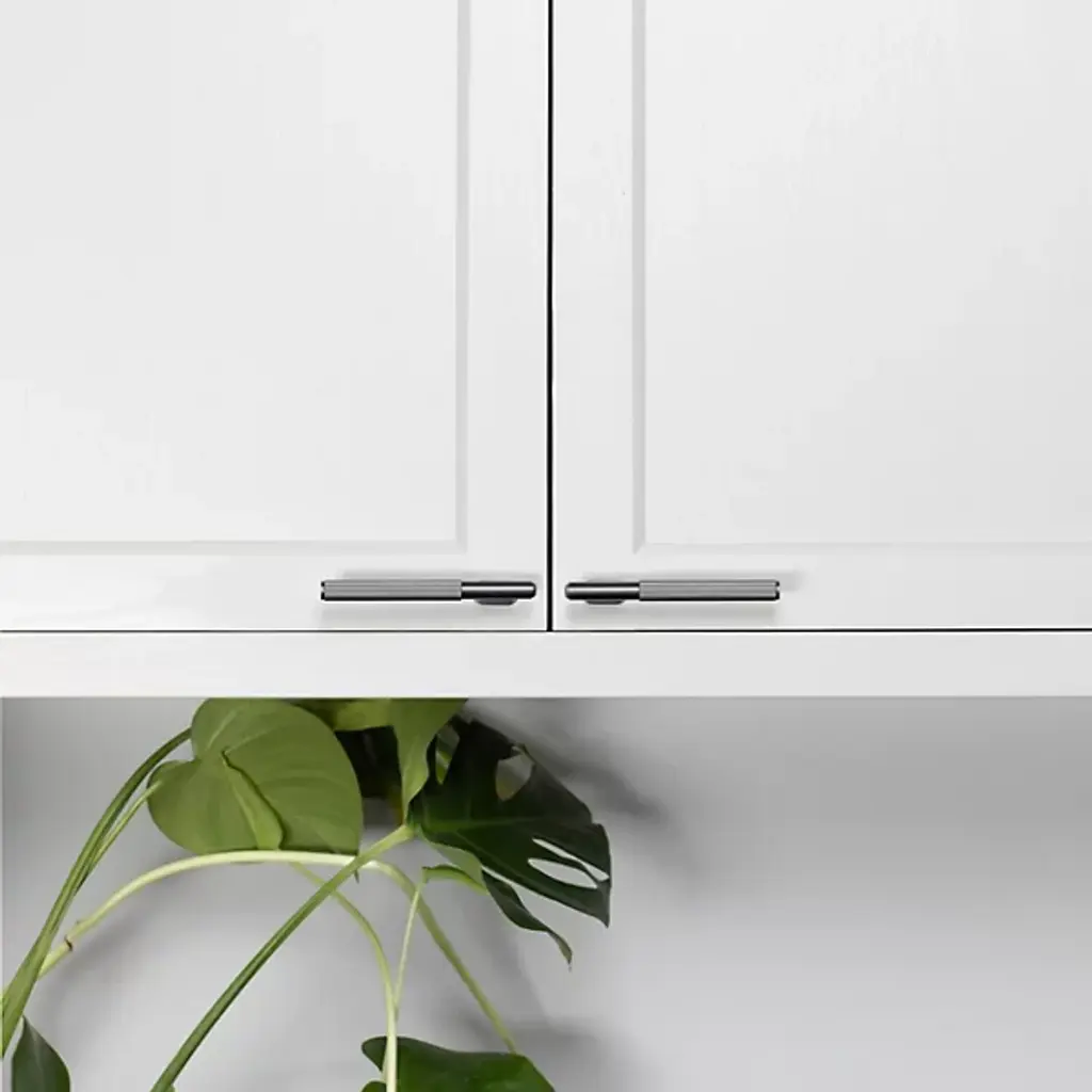 Add a refined, retro accompaniment to cabinet doors and more with the artful and inspired lines of the L-Bar Handle from Buster + Punch. Fashioned from solid metal, it extends from a precisely milled oval wall plate and coordinated bar, supporting a slender handle that contrasts a polished upper segment and lower cap with a vertically lined handle. The juxtaposition in surfaces creates a retro appeal while adding rich texture and extra surface area for a certain grip.
