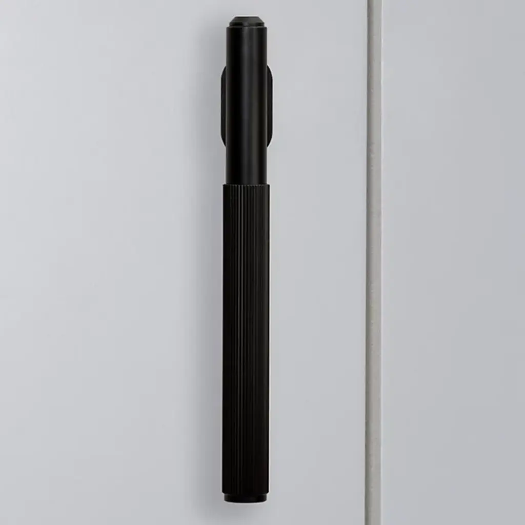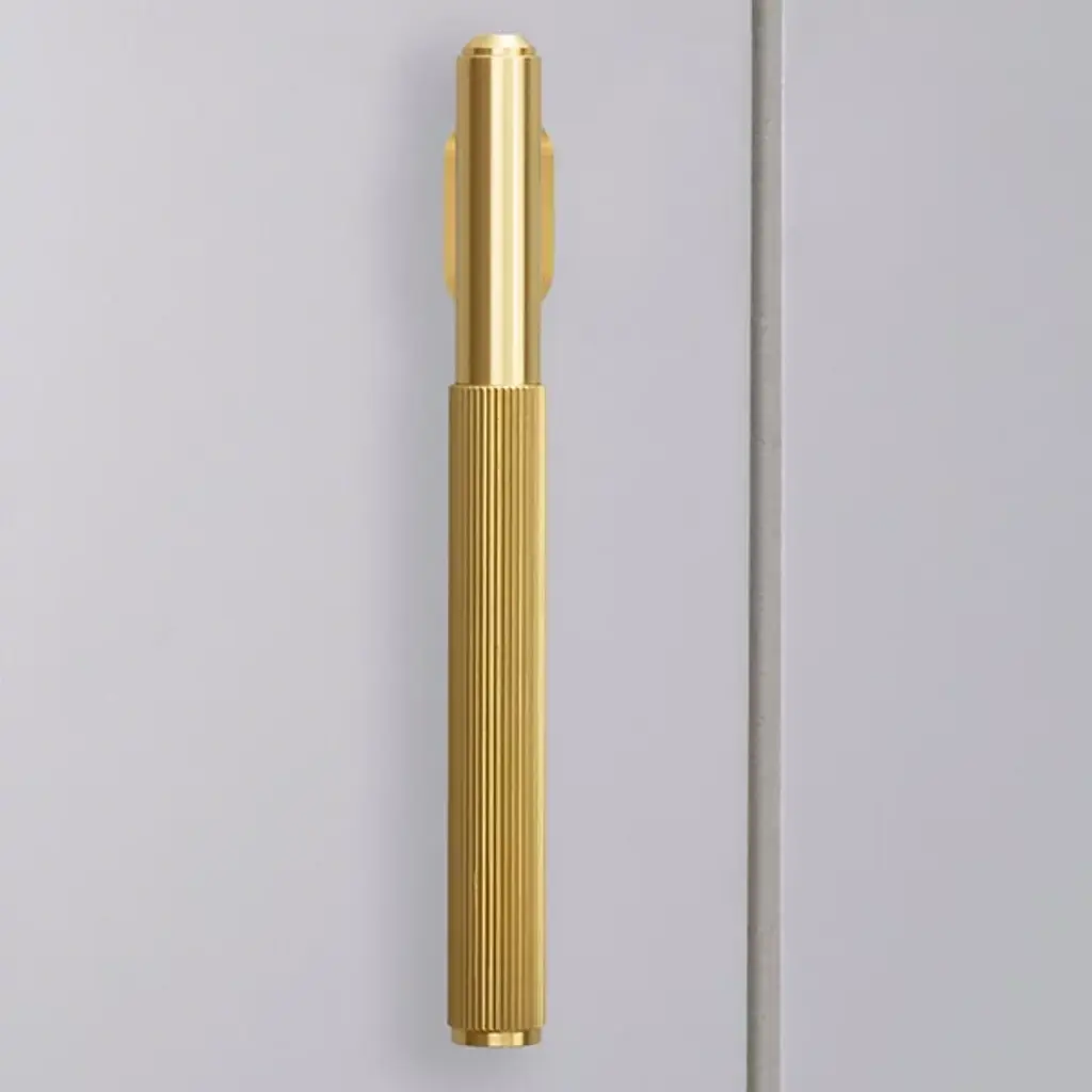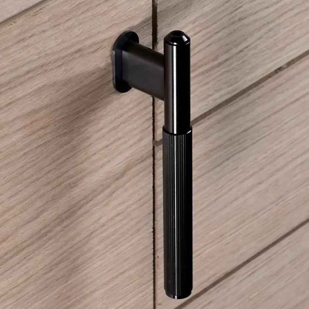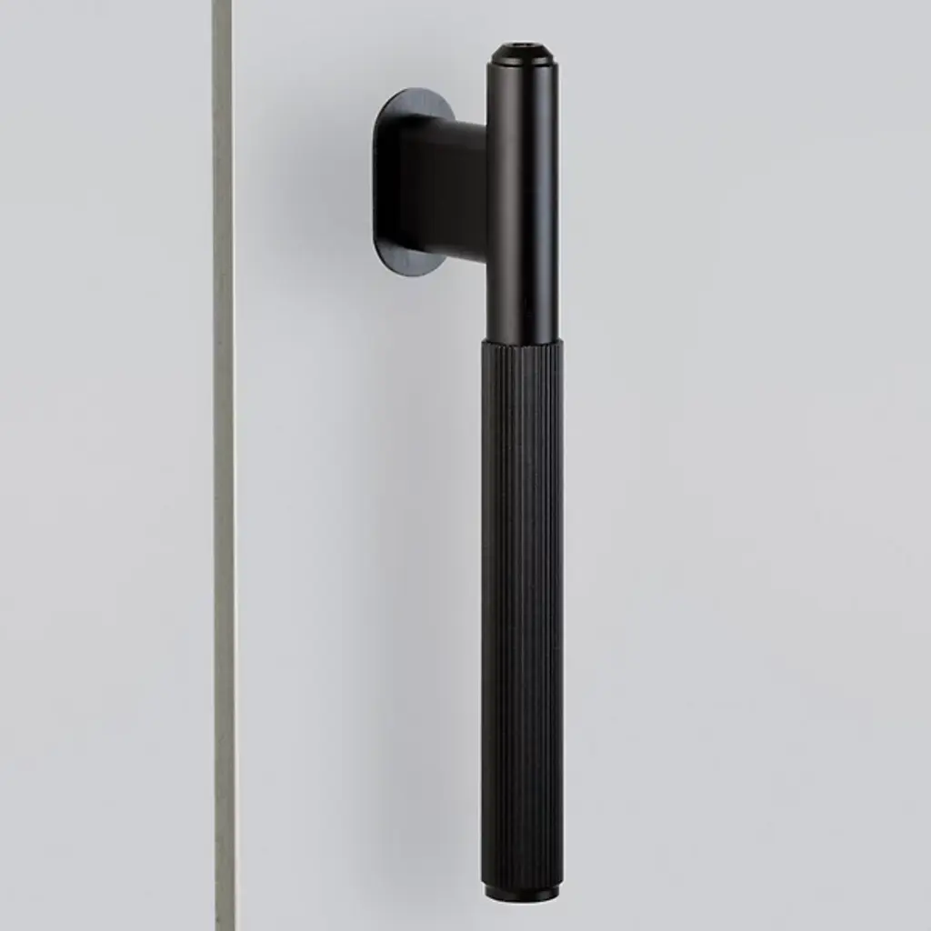 Add a refined, retro accompaniment to cabinet doors and more with the artful and inspired lines of the L-Bar Handle from Buster + Punch. Fashioned from solid metal, it extends from a precisely milled oval wall plate and coordinated bar, supporting a slender handle that contrasts a polished upper segment and lower cap with a vertically lined handle. The juxtaposition in surfaces creates a retro appeal while adding rich texture and extra surface area for a certain grip.