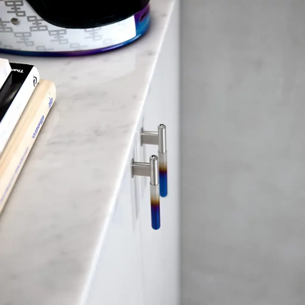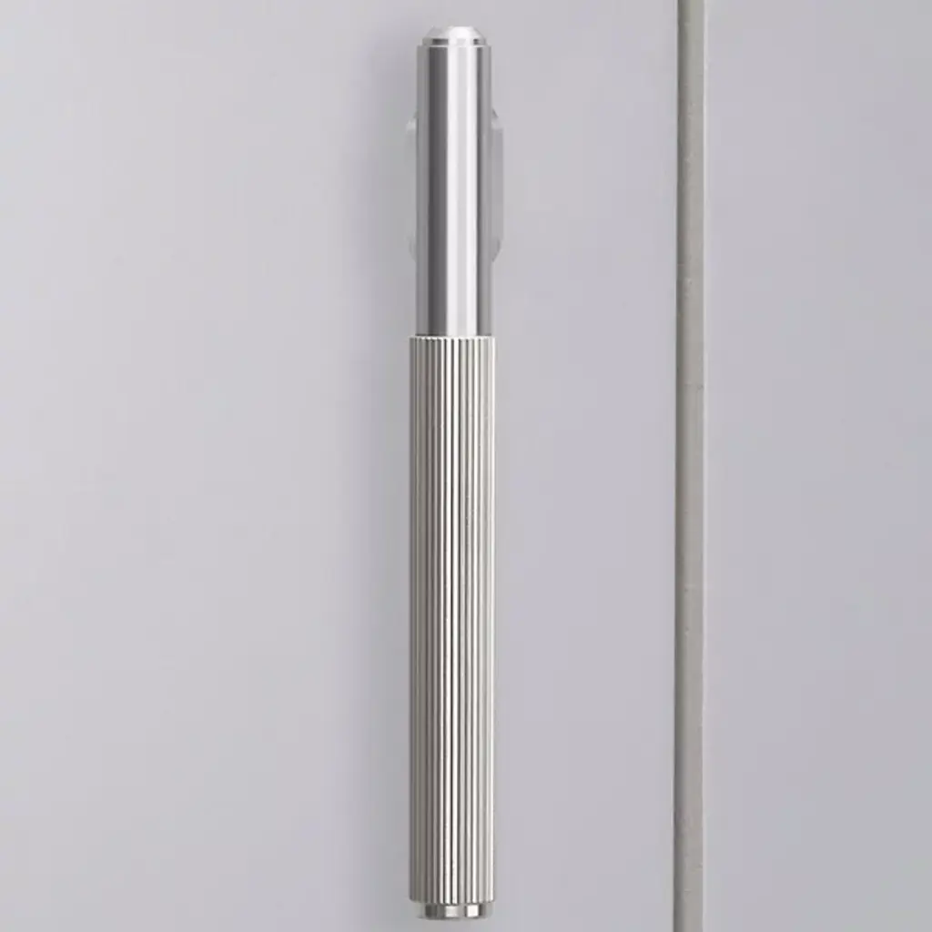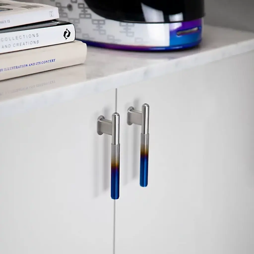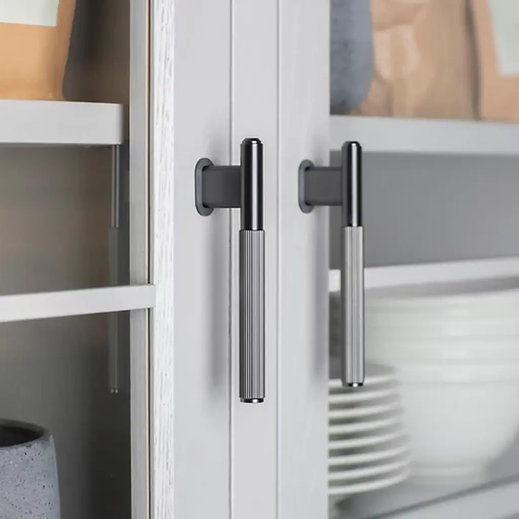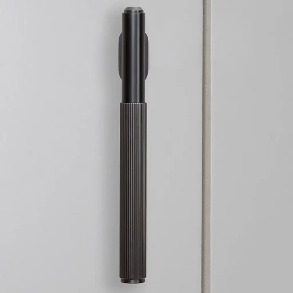 Add a refined, retro accompaniment to cabinet doors and more with the artful and inspired lines of the L-Bar Handle from Buster + Punch. Fashioned from solid metal, it extends from a precisely milled oval wall plate and coordinated bar, supporting a slender handle that contrasts a polished upper segment and lower cap with a vertically lined handle. The juxtaposition in surfaces creates a retro appeal while adding rich texture and extra surface area for a certain grip.