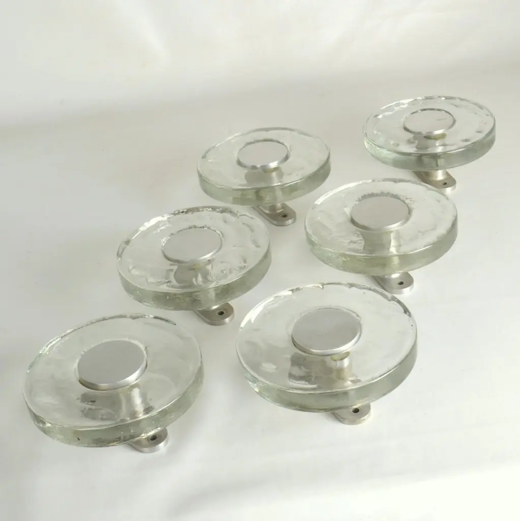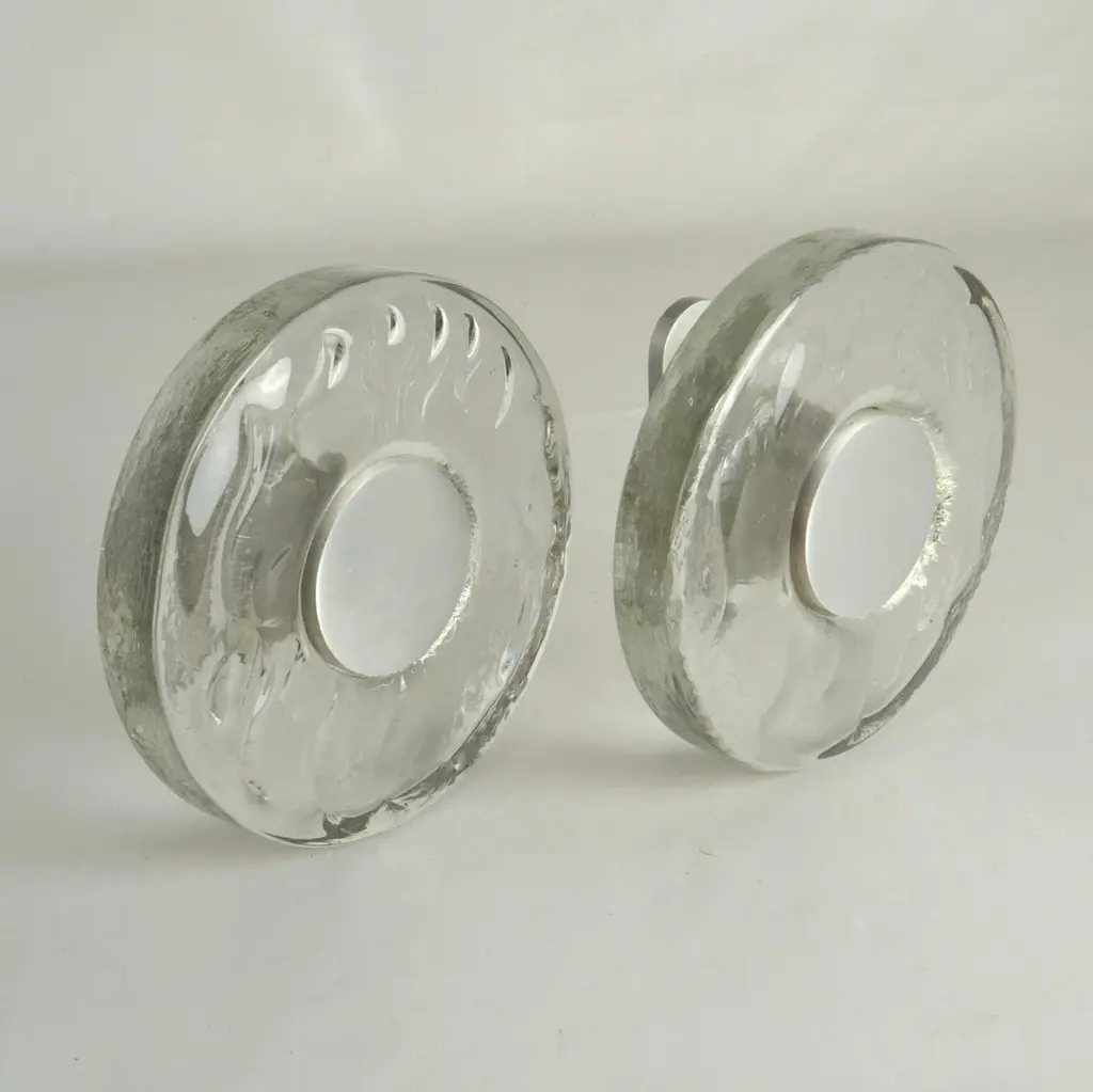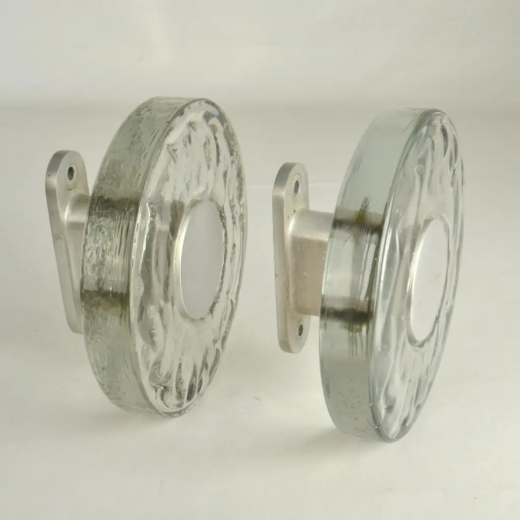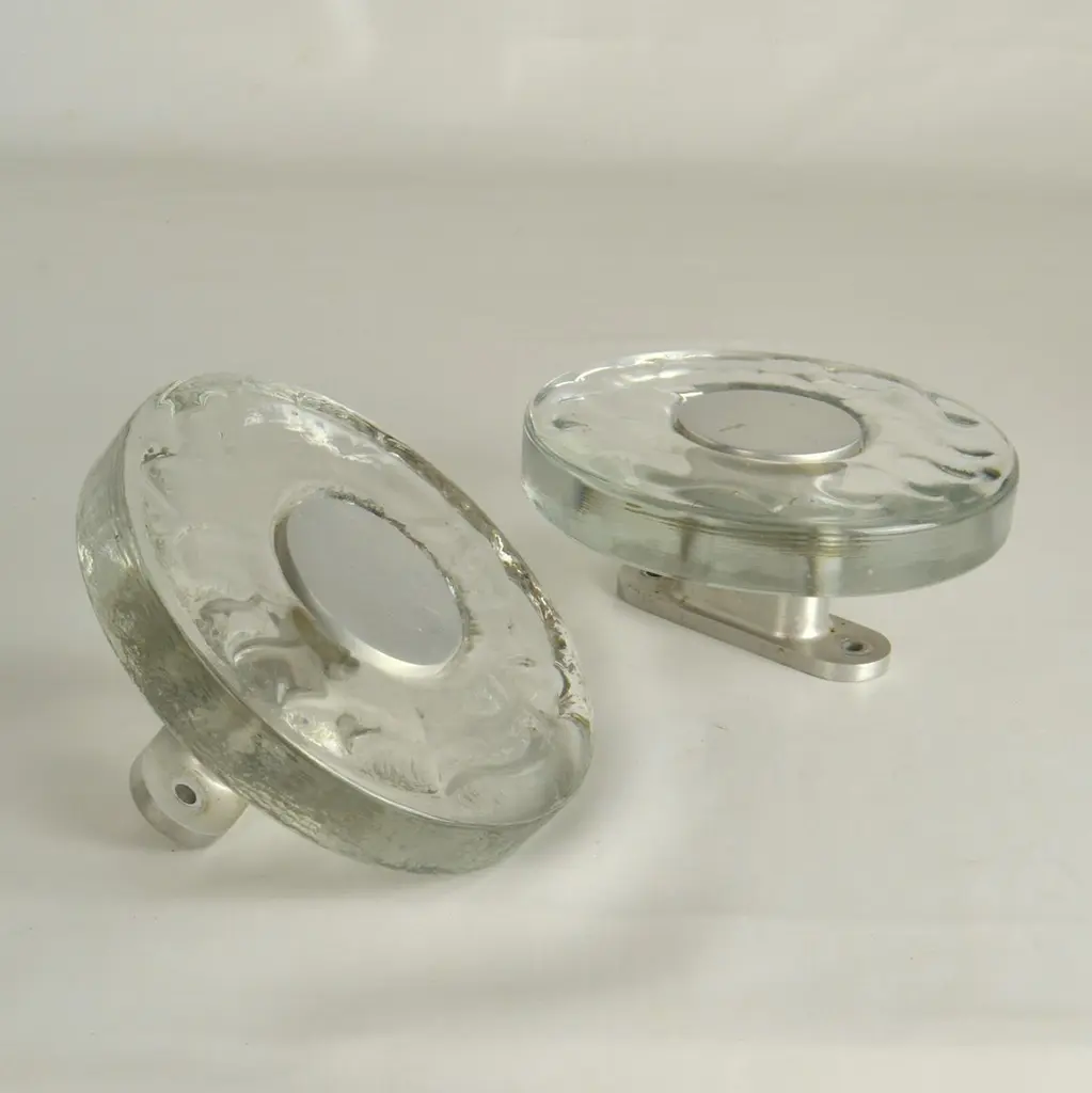 Pairs of round double door 1960's push and pull handles in clear glass with subtile wave relief, cast glass (2cm thick) with aluminum fittings. They are designed for a glass doors but suitable for any kind of doors including wooden doors. The glass slabs are cast by directing molten glass into a mould where it solidifies. The surface of the mould gives an wave effect and translucency. The simple form of the door handles will perform as decorative features as well as functional implement. They will work inside or outside any contemporary building today. They can be used on furniture as well as on entry doors.View our listings, they are part of our large collection of bronze and glass door handles by The Moderns.There are 3 sets of two handles available and they are priced per set of double door handles. They weigh 2.9 kg each.We have a large collection of door handles available, see all listings by The Moderns in the catagory; Building and Garden elements.