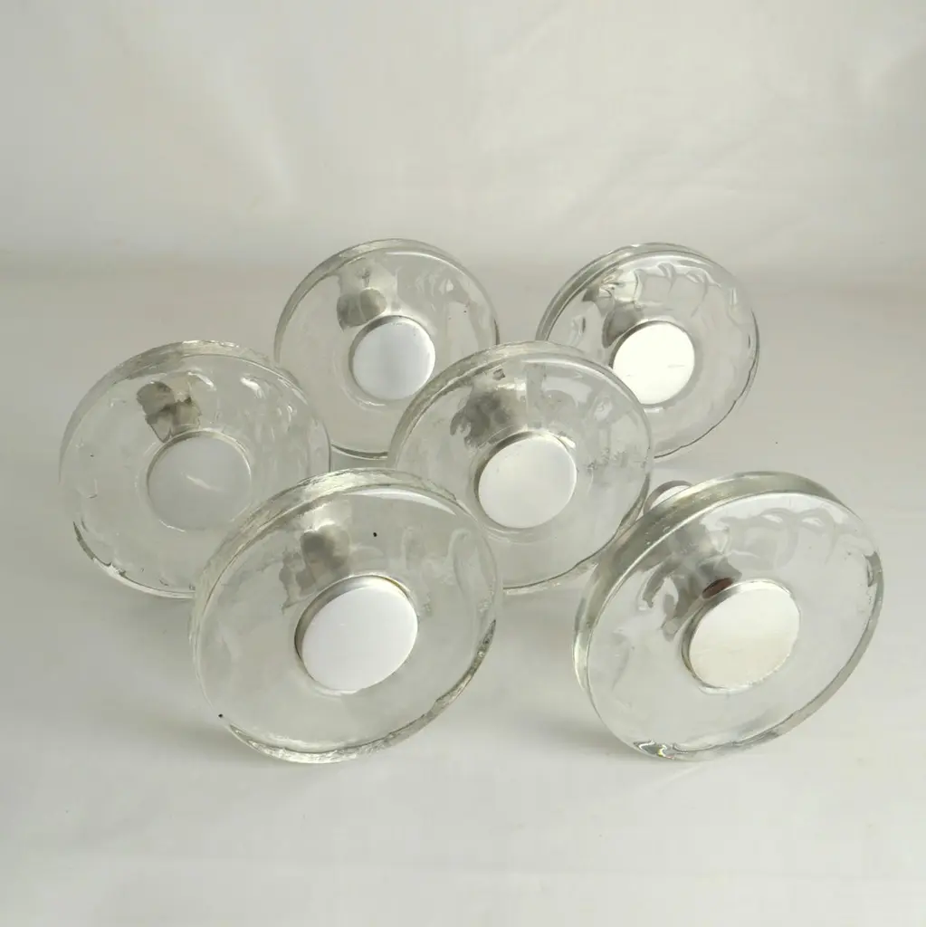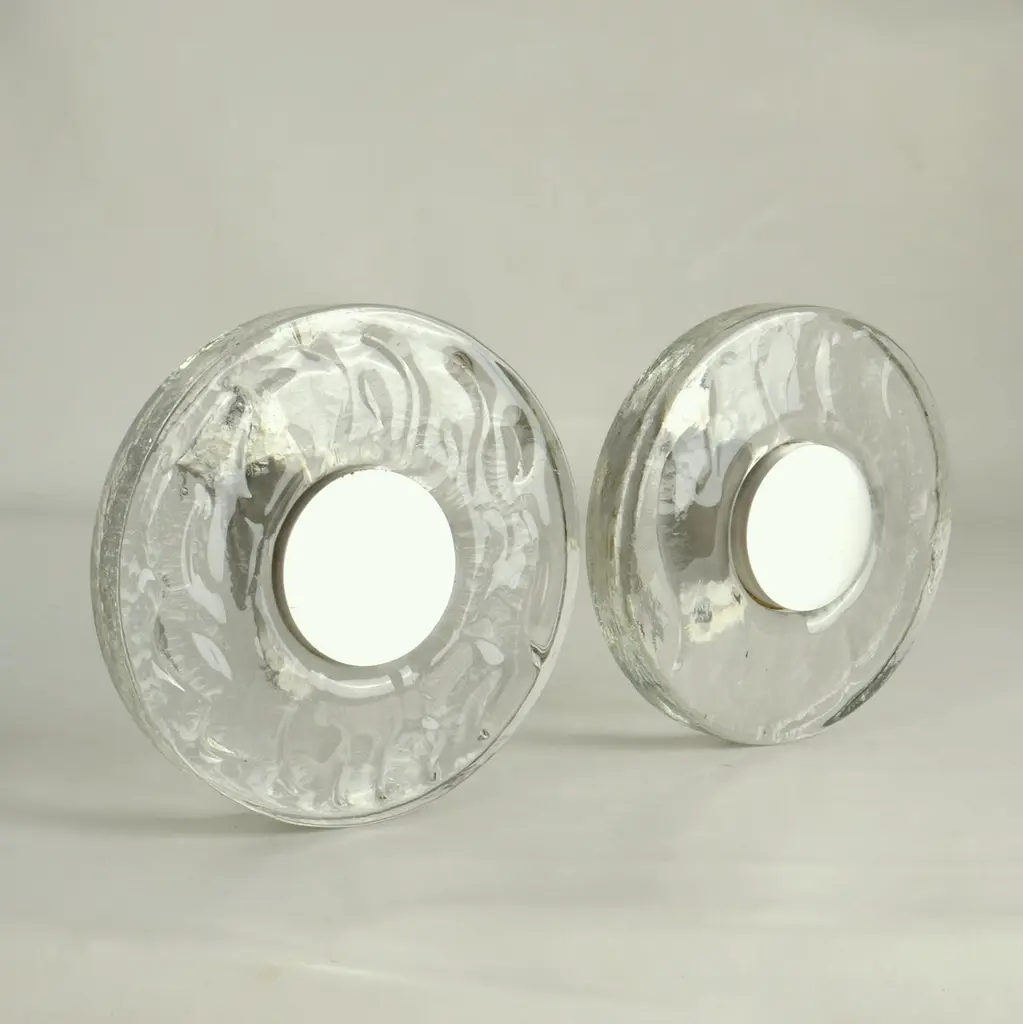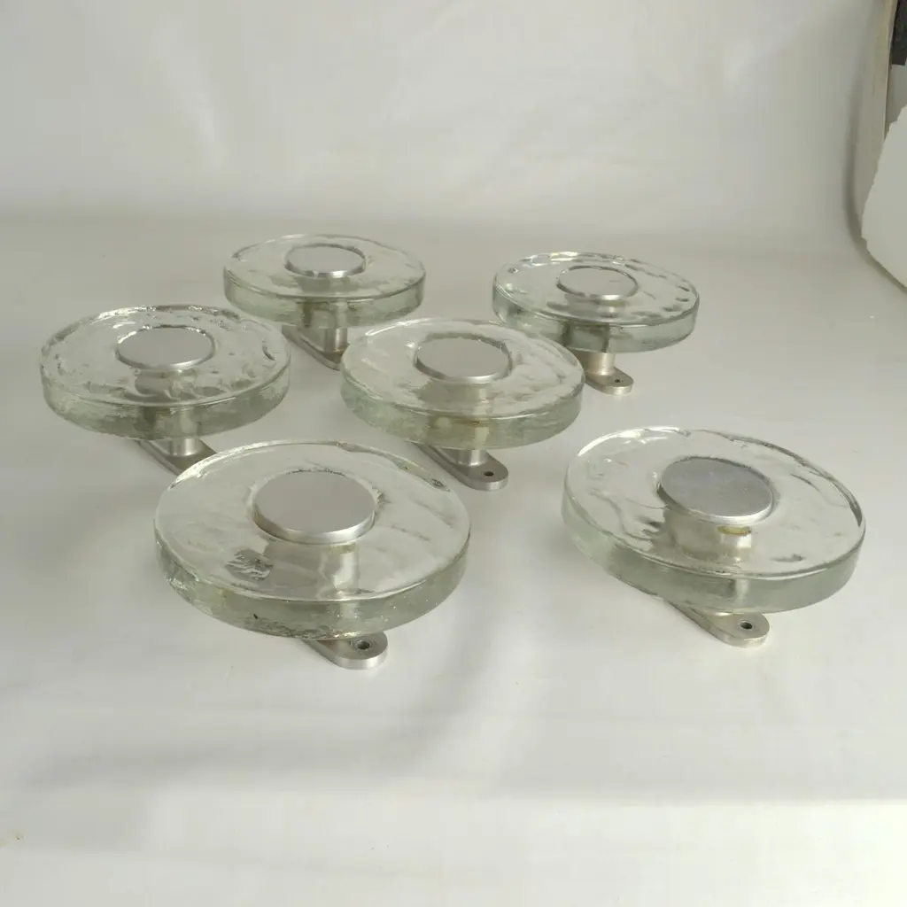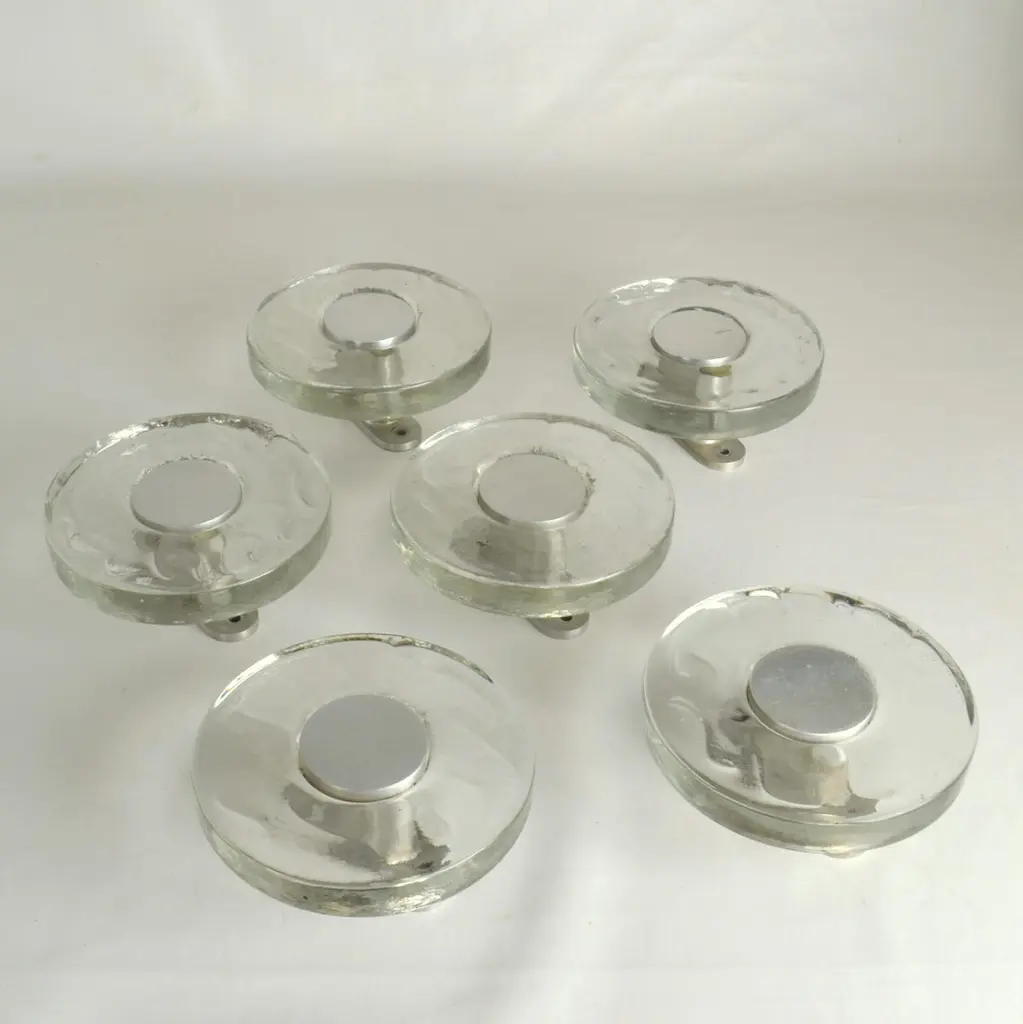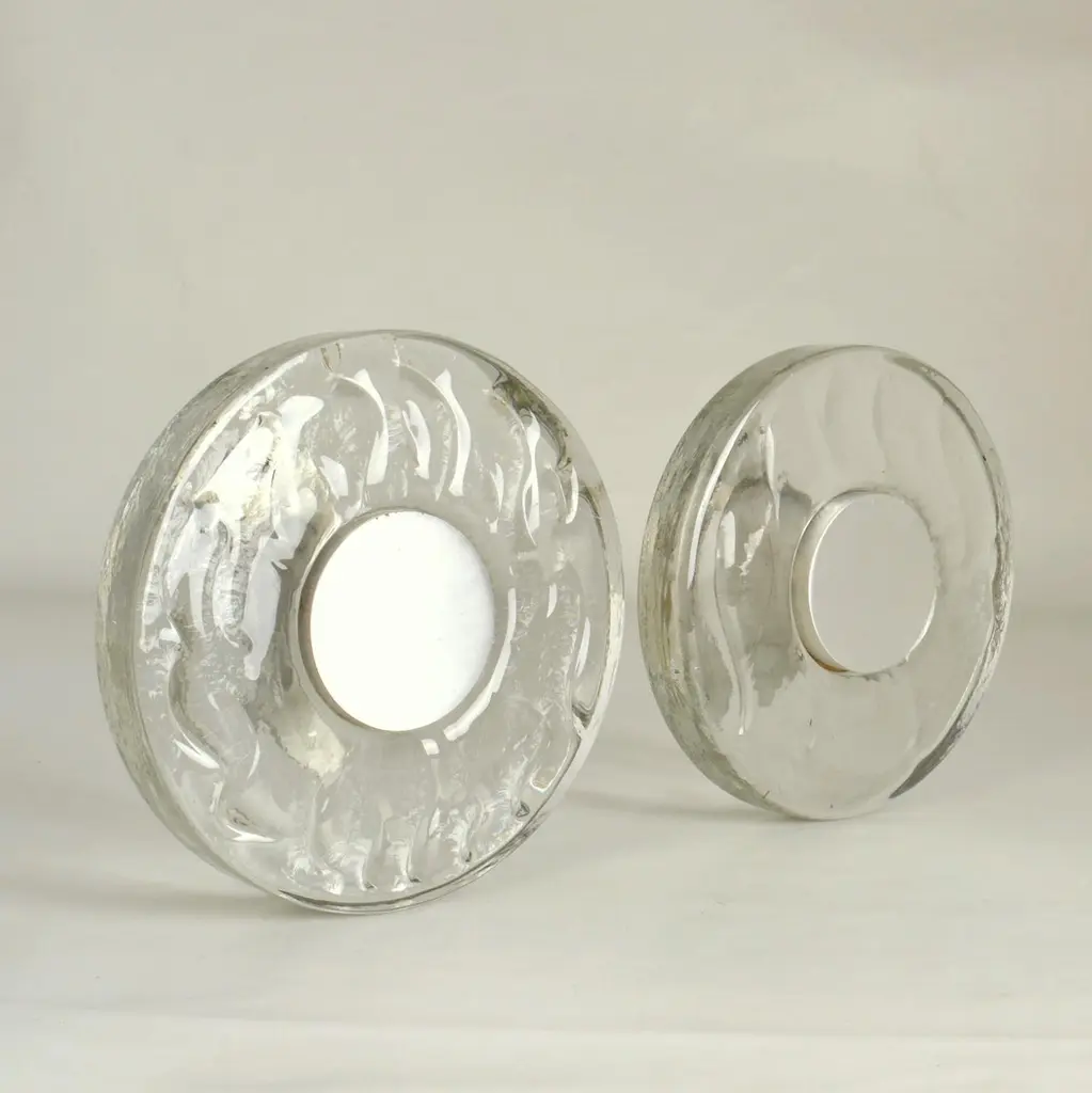 Pairs of round double door 1960's push and pull handles in clear glass with subtile wave relief, cast glass (2cm thick) with aluminum fittings. They are designed for a glass doors but suitable for any kind of doors including wooden doors. The glass slabs are cast by directing molten glass into a mould where it solidifies. The surface of the mould gives an wave effect and translucency. The simple form of the door handles will perform as decorative features as well as functional implement. They will work inside or outside any contemporary building today. They can be used on furniture as well as on entry doors.View our listings, they are part of our large collection of bronze and glass door handles by The Moderns.There are 3 sets of two handles available and they are priced per set of double door handles. They weigh 2.9 kg each.We have a large collection of door handles available, see all listings by The Moderns in the catagory; Building and Garden elements.