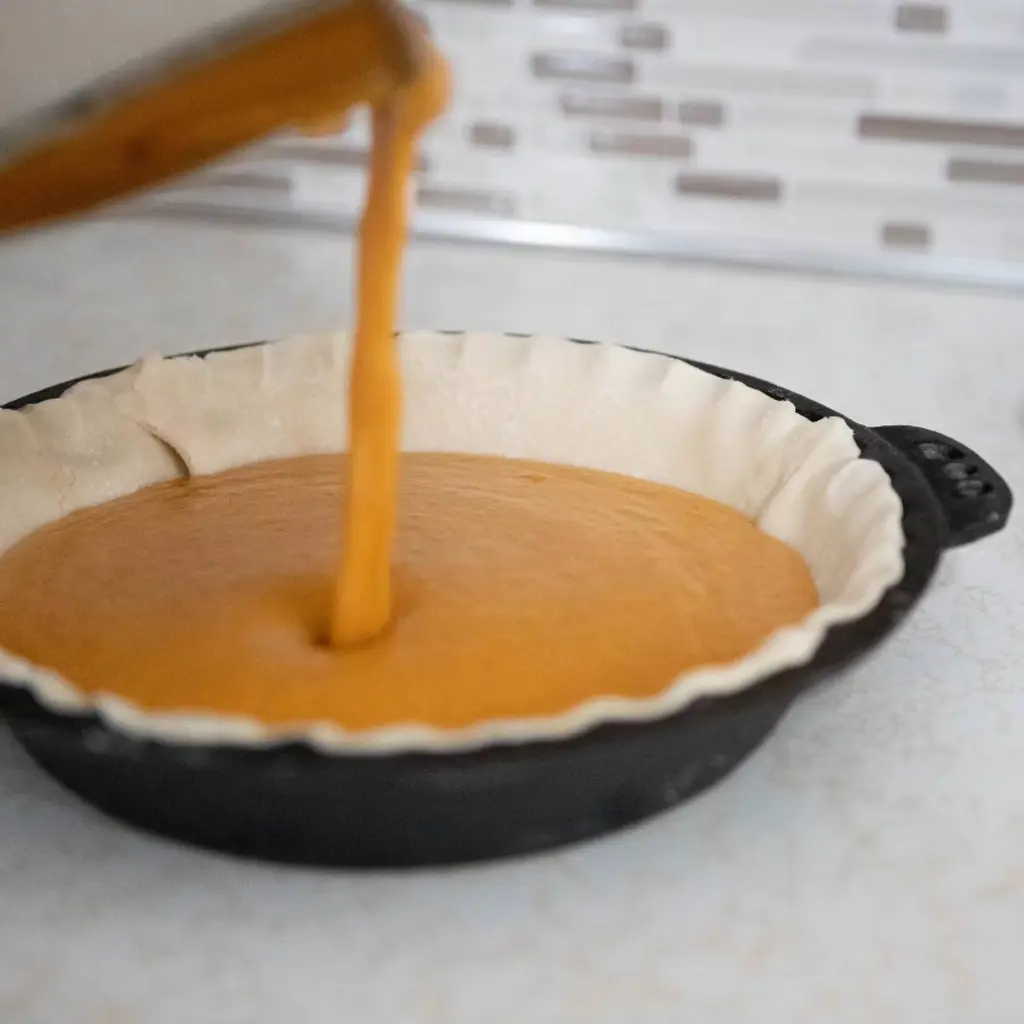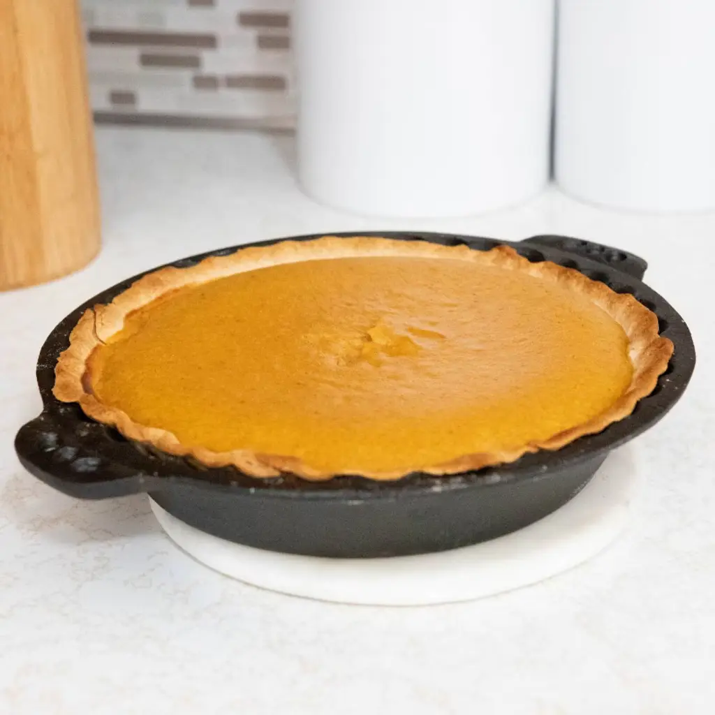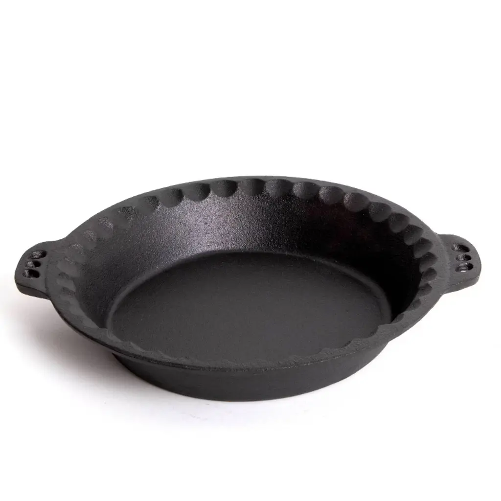 Cast Iron Pie Pan: Heats Evenly! Bake a delicious homemade pie with the perks of cast iron! Cast iron heats evenly, so your crust gets perfectly golden brown all the way around - no soggy crust. Care Instructions: Hand wash with hot water and a scrubber. Cast iron should be seasoned with oil, typically vegetable oil. It should never be soaked or cleaned with soap. Extra deep (1-3/4"D). Crimped edges. Dimensions: 12" L x 10-1/4" W x 1-3/4" D. Weight: Pre-seasoned pan is about 4.4 lb. Origin: China.