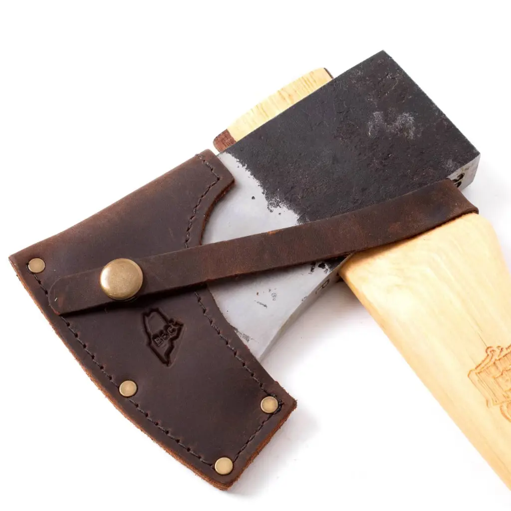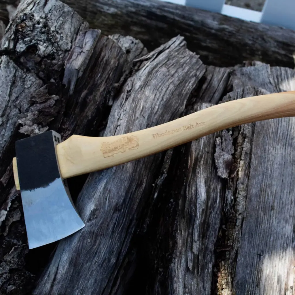 Woodsman's Belt Axe: Portable Size, USA Made! Discover dependable quality you can rely on again and again. Our Woodsmen's Belt Axe is completely made in the USA, from the sharp carbon steel axe head to the Amish-made hickory handle. With its 17" handle, it's the perfect size for splitting kindling, putting in your camp pack or canoe, or splitting firewood to fit into your wood stove. Compact for the campsite and smaller wood cutting jobs. Axe head is made of 1050 carbon steel from New York, hardened to Rockwell 56. Steel hardened to Rockwell 56 combines good edge holding ability with ease of sharpening. And the cutting edge resists chipping. (Most axes are only hardened to between Rockwell 52 and Rockwell 55.). 17" smooth crafted hickory handle made by an Amish family a few miles from our store. Hickory is much stronger than ash or maple (commonly used by other axe makers).. Comes with a leather cover for the head made from USA cowhide. . (The leather cover protects the edge from damage if it bangs against other steel tools in the bed of your truck. Be very careful putting it on and off because the edge is very sharp) USA made.