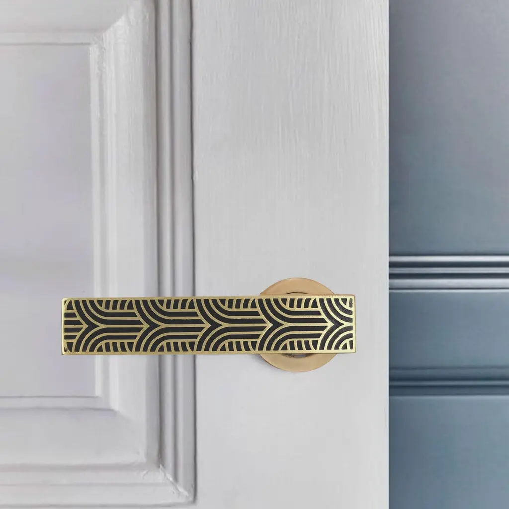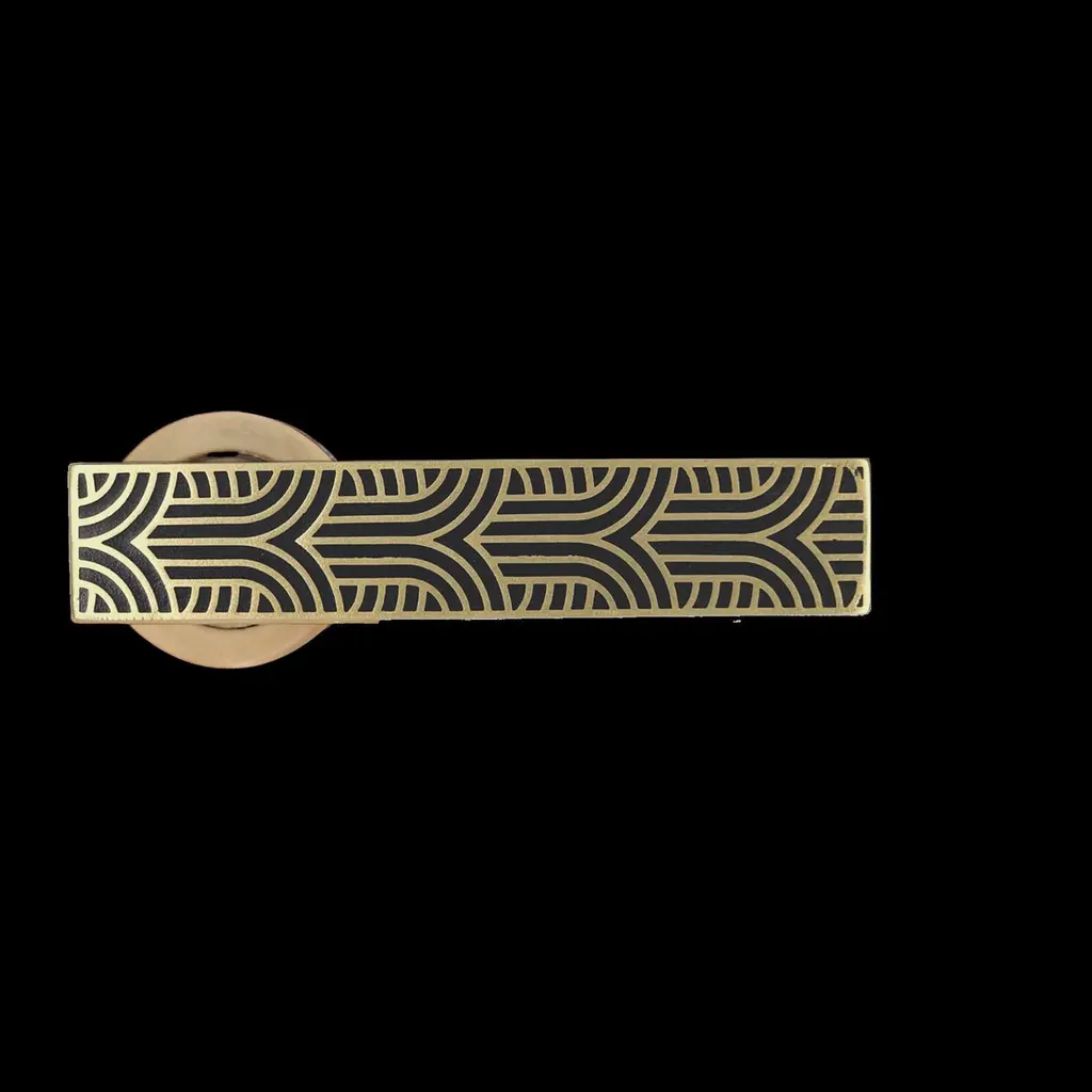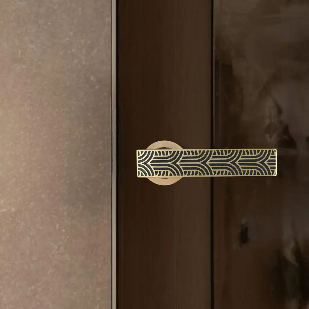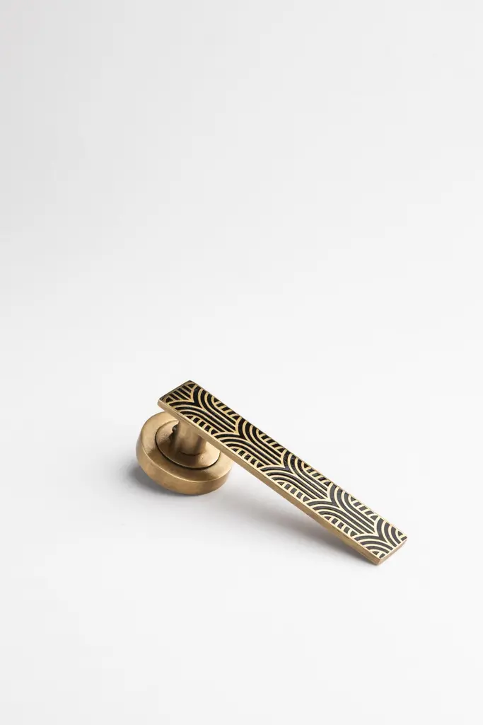 Use: IndoorThis solid brass lever handle is crafted entirely by hand in our workshop and draws inspiration from the graphic language of Art Deco design. The engraved surface features a rhythmic geometric motif enhanced by a striking contrast between the aged gold patina of the brass and the black resin inlaid into the recessed areas.The pattern, composed of curved and linear elements, creates a visual rhythm typical of the Art Deco aesthetic. Each handle is shaped and finished by hand, resulting in subtle variations that give each piece its own identity.Designed for mounting on a round rose, this lever handle suits both residential and hospitality settings, combining visual sophistication with practical functionality. The interplay between engraved depth and metallic sheen offers a refined surface texture that highlights both craftsmanship and material.note: Differences from the sample/photo provided should not be considered manufacturing defects, but rather a characteristic of the manual process, which may result in variations in color and uniformity.Brass is a living material that gradually develops a patina over the years.