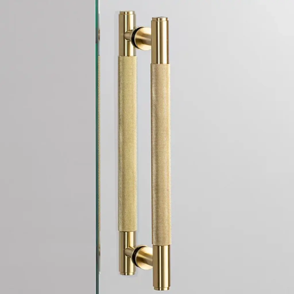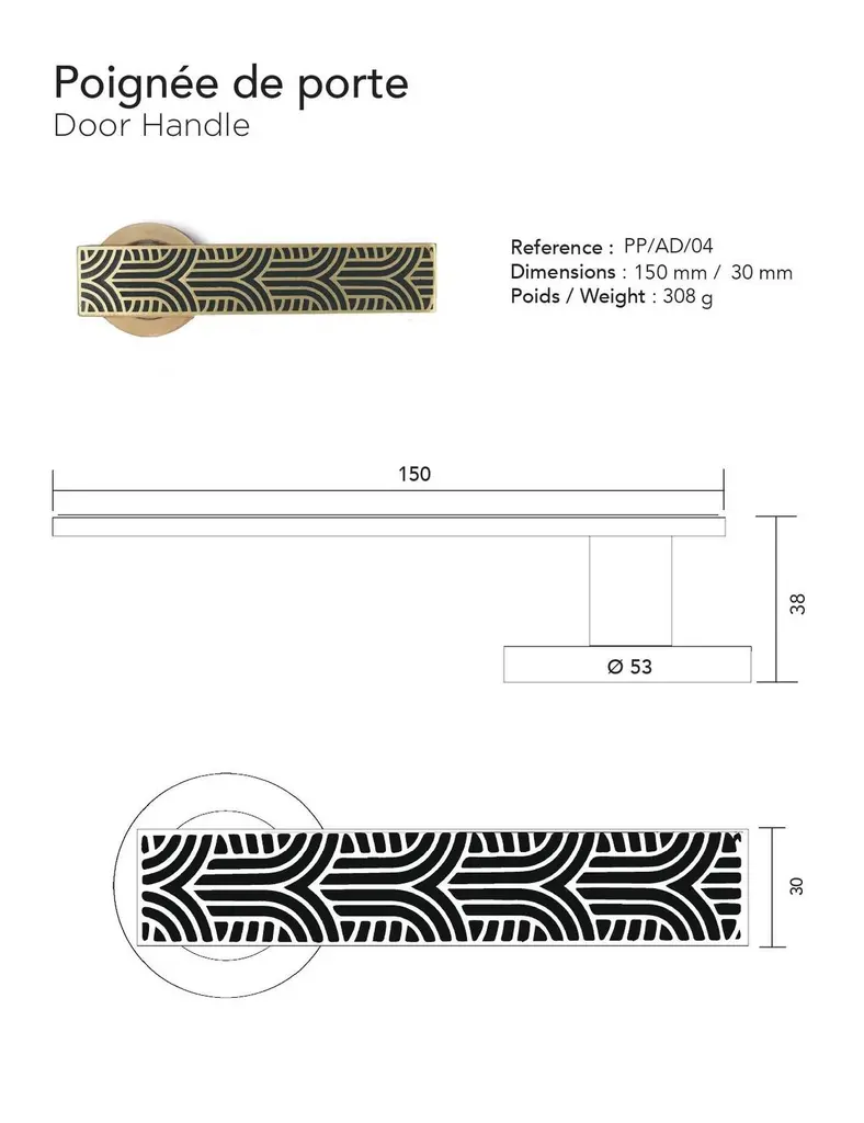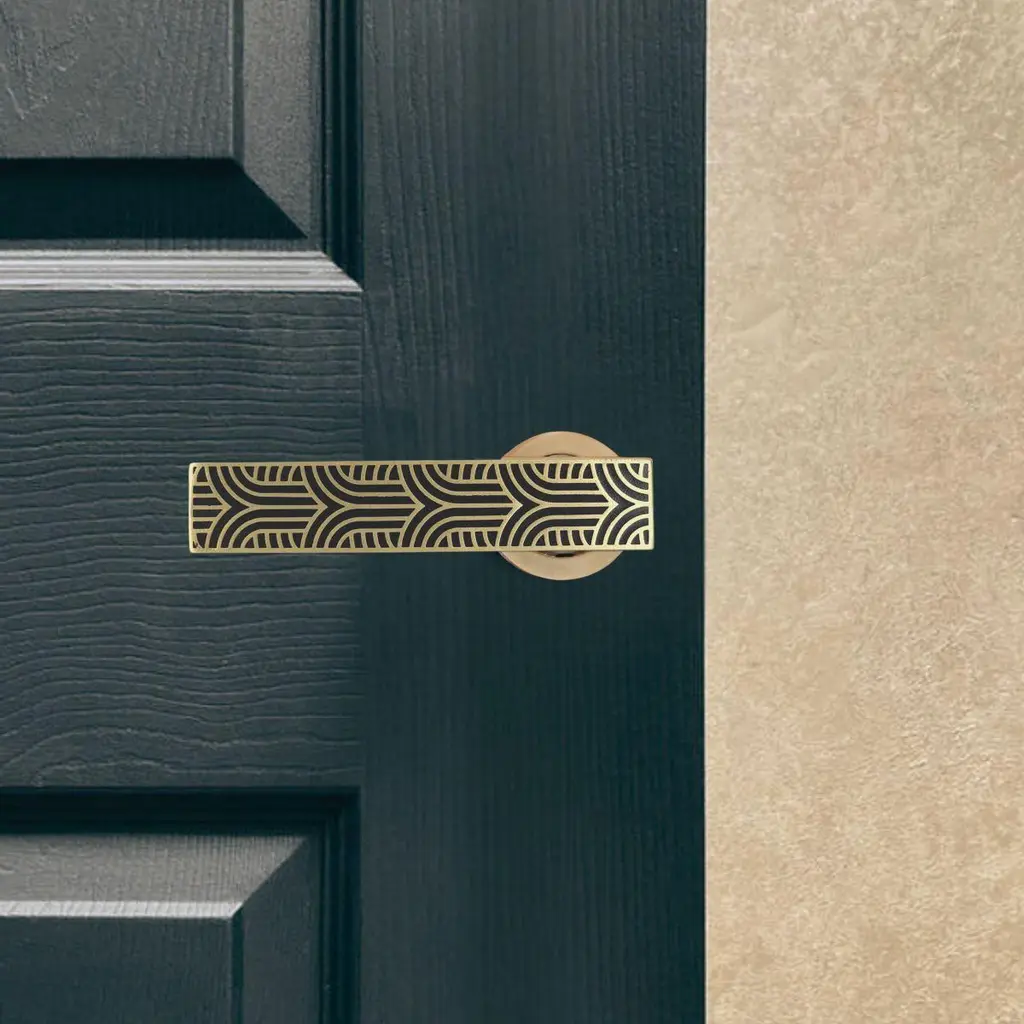 Use: IndoorThis solid brass lever handle is crafted entirely by hand in our workshop and draws inspiration from the graphic language of Art Deco design. The engraved surface features a rhythmic geometric motif enhanced by a striking contrast between the aged gold patina of the brass and the black resin inlaid into the recessed areas.The pattern, composed of curved and linear elements, creates a visual rhythm typical of the Art Deco aesthetic. Each handle is shaped and finished by hand, resulting in subtle variations that give each piece its own identity.Designed for mounting on a round rose, this lever handle suits both residential and hospitality settings, combining visual sophistication with practical functionality. The interplay between engraved depth and metallic sheen offers a refined surface texture that highlights both craftsmanship and material.note: Differences from the sample/photo provided should not be considered manufacturing defects, but rather a characteristic of the manual process, which may result in variations in color and uniformity.Brass is a living material that gradually develops a patina over the years.