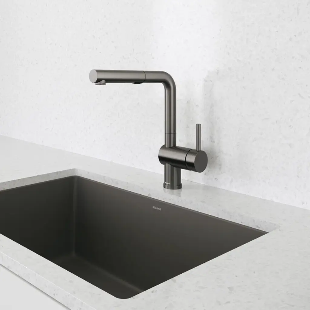 A beautifully-designed kitchen deserves an equally beautiful faucet. The LINUS Low-Arc Pull-Out Kitchen Faucet features a sleek, low-profile design, perfect for contemporary kitchen designs or kitchen workspaces with upper cabinets that have limited overhead clearance. Exclusive to BLANCO, the LINUS features color-coordinated finishes to match beautifully with the full spectrum of SILGRANIT sink colors. Matching your kitchen sink with a color-coordinated faucet allows you to breathe new life into your kitchen without having a costly remodel. The bold, angular design of the LINUS will make your kitchen workspace stand out from the rest.