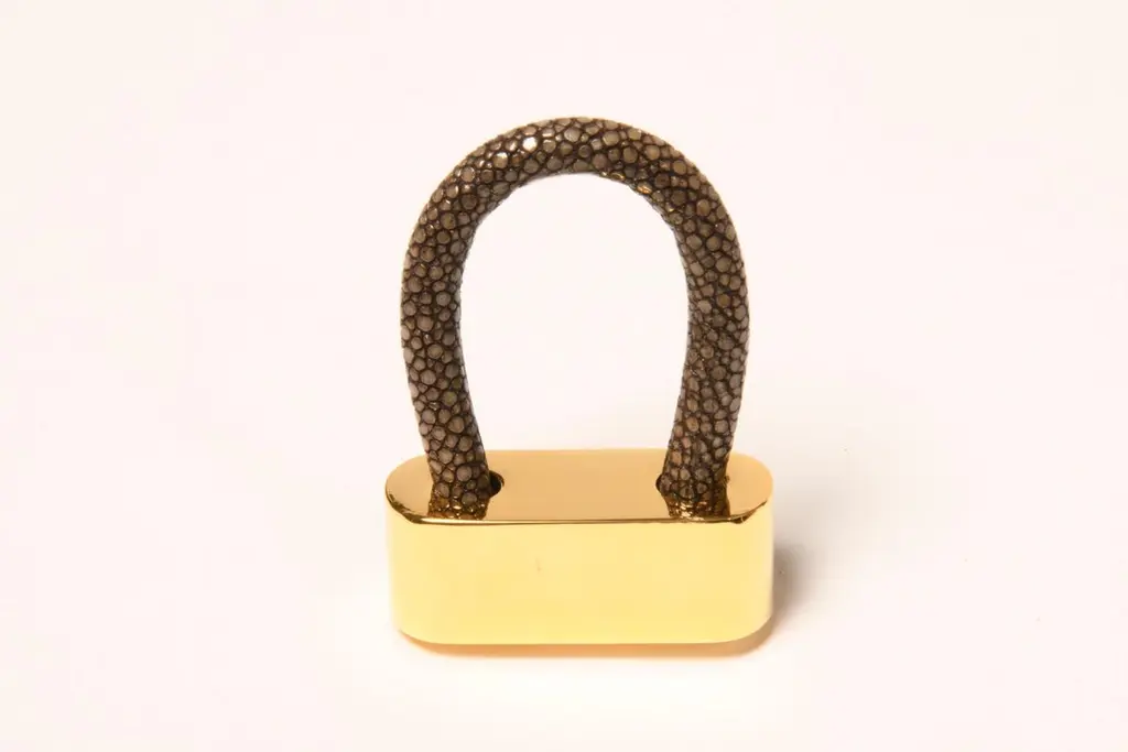 Door & drawer pull handleArtisanal architectural elements that privilege the sense of touch. Made with brass, metal precision pieces cnc turned that are hand finished using unique leathers as saddle, stingray, ostrich, eel, snake, crocodile or shark. Please consult if interested in any other type of leather.Our pieces give an exclusive sense to every project, pieces that may not be seen at first glance that will add value to every high-end home when discovered.Designs that want to reach to a wider type of styles, from contemporary spaces to timeless classic projects. Metal parts made at our facilities in Spain and leather work made by local artisans. Different dimensions and finishes available, please consult. Every piece is custom made so alterations are available.Even all our leathers have strictly permitted sourcing origins, some destinations may have local trade restrictions so, in case of doubt.