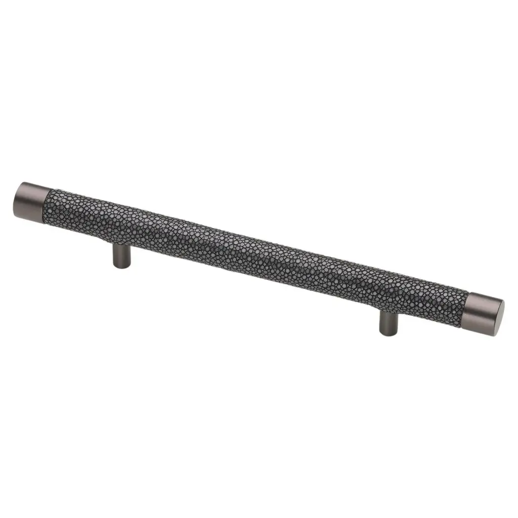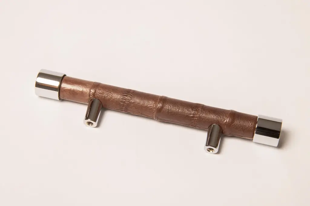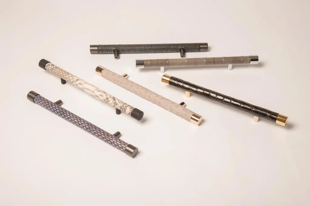 Door & drawer pull handleArtisanal architectural elements that privilege the sense of touch. Made with brass, metal precision pieces cnc turned that are hand finished using unique leathers as saddle, stingray, ostrich, eel, snake, crocodile or shark. Please consult if interested in any other type of leather.Our pieces give an exclusive sense to every project, pieces that may not be seen at first glance that will add value to every high-end home when discovered.Designs that want to reach to a wider type of styles, from contemporary spaces to timeless classic projects. Metal parts made at our facilities in Spain and leather work made by local artisans. Different dimensions and finishes available. Three width, Large: 12 cm - 8 1/3 in, Medium: 14 cm - 5 1/2 in, Small: 8 cm - 3 1/6 inches. Even all our leathers have strictly permitted sourcing origins, some destinations may have local trade restrictions so, in case of doubt.
