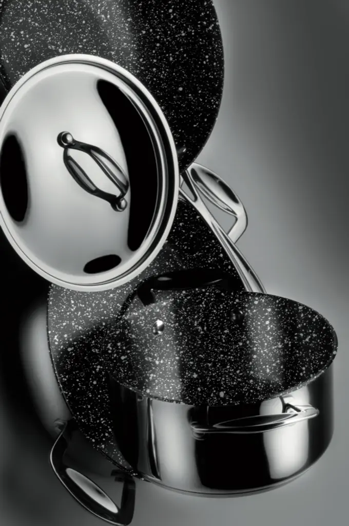 Using the most sophisticated technologies, we created a new pots and pans collection that respects the nature and our planet. The goal to reach the highest thermal performances in the shortest time without burning the food is the core of our project. With the GLAMOUR STONE cookware we can devote ourselves to our passion: our love for the healthy and easy cousine that saves time and energy without affecting the flavours and the nutritional properties of the foods we cook. 18/10 Stainless Steel Body and handle, Eterna Non-Stick triple layer coating, Resistant to metail utensils, Pollution Free, Aluminium Core for even heat distribution, Suitable for all cooking surfaces including induction, Easy to clean , Dishwasher safe, Oven Safe, PFOA-Free. The internal ETERNA® non-sticking coating guarantees the best performances. Strongly repels water and grease for the easiest cleaning ever. Lasts 3 times longer in the Accelerated Cooking Test. Has 10 times the Dry-Egg release of the nearest competitive coating. It gives longer nonstick life than anything we have ever tested.