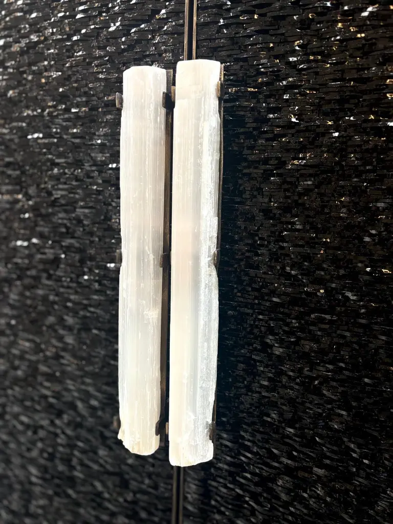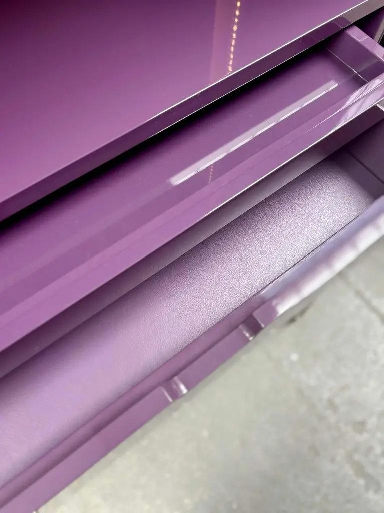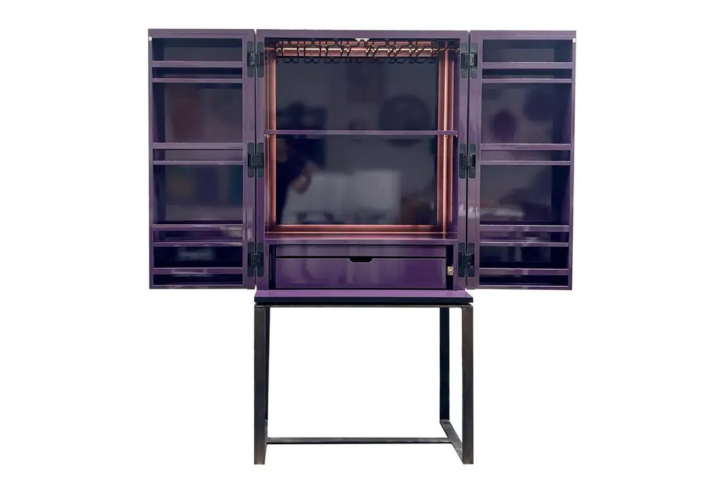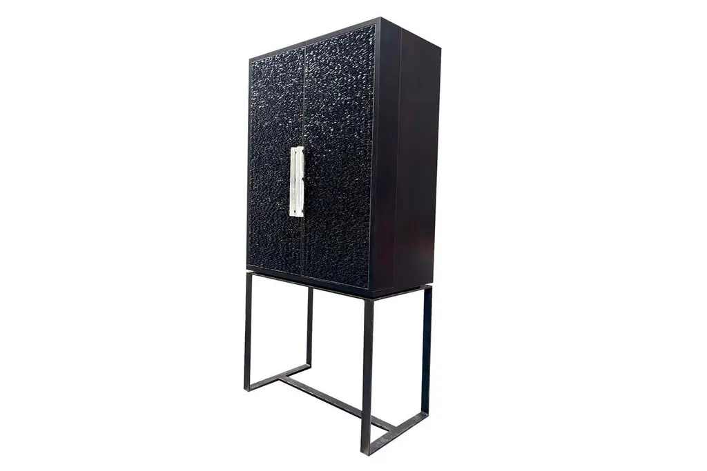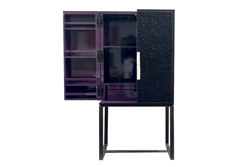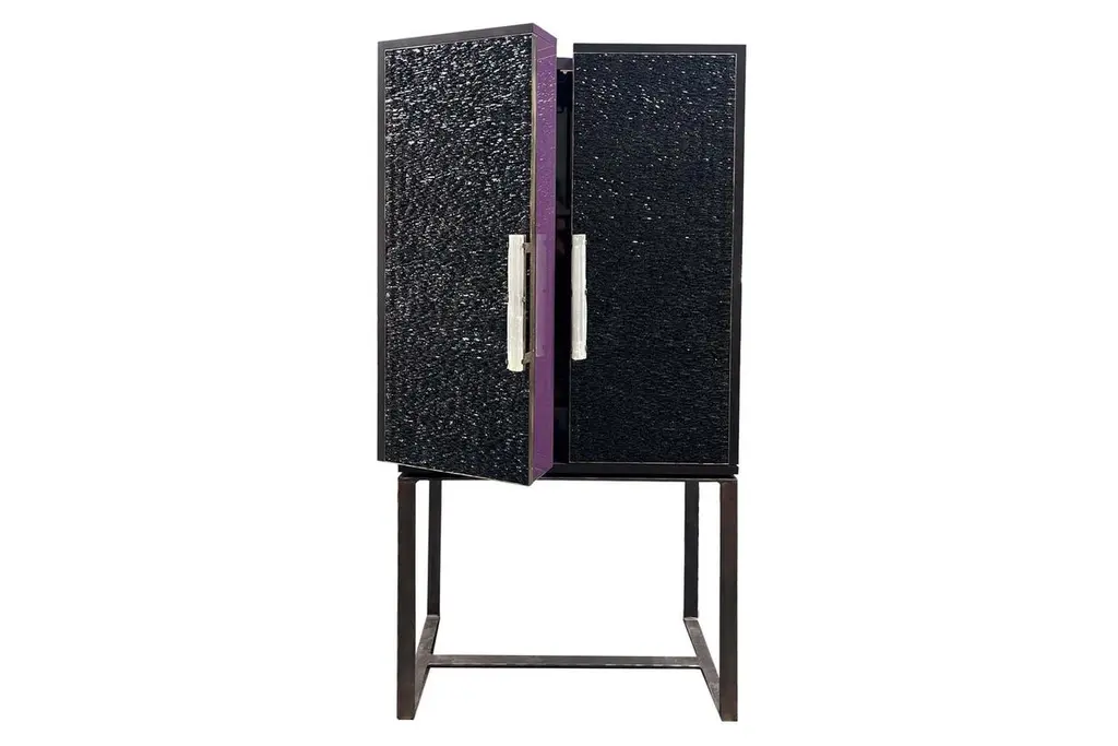 This Modern Mosaic Dry Bar Cabinet with Selenite Handles and 180-Degree Opening By Ercole Home stands on a hand-hammered Chelsea Style base with Bronze Finish. The wood is in a dark brown Maple, and the interior entirely in a custom royal purple polisehd lacquer finish. .The two doors are covered by hand-cut glass black Mosaic, framed with hand-hammered metal. and feature 2 Selenite Handles. Doors open 180 degrees to reveal shelves. The interior has a metal glass rack, anadjustable lacquer shelf, interior lighting, a touch-latch tray lined with glass, and a drawer lined with leather. Available in custom sizes and finishes.