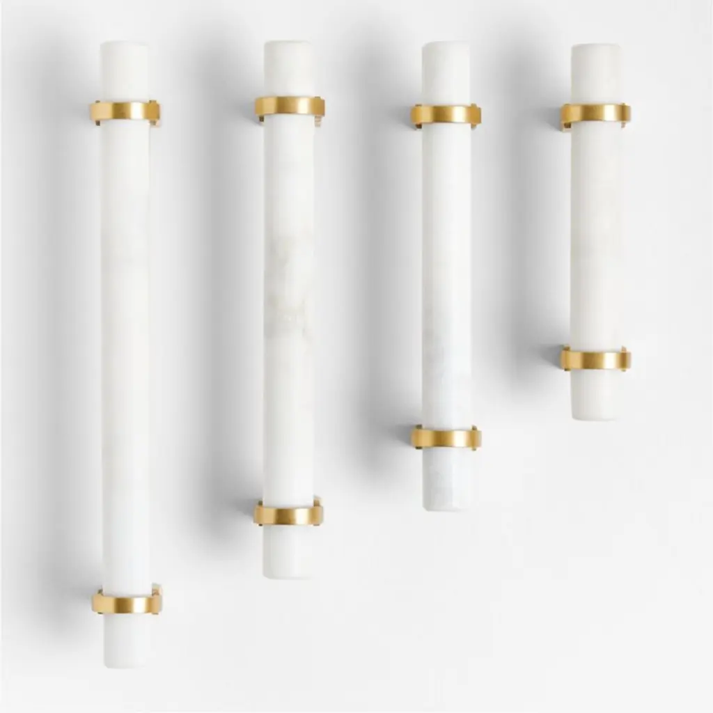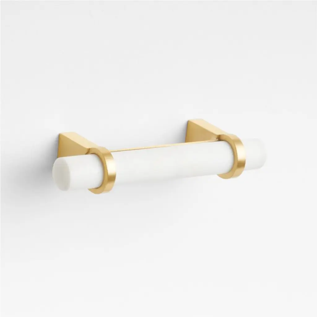 Sometimes it's the small things that pull a room together. That's why we've designed a hardware collection with modern silhouettes, clean lines and a touch of tradition to give your kitchen or bath that perfect finishing touch. Showcasing naturally beautiful white marble, our pull elevates a cabinet, dresser or vanity with an eye-catching organic accent. We love the way the brushed brass bracket cradles the slender marble rod, the two materials coming together to create a look that's undeniably glamorous. Our exclusive three-inch bar pull instantly dresses up drawers and doors throughout the home.