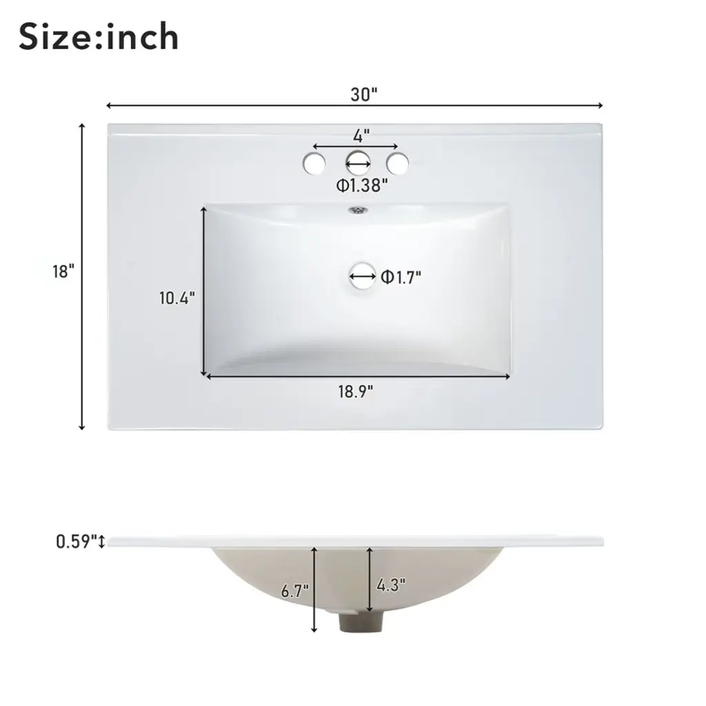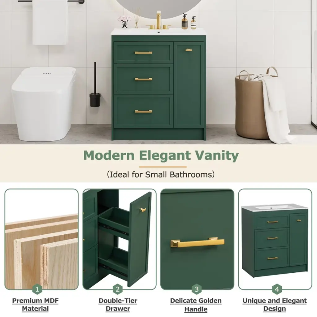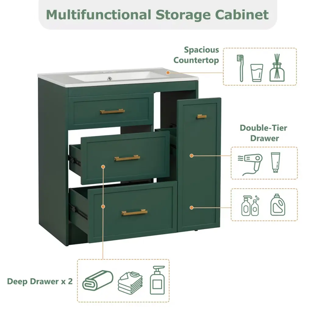 Product Introduction Perfect for small bathrooms, this 30-inch freestanding vanity set features a classic design with modern functionality. Crafted from durable MDF and topped with a smooth ceramic sink, the vanity includes three drawers—one of which is double-layered—for optimized storage. Sleek gold handles elevate the overall aesthetic, making it a stylish yet practical choice. Product Features Compact Yet Spacious – Measuring 30"W x 18.3"D x 34"H, this vanity is ideal for small spaces, offering excellent functionality without taking up too much room. Premium Ceramic Basin – Glossy and stain-resistant, the ceramic sink is easy to clean and adds a refined touch to your bathroom. Overflow Hole Included – Built-in overflow prevents water from spilling over, helping you maintain a dry and safe bathroom space. Durable MDF Frame – The high-quality MDF construction ensures long-lasting stability and performance in daily use. Double-Layer Drawer – Includes one double-layer drawer and two deep drawers to accommodate a wide range of bathroom essentials. Elegant Gold Handles – Long gold zinc alloy handles offer a luxurious look while being durable and corrosion-resistant. Quick Assembly – Comes with easy-to-follow instructions and all hardware needed for a stress-free two-person setup. Timeless Style – The classic silhouette and forest green finish make it a perfect match for both traditional and contemporary bathrooms. Specifications Overall Dimensions: 30"W x 18.3"D x 34"H Sink Dimensions: 30"W x 18.3"D x 6.7"H Vanity Cabinet Dimensions: 29.1"W x 17.2"D x 33.5"H Weight: Total 105.2 lbs (Sink: 31.75 lbs, Cabinet: 73.45 lbs) Weight Capacity: Drawers: 20 lbs each; Overall: 150 lbs Style: Classic Mounting Type: Free-standing Sink Material: Ceramic Cabinet Material: MDF Handle Material: Zinc Alloy Finish Type: Painted Finish Sink Type: Undermount / Drop-in Sink Shape: Rectangular Faucet Mount Type: 4" Centerset (Faucet Not Included) Overflow Hole: Yes Vanity Top Edge Type: Flat, Edge Thickness: 0.6" Number of Drawers: 3 (includes 1 double-layer drawer) Assembly: Required Note This vanity set comes in one package and includes a ceramic sink, cabinet, hardware, and paper instruction manual. Faucet and drain are not included. Assembly is required and best completed by two people for safety and convenience.