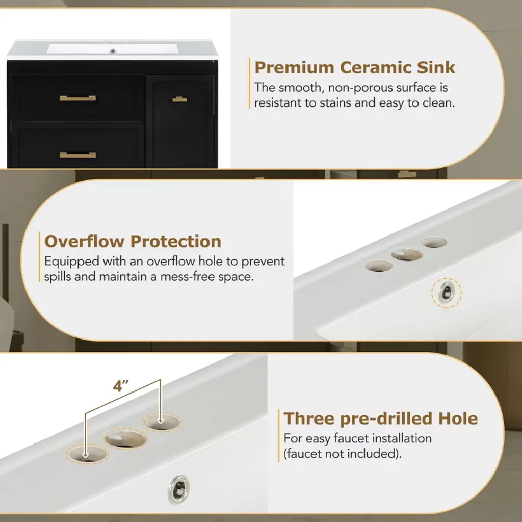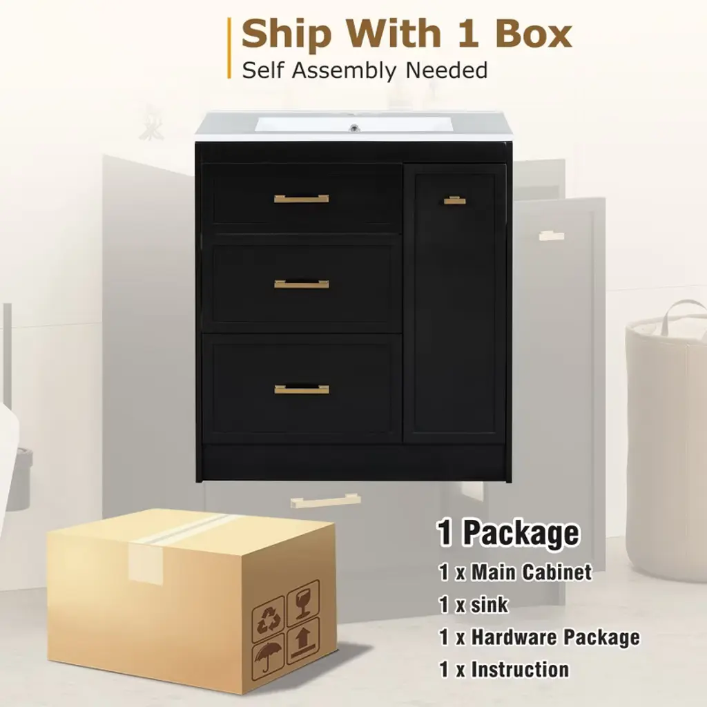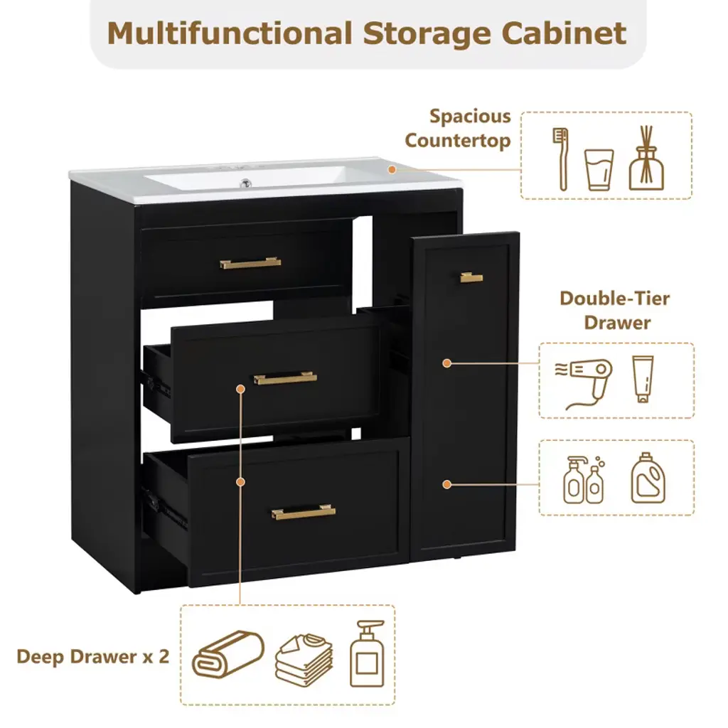 Mshliw 30" Classic Bathroom Vanity With Ceramic Sink, 3 Drawers Including Double-layer, Gold Handles, For Small Spaces(black)
