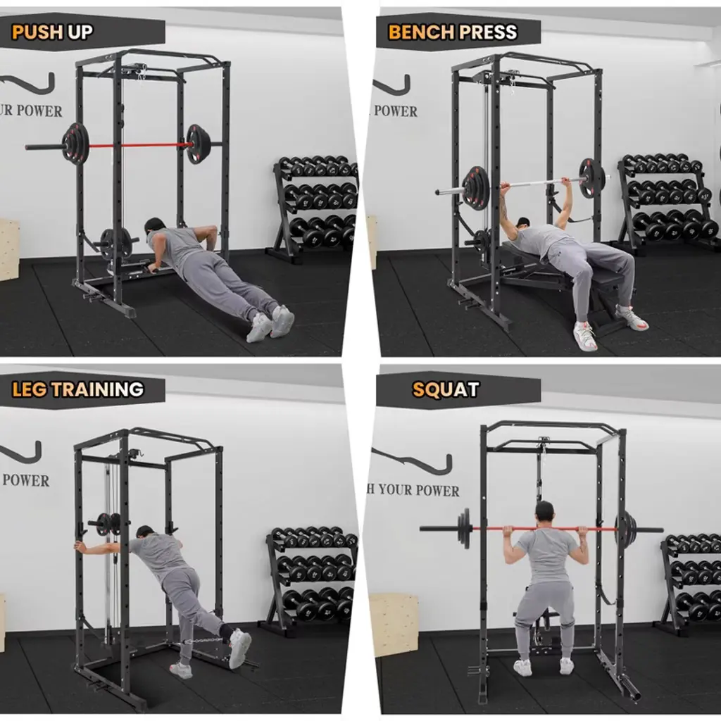 Multi-functional Power Rack , With Cable Pulley System And J-hooks, With Dip Bars And Landmine Attachment, Weight Cage For Home Gym Equipment