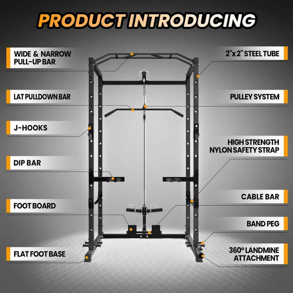 ENDLESS TRAINING POSSIBILITIES: Every home or garage gym should have a Power Cage. Power rack not only can be performed on the mainframe including squat, bench press, pull up /chin up, dip station, push up etc. It is also equipped with upper and lower pulley system for lat pulls down, seated rowing. You can make 11-level height adjustment for the j-hooks and safety bar, and you can also adjust the dip handles to the bottom hole for push up training. When you training whith the pulley system, you FULLY EQUIPPED FOR WORKOUTS: No need to buy the extra fitness accessories. All come with home gym squat rack. We provides 20 free attachments, 2 Nylon Safety Straps, 2 J hooks, 2 Dip bars, 4 Resistance Band Pegs, a Lat Pull Down Bar, a Cable Bar, a 360 Degree Detachable Landmine, a Ankle Strap, a Tricep Rope, 2 Cable Handles, a Chain and 2 Weight Holder Clips. BUILD WITH GYM QUALITY: This home gym equipment has been built with precise cutting and powder coated finish, features 2" x 2" uprights, which can fit most of the cage accessories attachments on the market. Dimensions: 55" (L) x 61" (W) x 86" (H). Assembled Weight: 165 lbs. After thousands of weight tests, we ensure our machines can safely support 1600 lbs. SPACE EFFICIENT: This cable machine home gym is designed with a large 40-inch walk-in space, enough for squats and bench presses, just 12.1 square feet of floor space, and can be paired with other fitness equipment such as barbells, weight benches, and resistance bands, bring more exercise into your daily life, because your training no opening hours, no route, no stress train, better at home than at gym. SUPER EASY TO INSTALL: We have made detailed instructions manual to help you complete the installation quickly. It is recommended that 2 people to put it together. We ship power cage in 2 packages to minimize potential shipping damage. Please don't worry if they are on different dates. Generally, the interval between receiving the 2 packages will not exceed 3 days. If you have any questions, please feel free to contact our customer service, we are always here to help.