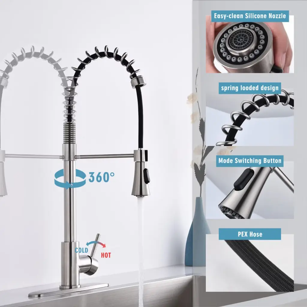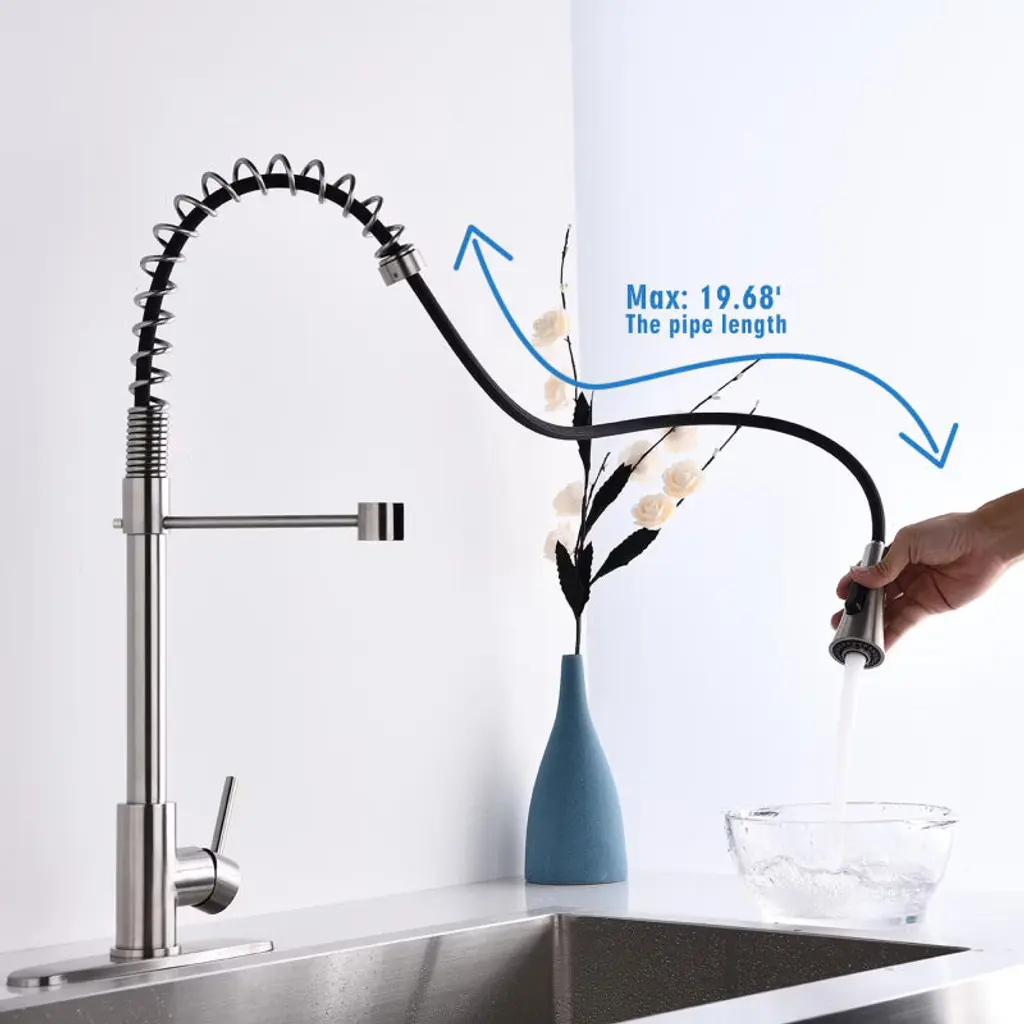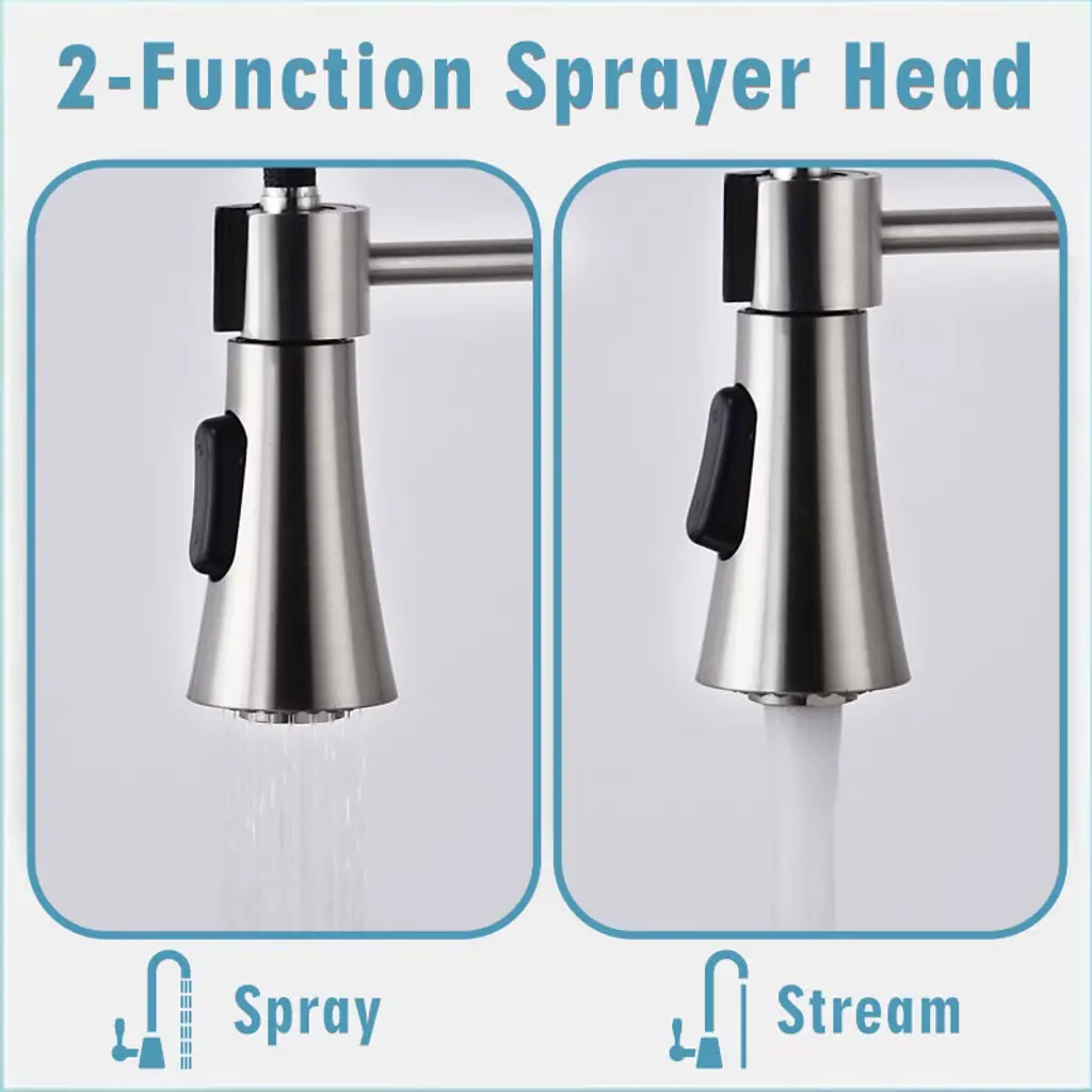 Transform your kitchen with the Munora 23.62-inch high arc pull-out kitchen faucet featuring a sophisticated brushed nickel finish. This commercial-style modern faucet combines exceptional functionality with elegant design, offering a flexible pull-out spray head that bends to your exact needs. The three-function spray system includes stream mode for quick filling, spray mode for efficient rinsing, and pause function to prevent splashing during multitasking. Constructed from durable stainless steel with a corrosion-resistant brushed nickel finish, this faucet maintains its beautiful appearance while resisting fingerprints and water spots. Installation is straightforward with compatibility for both single-hole and three-hole setups, complete with a 10-inch stainless steel deck plate and all necessary hardware. The high-arc spout design provides 23.62 inches of clearance with 360-degree rotation, offering ample space for washing large pots and pans. With dimensions of 8.46 inches in length, 2.00 inches in width, and weighing 6.00 pounds, this single-handle kitchen faucet delivers professional-grade performance perfect for both residential and commercial kitchen environments.