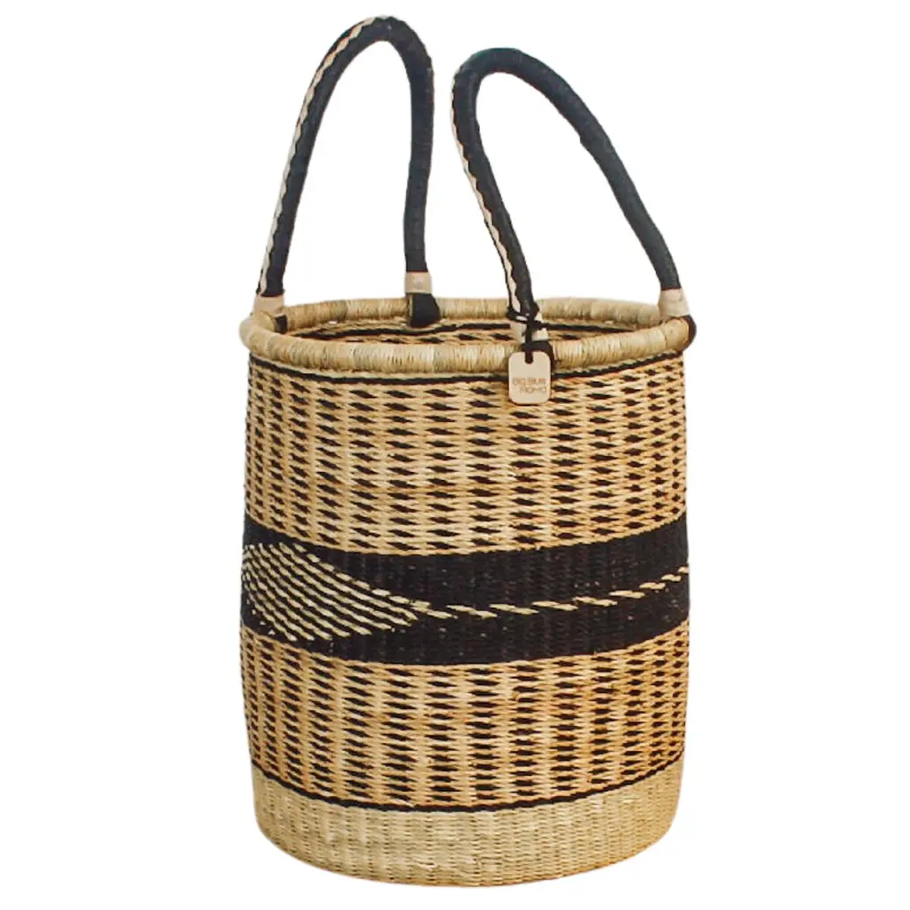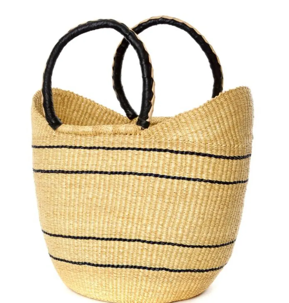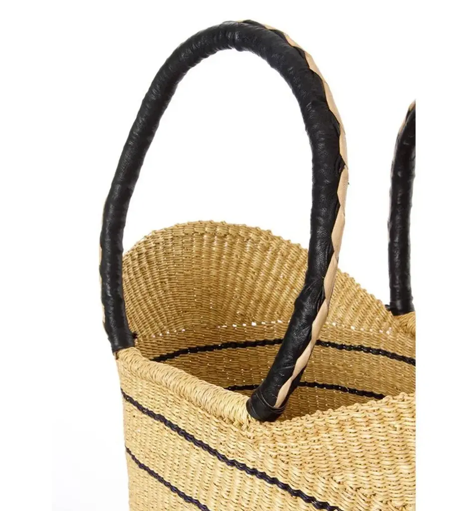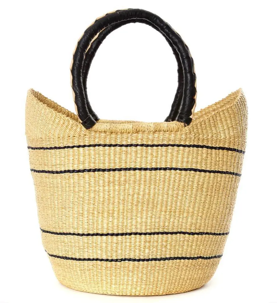 This is handcrafted in Ghana from thick stalks of natural elephant grass, with soft leather handles for added comfort and durability. A popular choice for eco-conscious shopping, these indispensable bags stand the test of time, even with daily use. Can be rinsed and reshaped with cool water as needed. Measures 18"T x 8"W x 16"L. Due to the handmade nature of this tote, slight variations may occur.