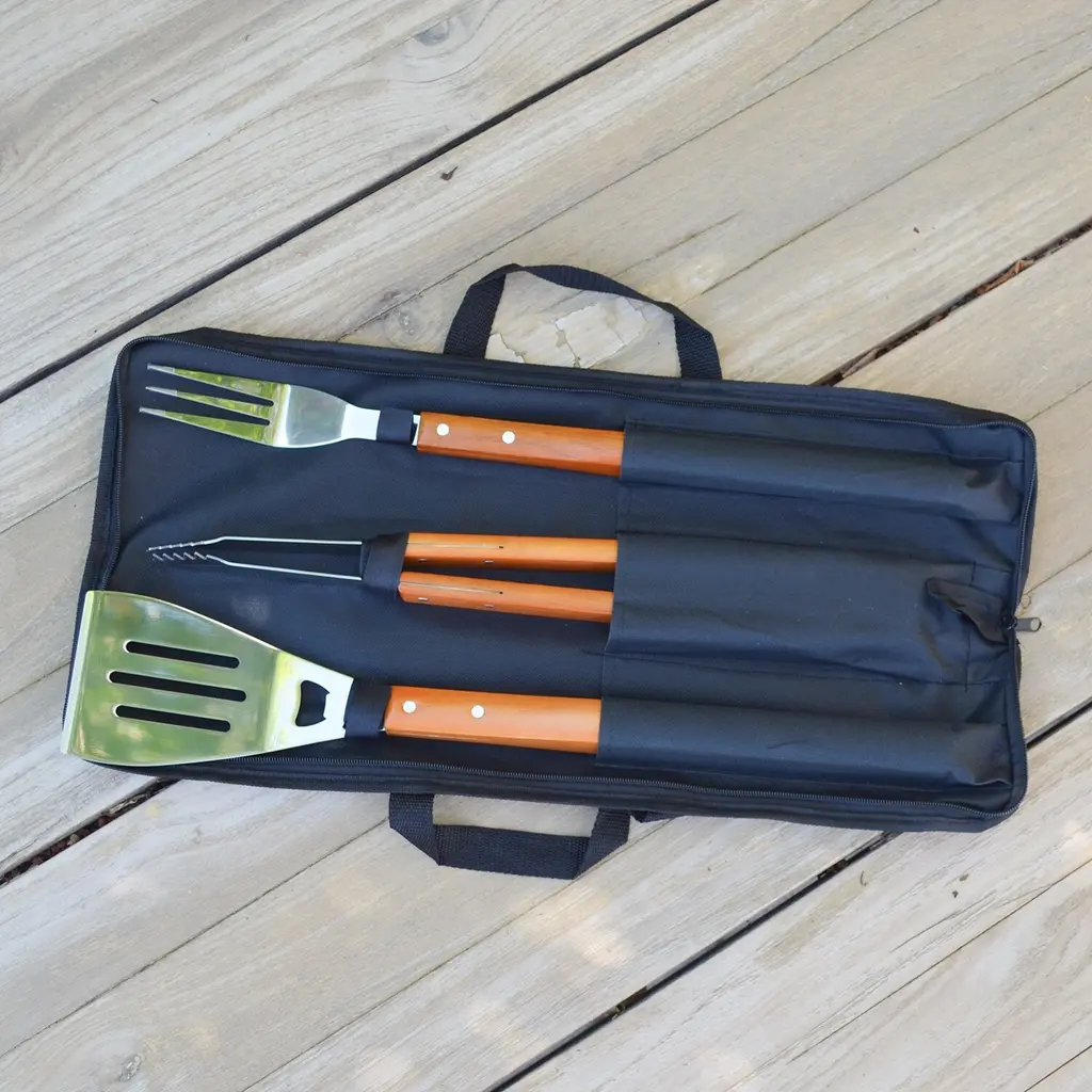 High quality 3 piece stainless steel BBQ tool set including spatula, fork and tongs in a sturdy 600 denier polycanvas case Ideal for the patio - picnics - parking lot parties - camping The cover measures 22 inches wide x 2.5 inches deep x 5 inches high Lifetime warranty