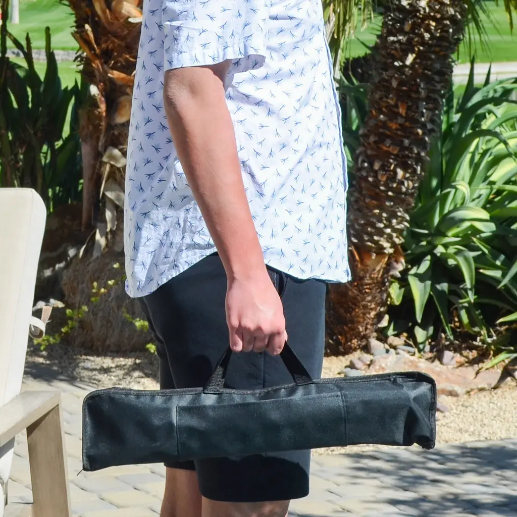 High quality 3 piece stainless steel BBQ tool set including spatula, fork and tongs in a sturdy 600 denier polycanvas case Ideal for the patio - picnics - parking lot parties - camping The cover measures 22 inches wide x 2.5 inches deep x 5 inches high Lifetime warranty