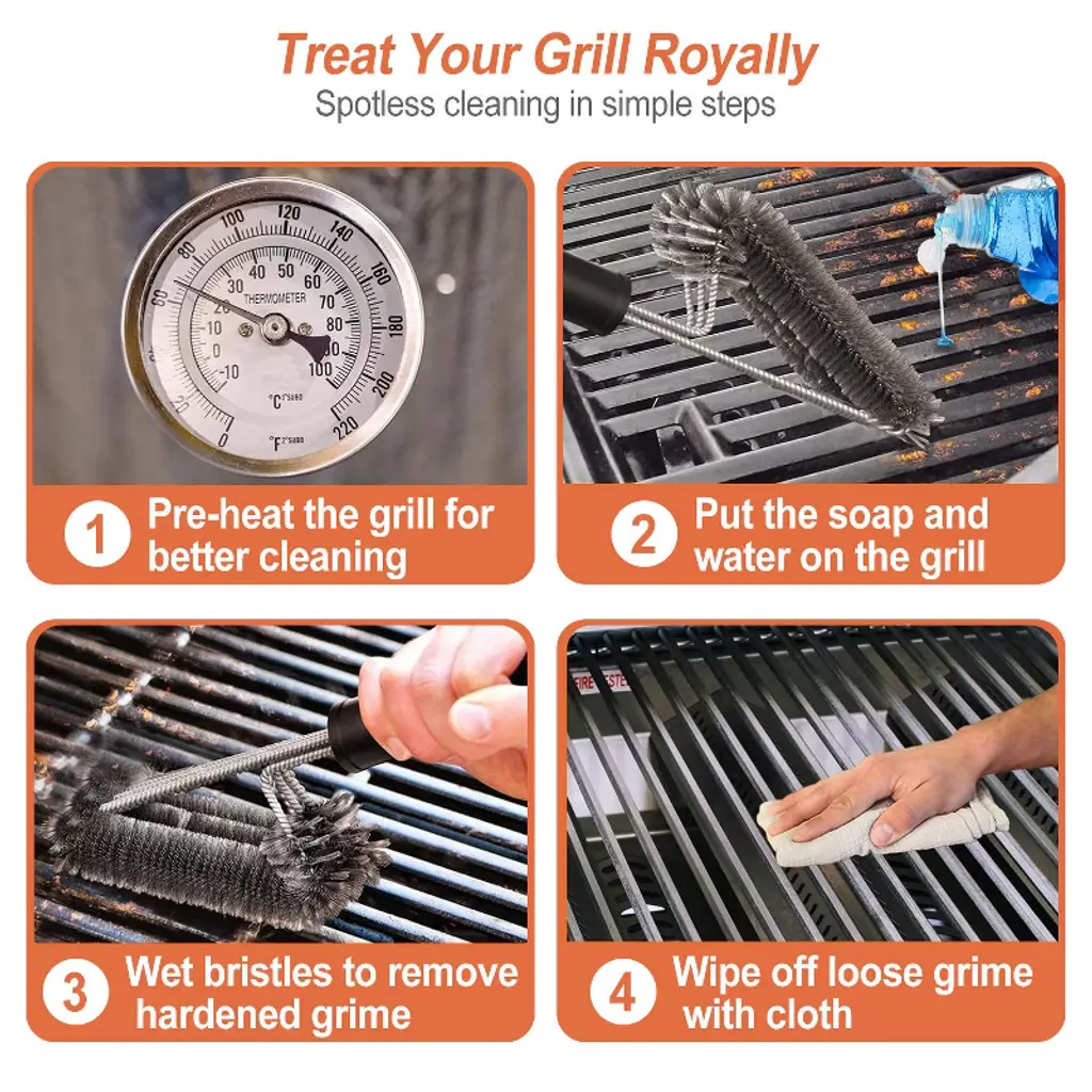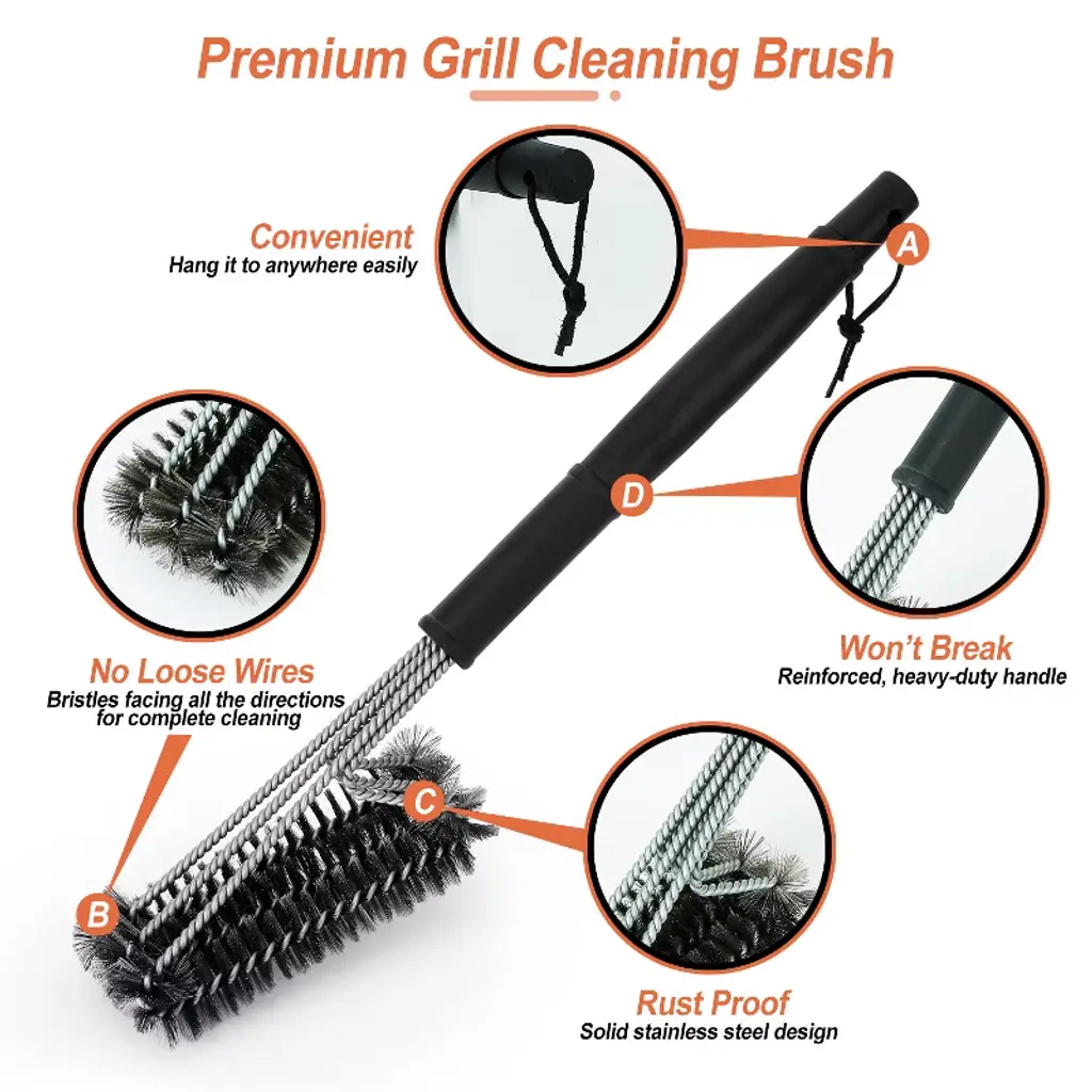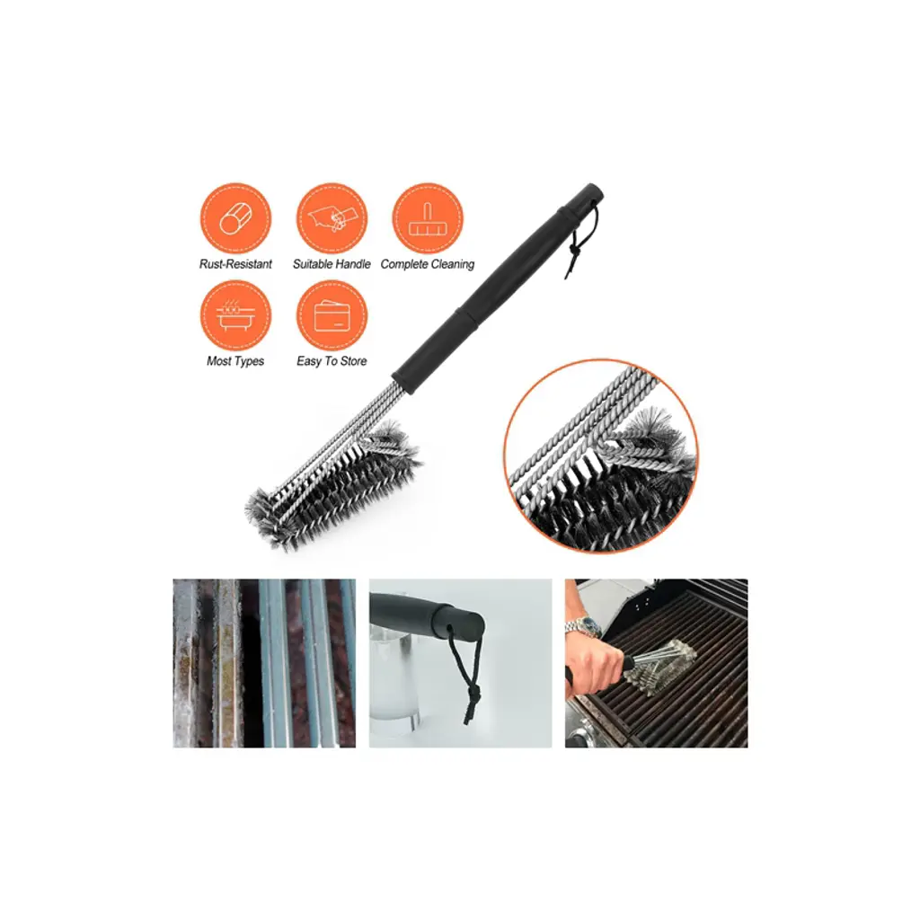 BBQ Grill Cleaning Brush with 18" Ergonomic Handle - Rust-Resistant Stainless Steel & 360° Bristles Keep your grill spotless with this durable BBQ grill cleaning brush. Made from premium stainless steel, this brush is built to resist rust, offering long-lasting performance. Its ergonomic 18-inch handle keeps your hands safely away from the heat while providing full control, making it easy to reach even the hardest spots. Whether you’re using a gas, charcoal, rotisserie, or smoker grill, this brush ensures a thorough clean, leaving your BBQ looking brand new. Key Features: Rust-Resistant Construction: Crafted from high-quality stainless steel and equipped with a sturdy PP handle, this brush is designed for durability and long-term use. Ergonomic 18" Handle: The handle offers a comfortable grip, allowing you to clean with ease while keeping your hands at a safe distance from the heat. Perfect for reaching tough spots without straining. 360° Bristle Design: The brush features bristles on all sides to clean the top, bottom, and sides of your grill grates, ensuring no area is missed. Versatile Compatibility: Safe for use on most grill types including porcelain, ceramic, infrared, Weber, Char-Broil, and more. Easy Storage: Includes a rope for hanging the brush, allowing for convenient storage in your kitchen or grilling area. You can also store it in a box when not in use. Easy to Clean: Simply rinse with dish soap and water, then hang to air dry for a clean brush ready for your next use. Specifications: Material: 201 Stainless Steel, Galvanized Iron Wire, PP Item Size: 45.7 x 7 x 8cm (18 x 2.76 x 3.15 inches) Brush Size: 16 x 7 x 8cm (6.3 x 2.76 x 3.15 inches) Weight: 350g (0.77lbs) Package Size: 53 x 16 x 8cm (20.9 x 6.3 x 3.15 inches) Package Weight: 383g (0.84lbs) Package Includes: 1 x BBQ Grill Cleaning Brush