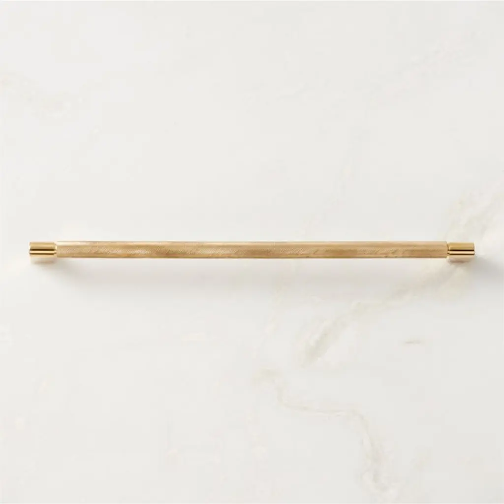 Designed by Barcelona-based Mermelada Estudio, textured brass handle brings a modern, industrial aesthetic to cabinet doors. Pair with the Nicolo knob for a cohesive look. CB2 exclusive.
