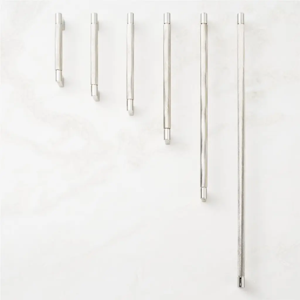 Designed by Barcelona-based Mermelada Estudio, textured brass handle brings a modern, industrial aesthetic to cabinet doors. Pair with the Nicolo knob for a cohesive look. CB2 exclusive.