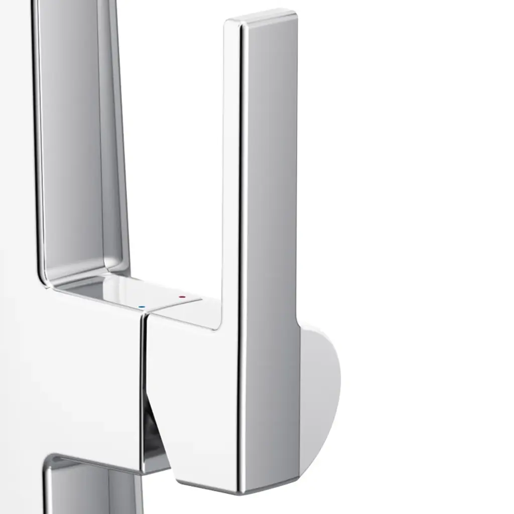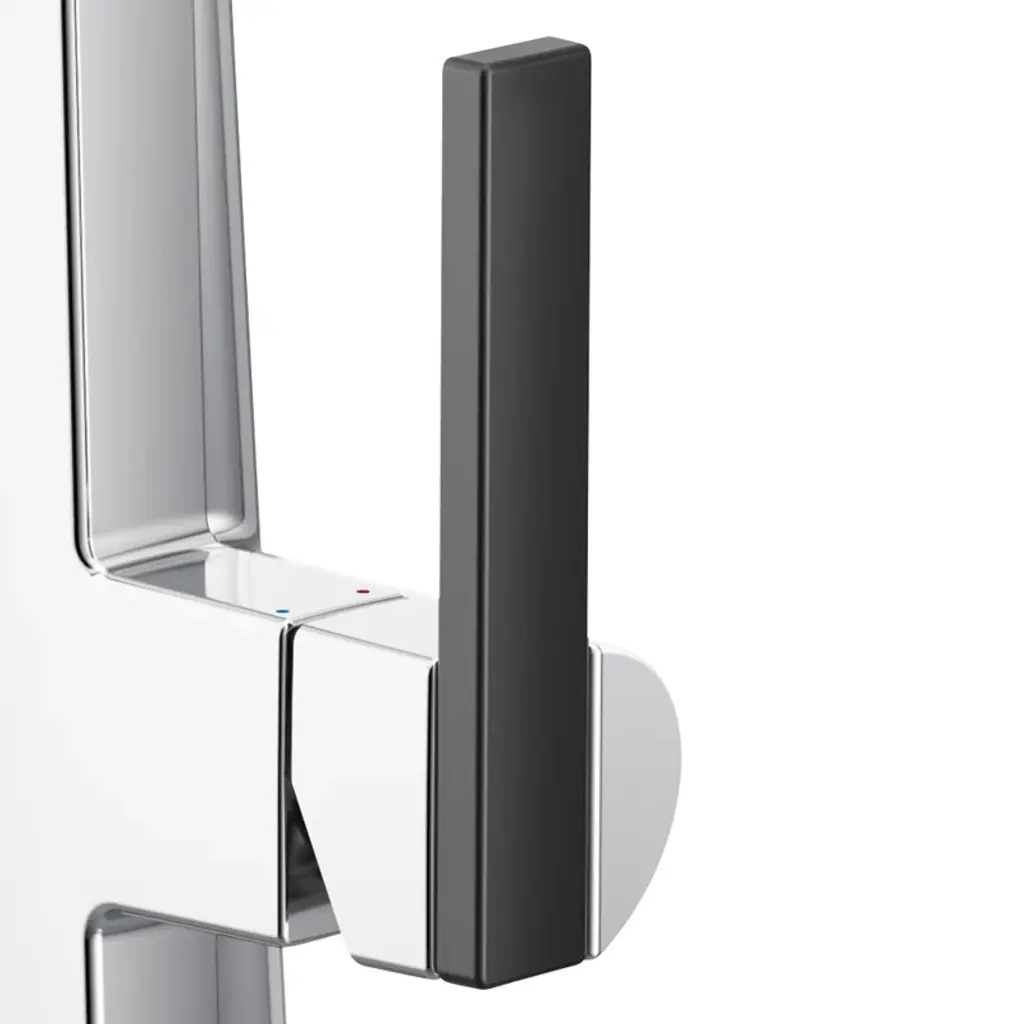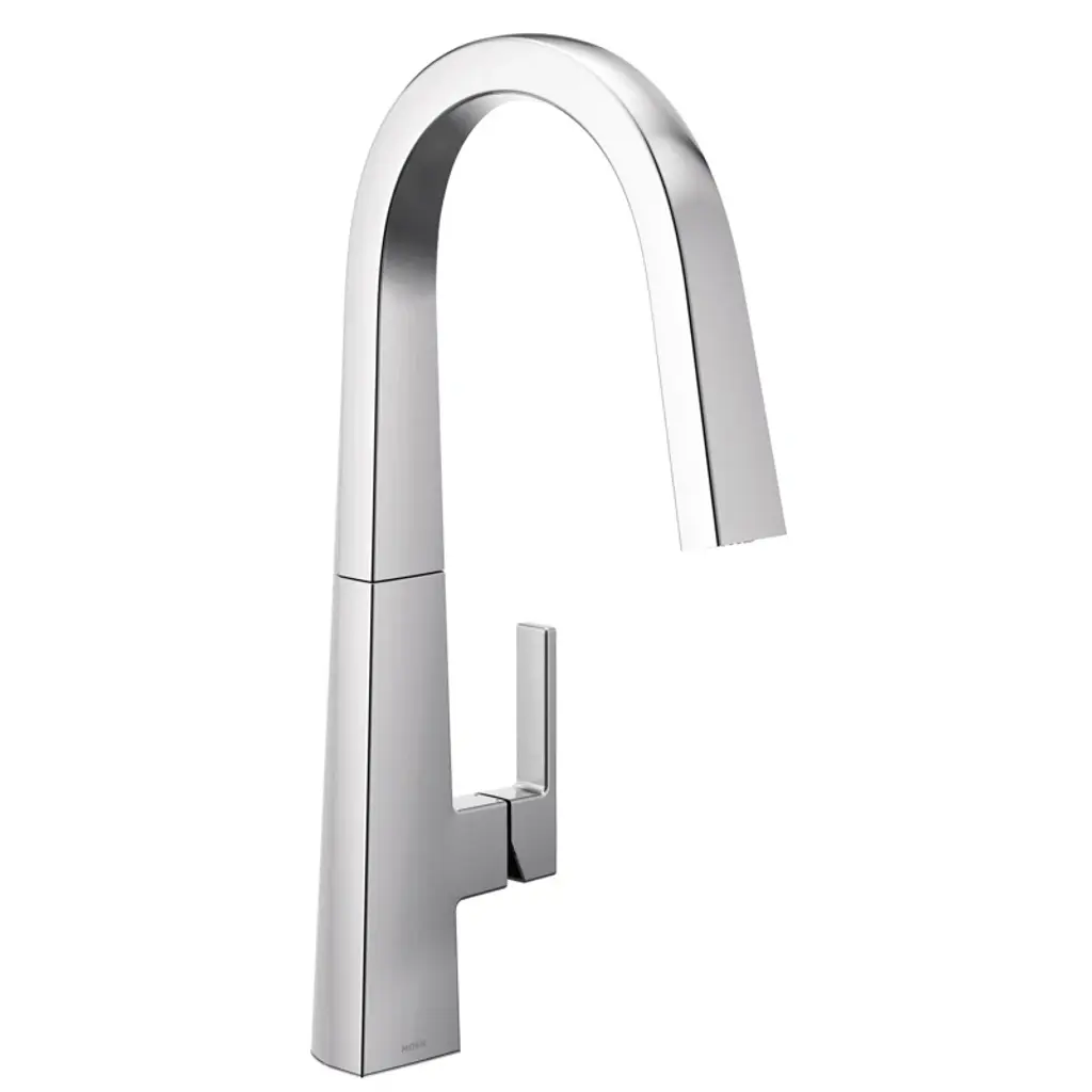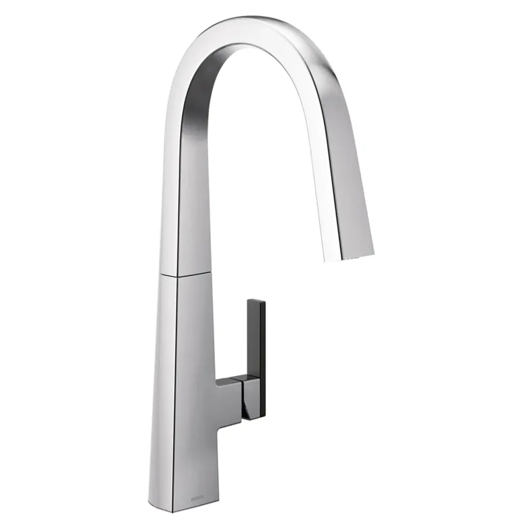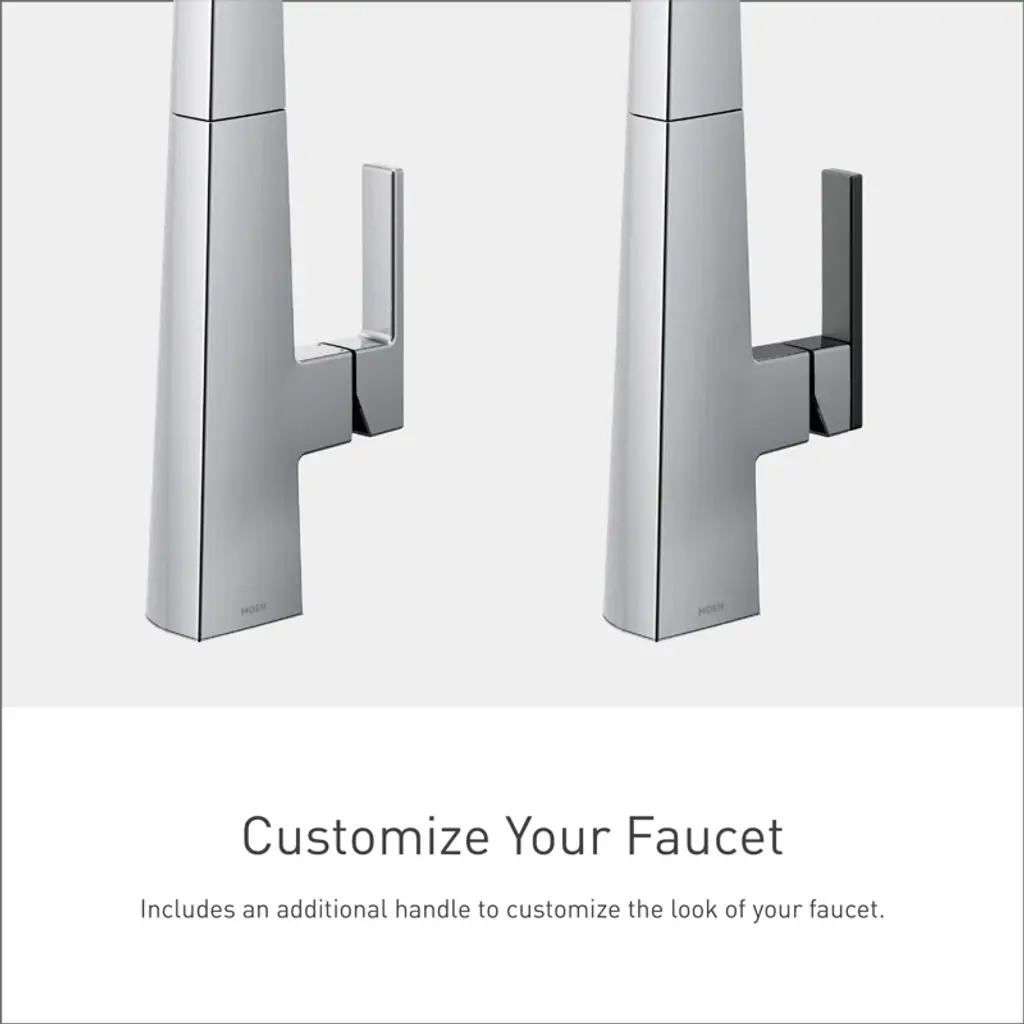 The new kitchen faucet collection features a unique recessed pulldown wand for a smooth, continuous aesthetic. The architectural stature balances perfectly with a soft modern style. For customization, a secondary finish handle option is included in the box.