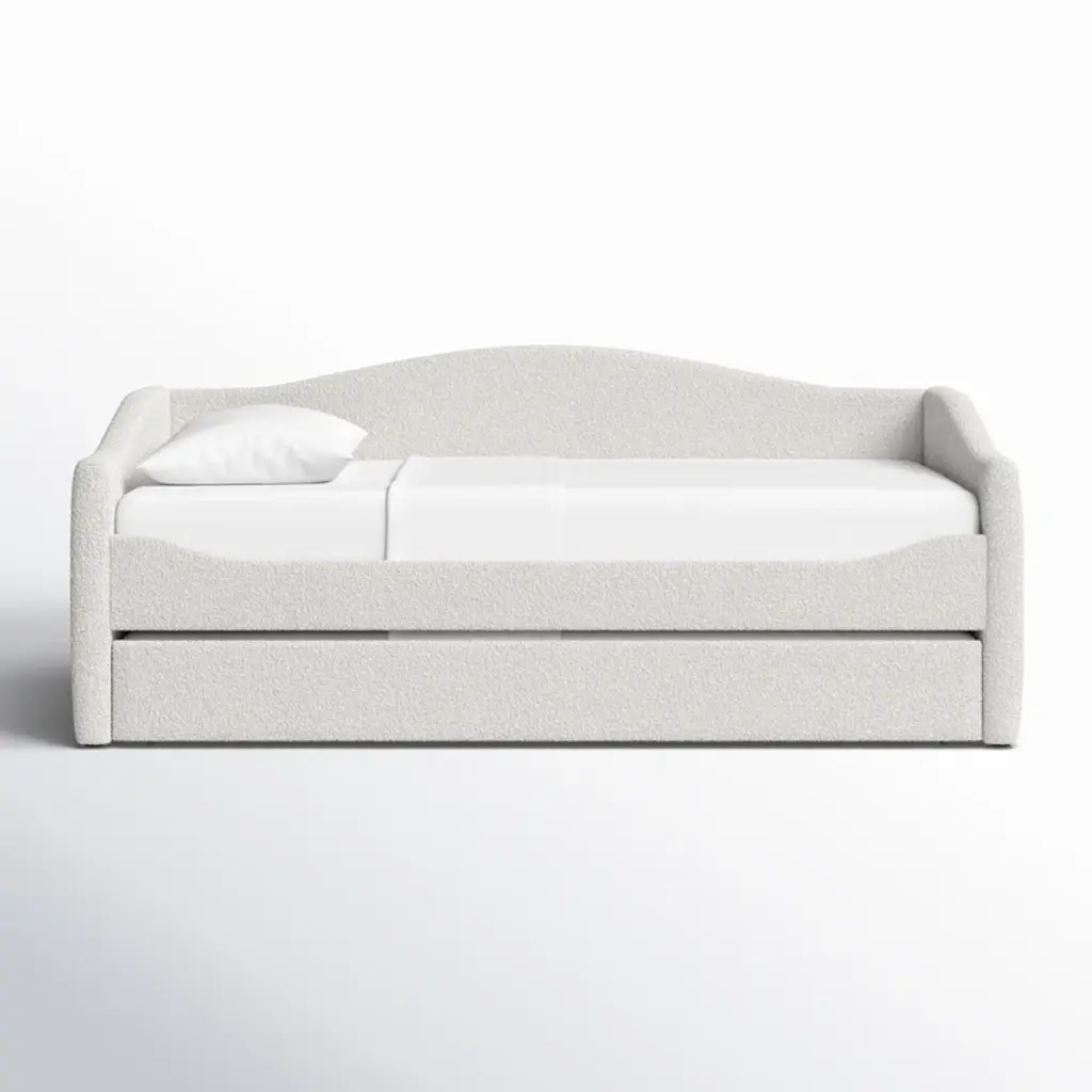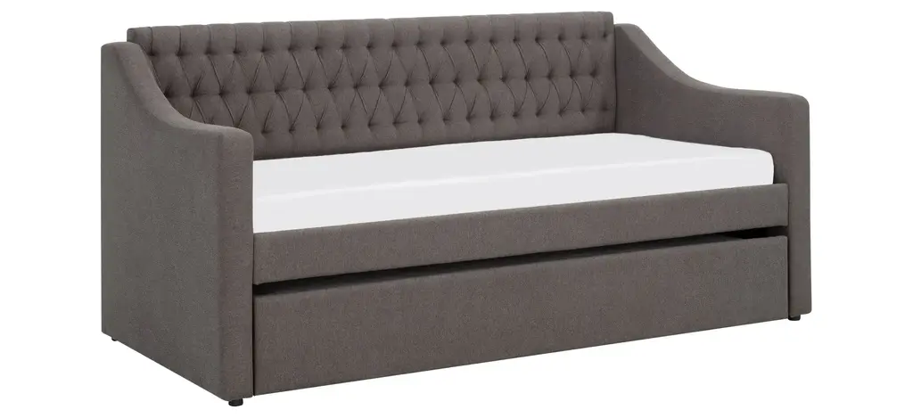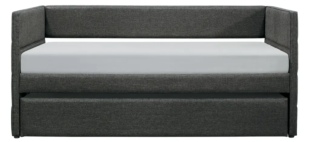 The Noa Light Grey Twin Upholstered Daybed with Pull-Out Trundle is a perfect blend of modern style and casual comfort. Its sleek design and textured fabric upholstery make it a versatile addition to any room, providing both seating and sleeping options. The pull-out trundle bed with casters offers convenient extra sleeping space, ideal for guests or sleepovers.