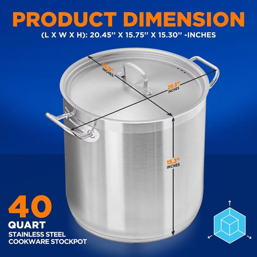 Nutrichef Stainless Steel Cookware Stockpot, 40 Quart Heavy Duty Induction Soup Pot With Stainless Steel Lid And Strong Riveted Handles