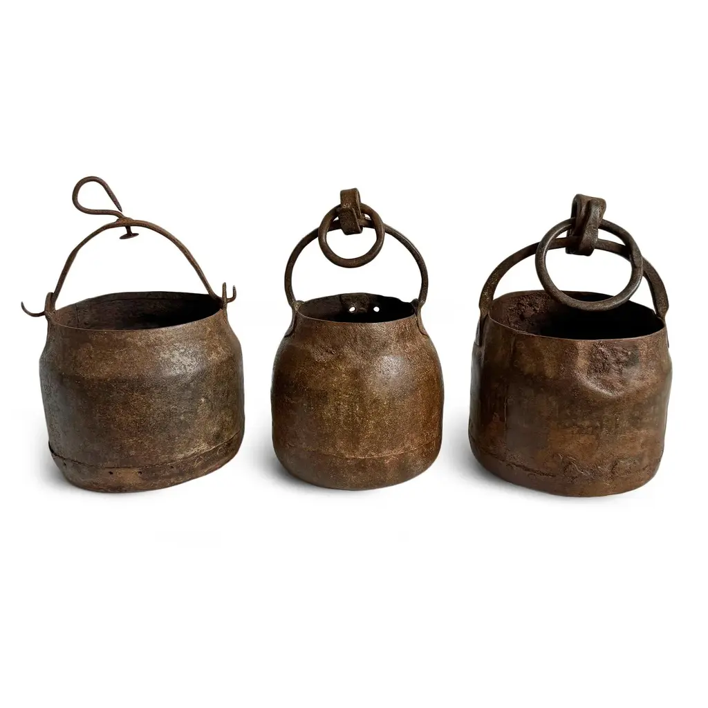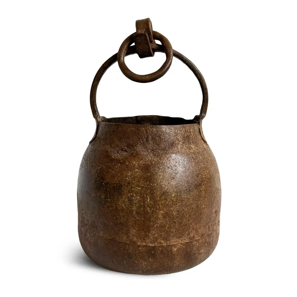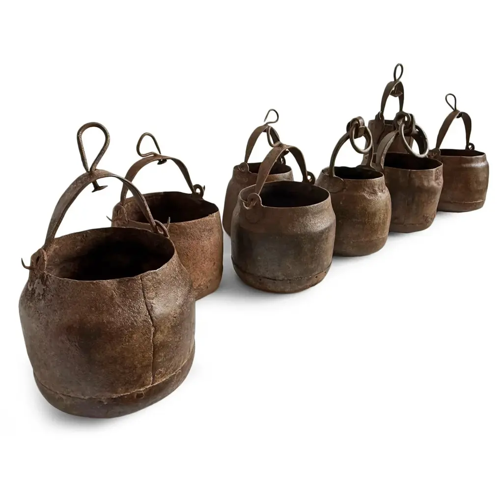 Old antique iron rivet pot with handle. Original rusted aged finish and each unique in natural patina. Sizes vary slightly. Each is sold individually. Great for display or use indoors or out.