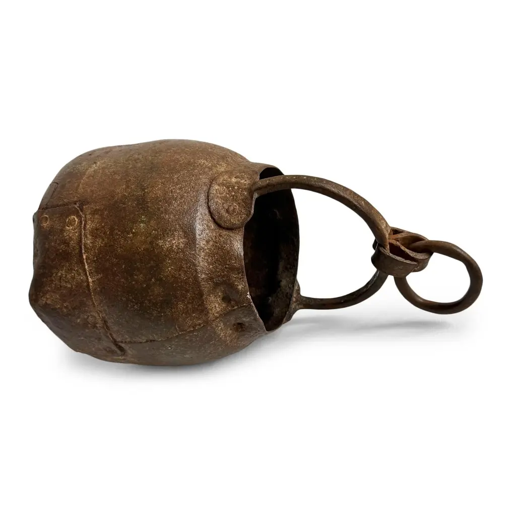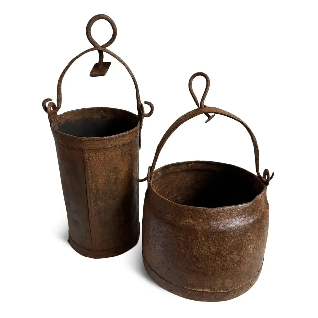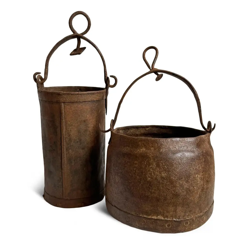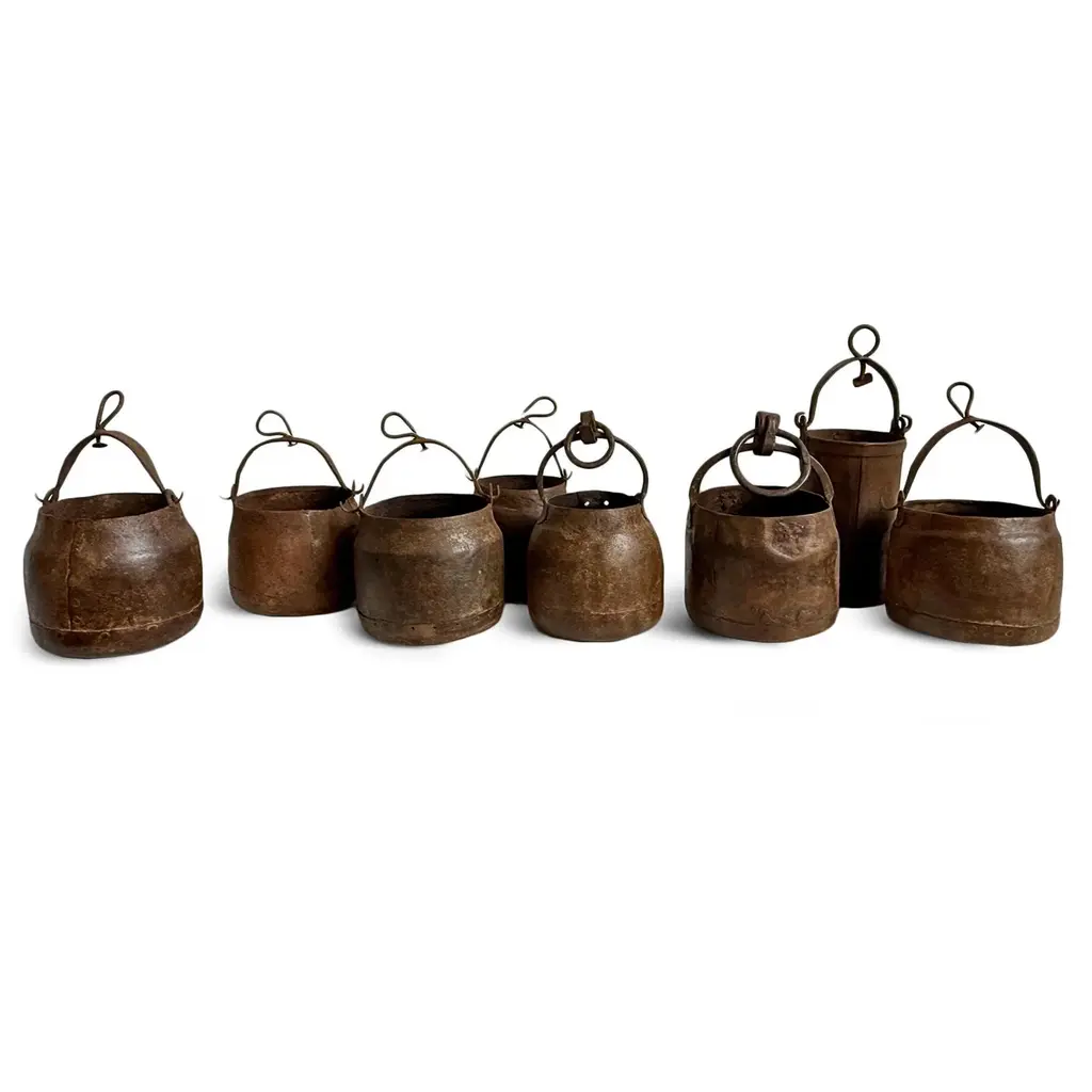 Old antique iron rivet pot with handle. Original rusted aged finish and each unique in natural patina. Sizes vary slightly. Each is sold individually. Great for display or use indoors or out.