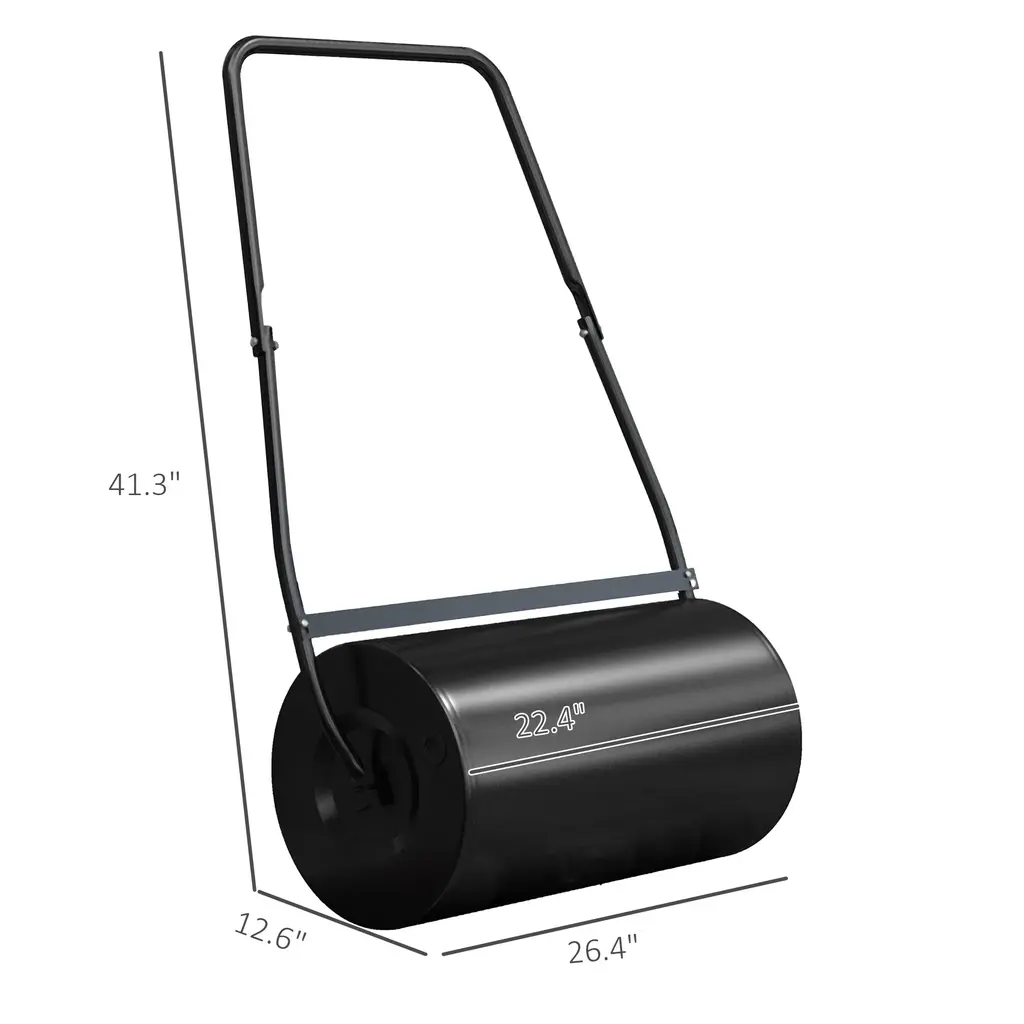 Descriptions:This Outsunny lawn roller water filled is great for flattening uneven ground caused by moles or frost-heaving and packing down newly sown seed or sod. The roller inside has a 46L capacity to fill the water or sand. It is easy to fill and drain with a large filling hole. It has a painted surface, is not easy to rust, and its smooth edge will not damage your lawn when turning. Stylish and functional, it is a must-have for your patio accessories!Features:● Robust steel frame in a painted finish, anti-peeling, and corrosion-free for long-term use● U-handle for comfortable pull and push use● Grain plug allows adding water or sand to increase its rolling weight● Weighs only 20lbs without water or sand for easy storage and transport● Its smooth rounded edges for the smoothest rolling results that will not damage your lawn● Excellent for flattening uneven ground caused by or packing down newly sown seed or sod● Assembly is requiredSpecification:● Color: Black● Material: Steel● Overall Dimension: 26.5"L x 12.5"W x 41.25"H● Roller Size: Φ12.5" x 22.5"W● Roller Capacity: 46L● Item Label: 845-252
