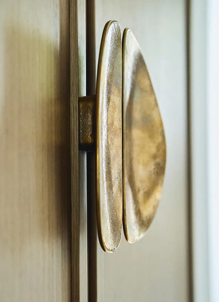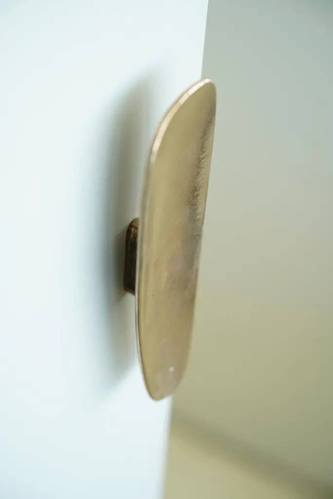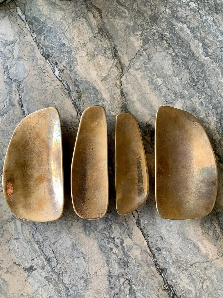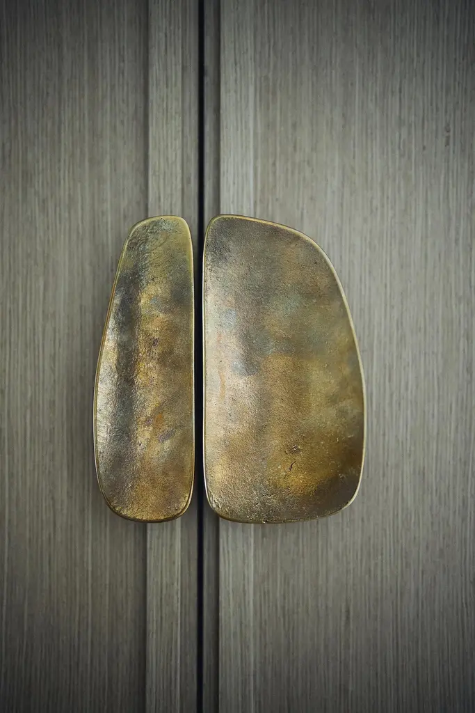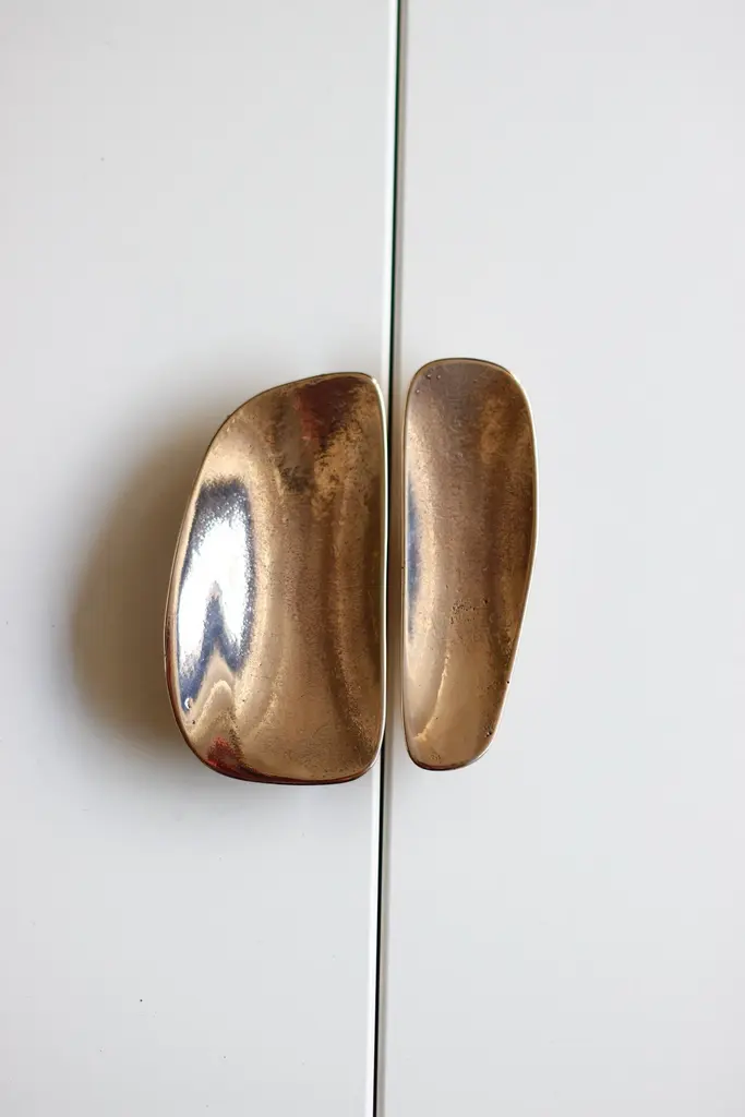 This asymmetrical PAIR of Fermat Cabinet Handles are cast from solid bronze. The Fermat range provides a tactile and beautiful addition to interior spaces. Designed to be applied to cabinets and internal doors, these soft forms are a pleasure to handle. Sand cast in solid bronze and finished by hand, the joinery pulls are luxurious and enduring. This listing is for one MEDIUM size 190 x 60 x 30mm7.5 x 2.4 x 1.2 inchesAND one LARGE size 190 x 100 x 45mm7.5 x 3.9 x 1.8 inchesAvailable in the following finishes: -Polished-Rough Cast Polished-Satin-Blackened Polished-Rough Cast Polished Blackened(See image 9 for finishes) solid bronze will naturally patina in time.