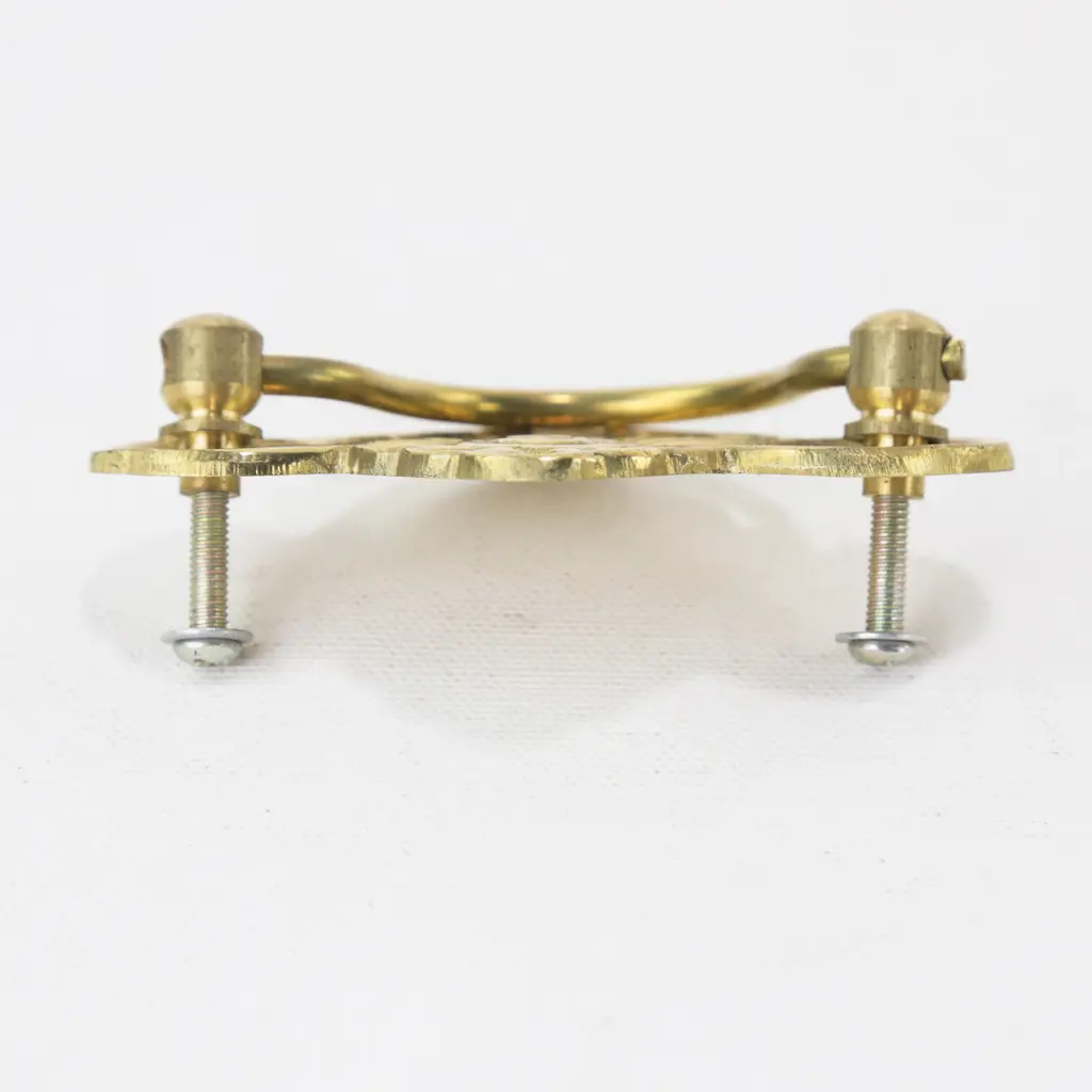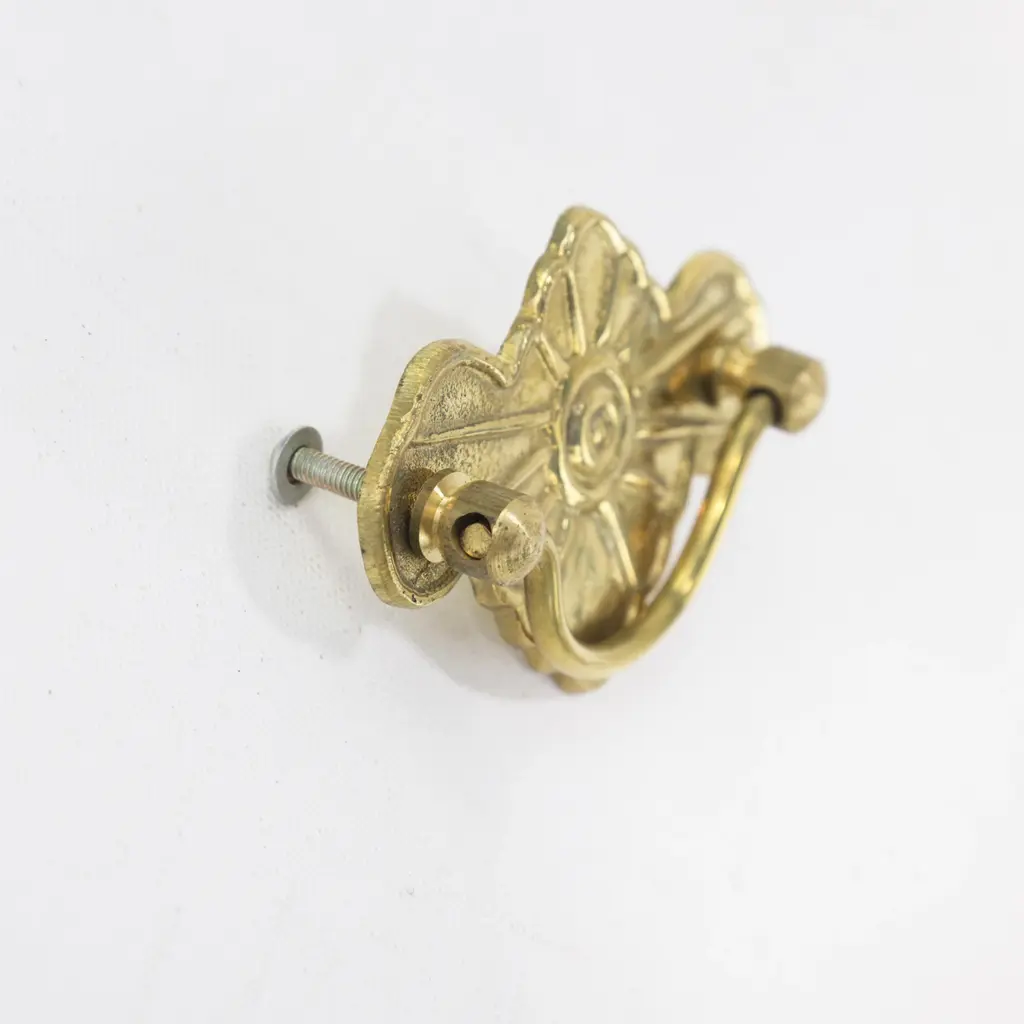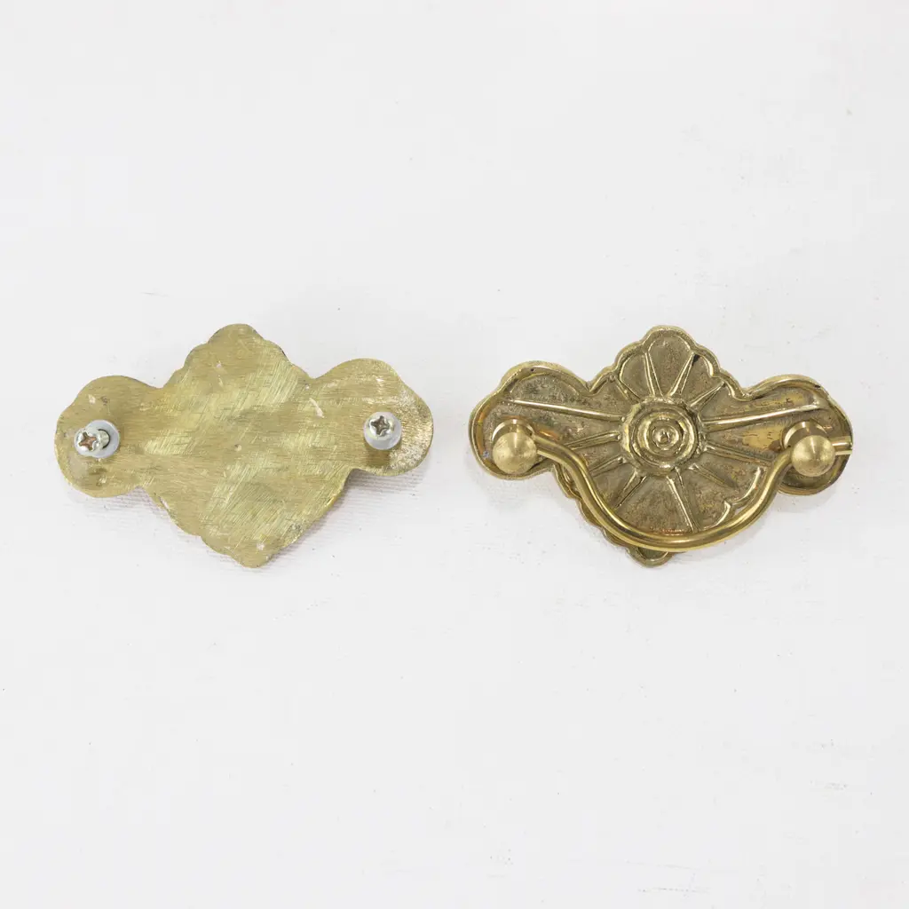 This charming pair of vintage brass cabinet drop pulls features a sculptural fan and sunburst motif radiating from a center. The stylized curves and symmetrical form making them ideal replacements for antique furniture or thoughtful additions to a custom restoration project.