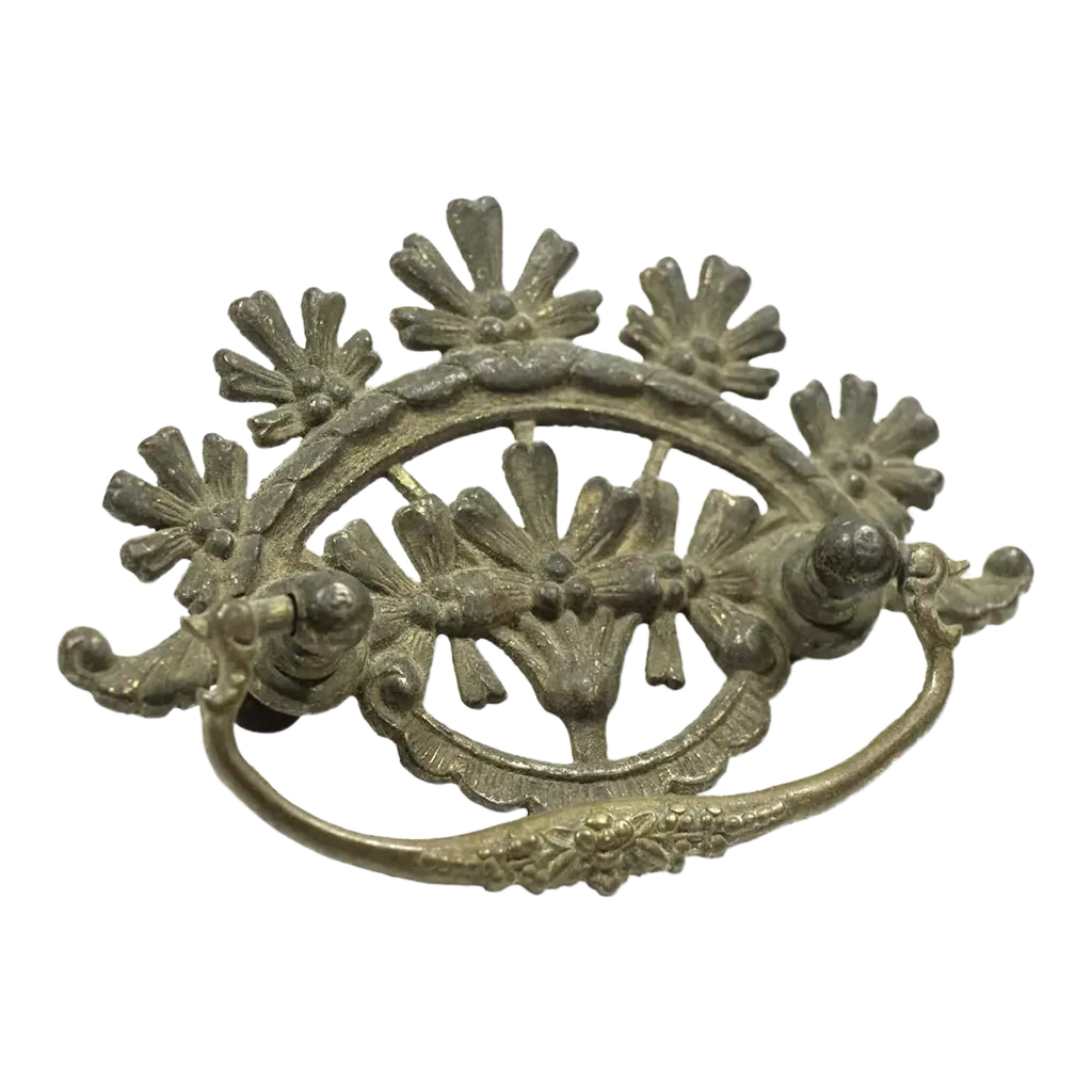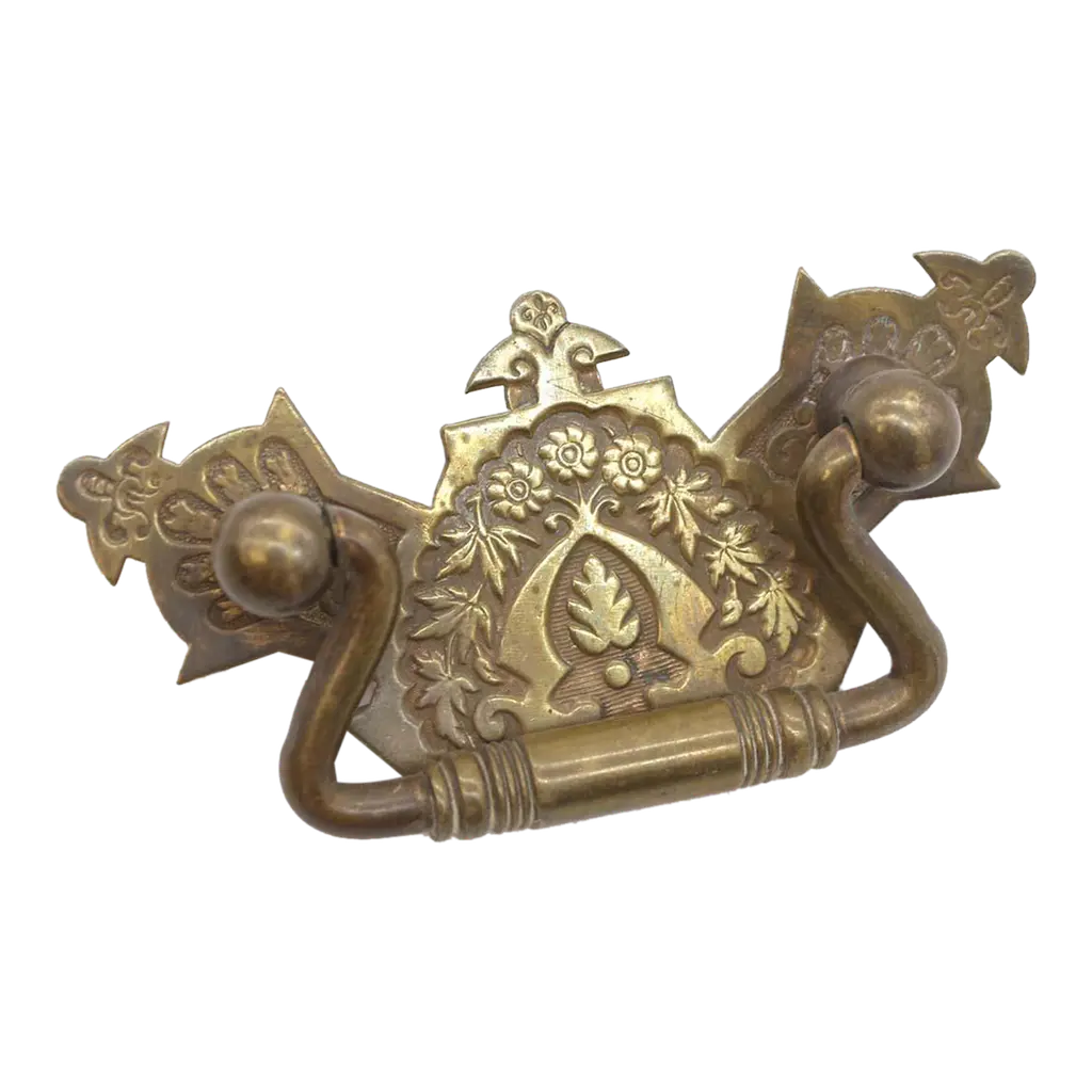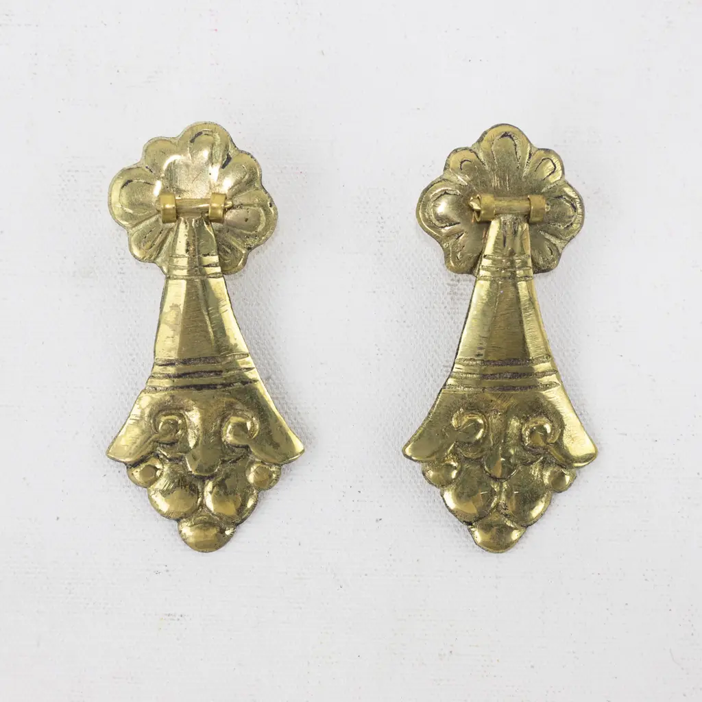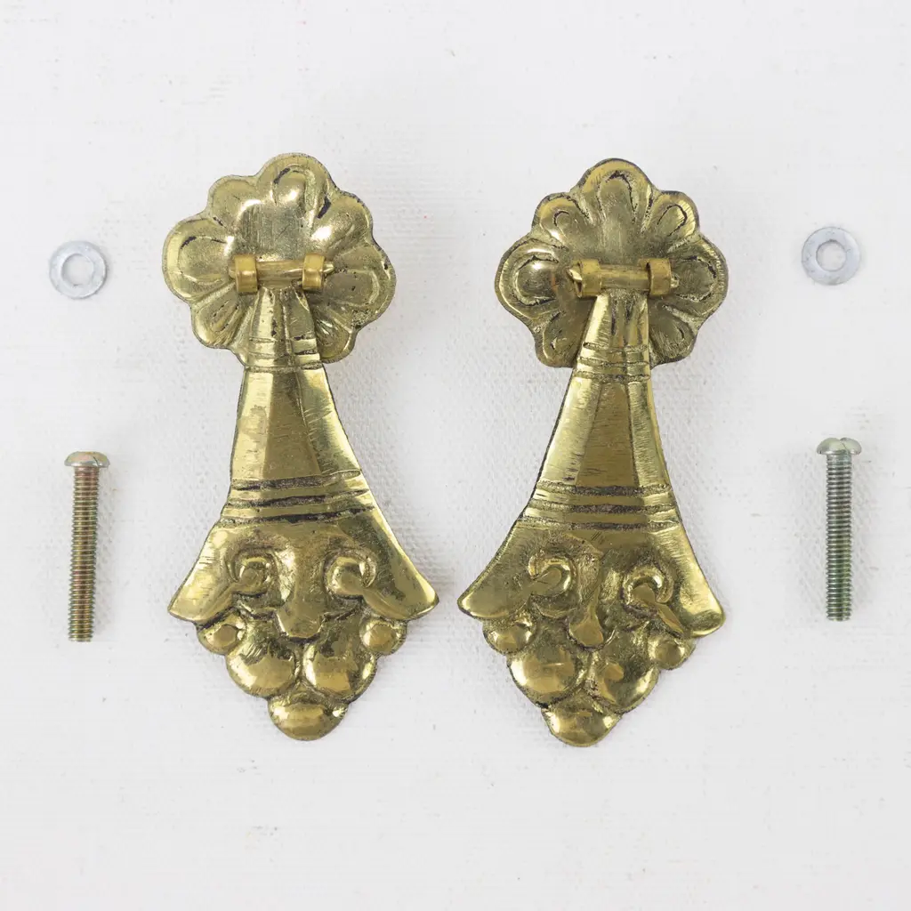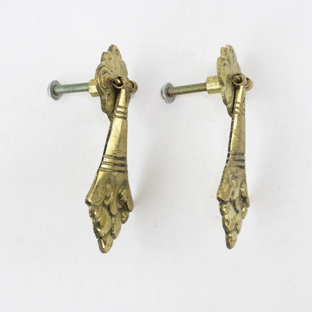 Pair Of Vintage Brass Drop Pulls With Stylized Shell And Scroll Motif