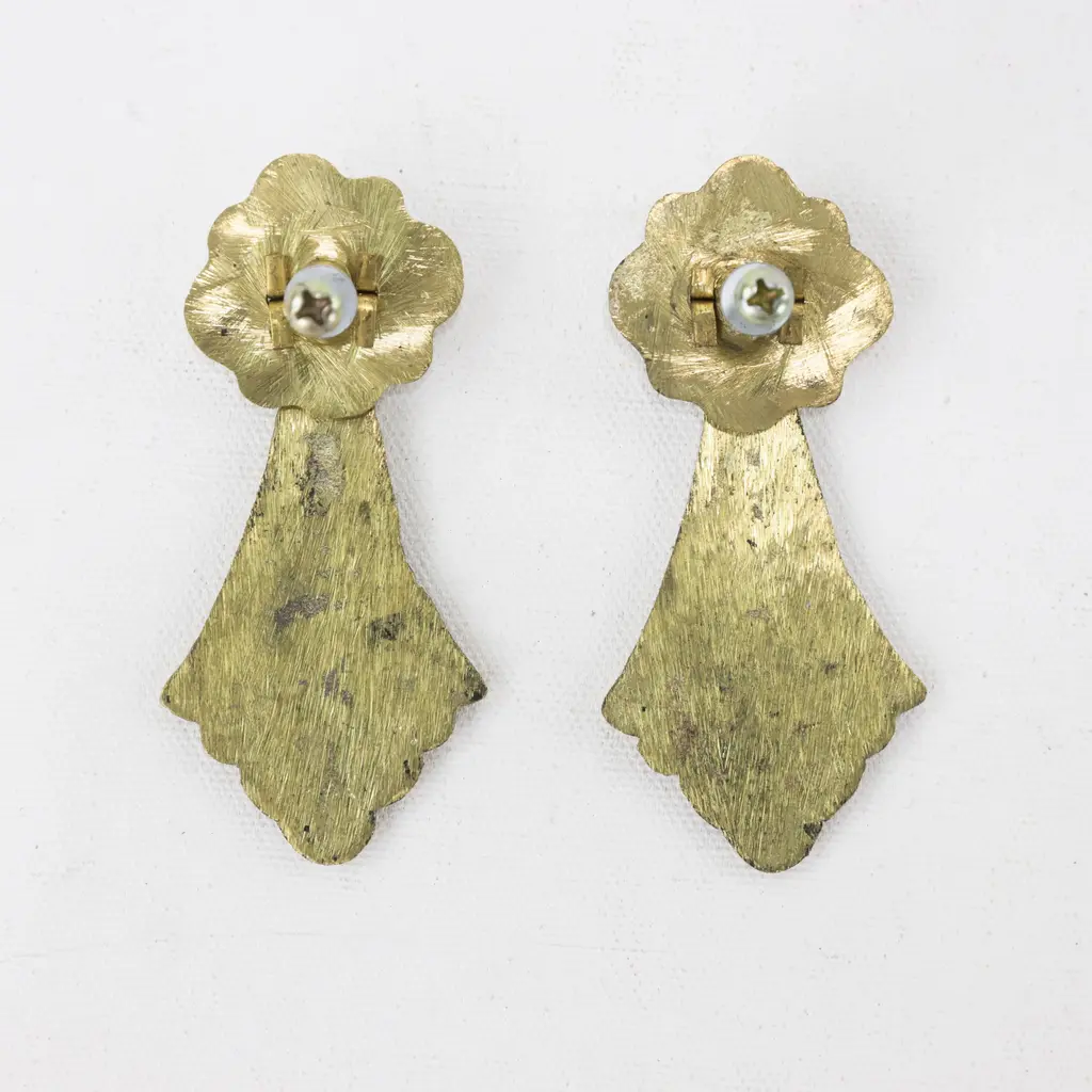 This elegant pair of vintage brass drop pulls showcases a decorative design featuring a scalloped shell-like backplate and stylized scroll on the handle. Crafted in solid brass with a soft aged patina, these pulls add classical charm and historic character to cabinets, dressers, or other fine furniture pieces.