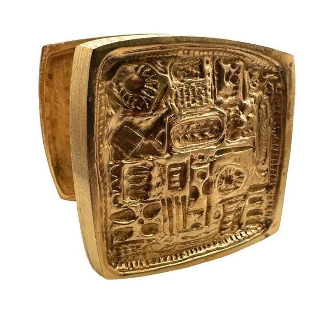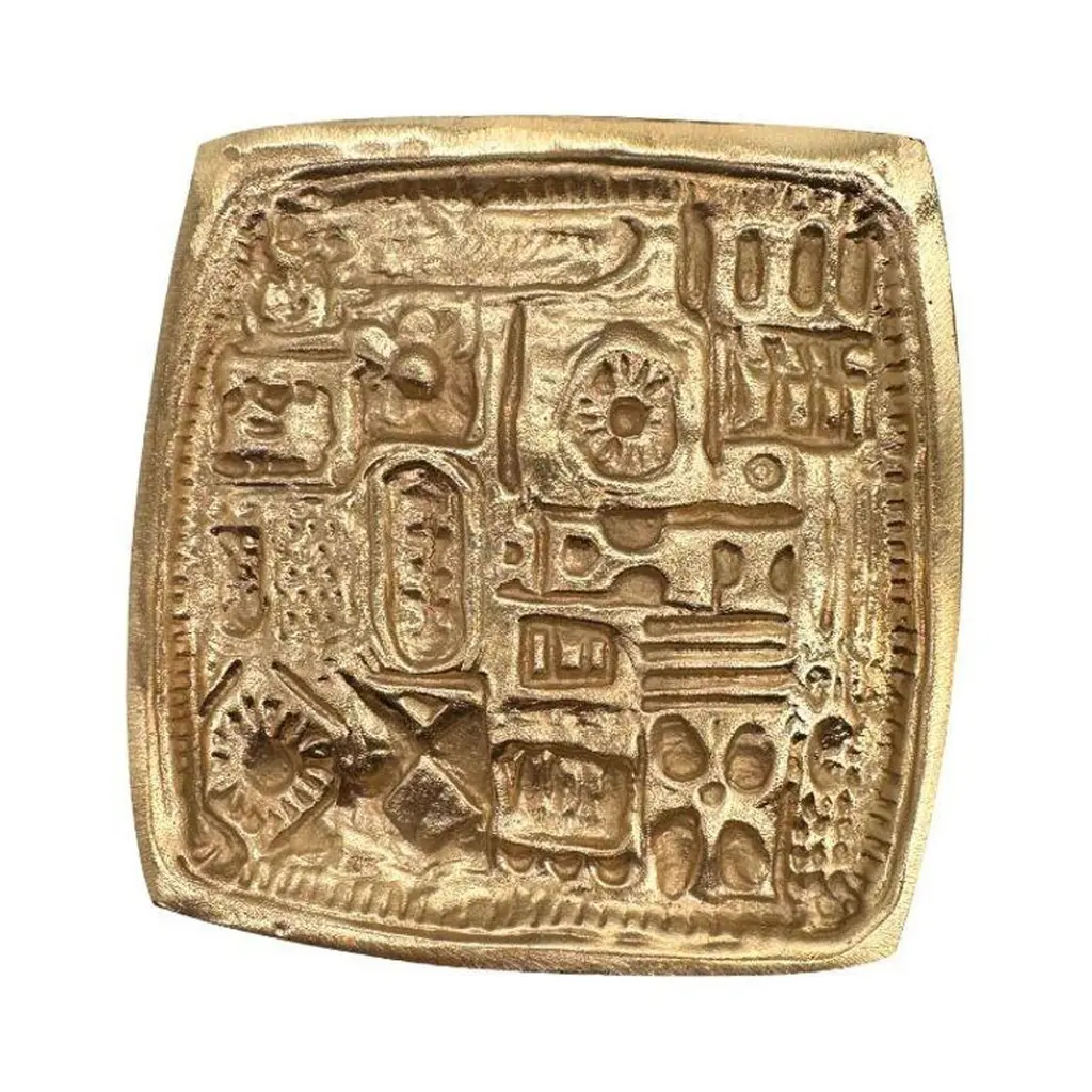 Paul Evans-style bronze cast door pull set with a distinct late 1960s Mid-century/Brutalist pattern across the front. This Pull set is made from solid bronze pieces, each made from a sand casting that has been highly polished along the front with a machined thread for mounting in the back of each.This set includes 2 pulls, both for the front and back of the door. Your choice of a patina bronze, or polished like new (as listed in the image)Sale for 1 set (2 pulls), 3 sets (6 pulls) AvailableHeight: 5.75" in Width: 5.75" in Depth: 5" inUnited States, 1970