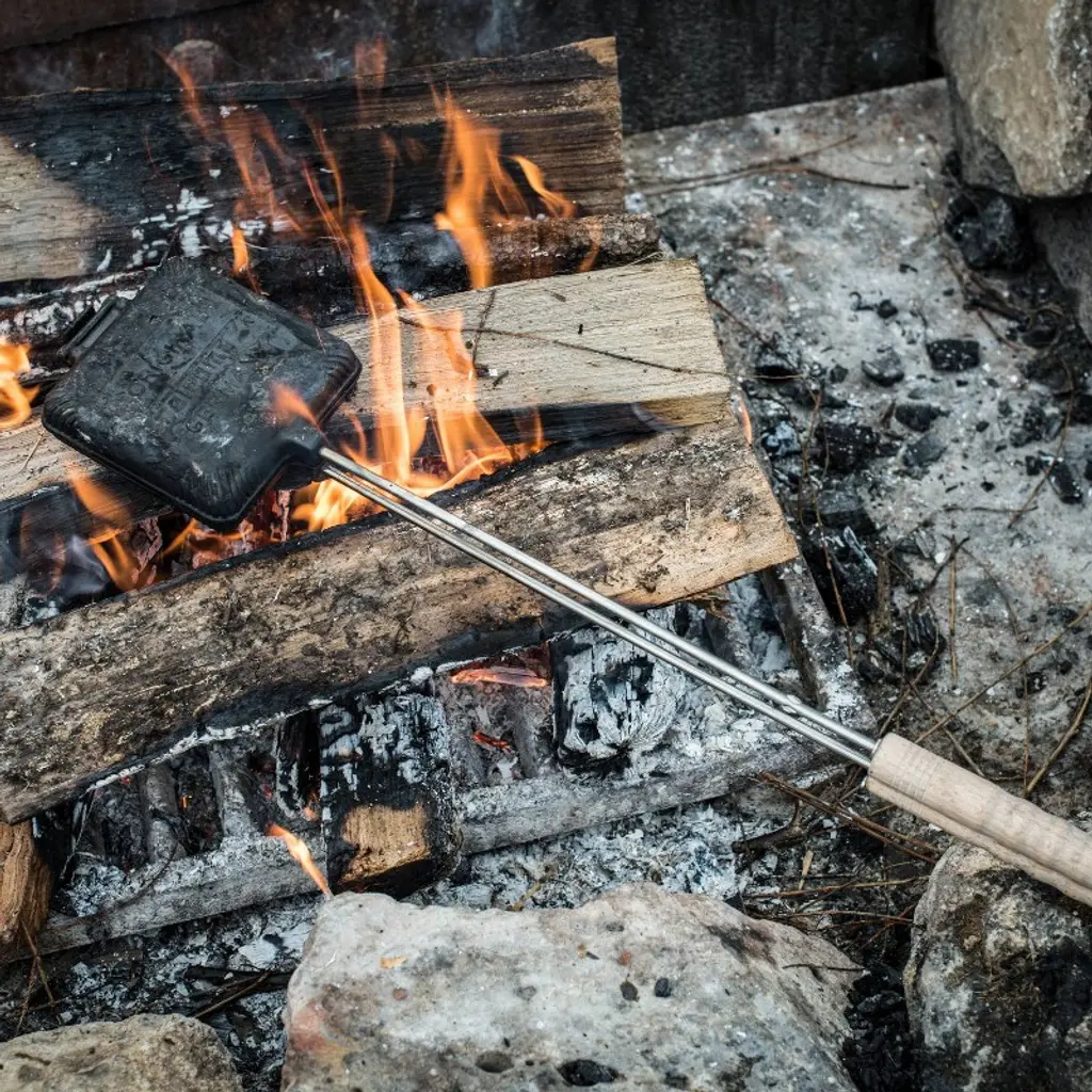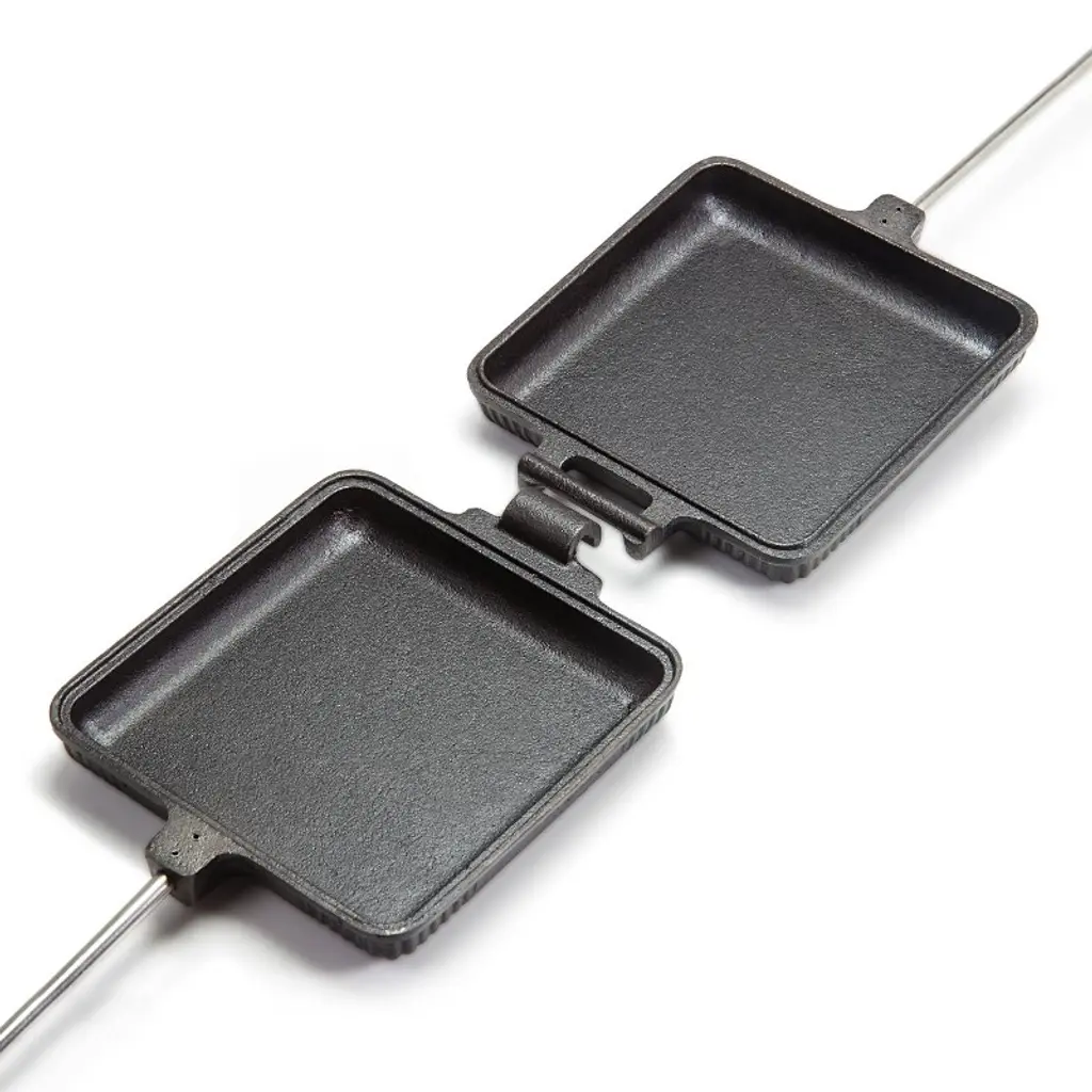 The Petromax Sandwich Iron is perfectly suitable for delicious toasts, bagels or dumplings. Whether as a snack at the campfire or as a great addition to your BBQ menu: sandwiches will now be toasted in the cast iron molds in the embers of the campfire or on the barbecue. The toasted bread is crusty and the stuffing deliciously juicy, for the toast pans of the sandwich iron store heat perfectly. Stuffed sandwiches and much more The pans, which can be separated thanks to a hinge, are ideal for toasts of 4.3" x 4.3". But other treats will be a success as well, for a practical locking hook keeps the toast pans together, so that nothing falls down. From sweet to savory, much can be tried out in the sandwich iron, for even the stored residual heat can be used for baking gently. The wooden handles fit comfortably in the hand, and the bar ensures enough distance from the source of heat. The cast iron can be used immediately, for it is provided with a (grade 3 soybean oil) pre-seasoned finish. For cleaning, you simply separate the cast iron halves thanks to the hinge. By the way, when cleaning, you will enjoy the amazing properties of cast iron, for it has a natural anti-adhesive effect.