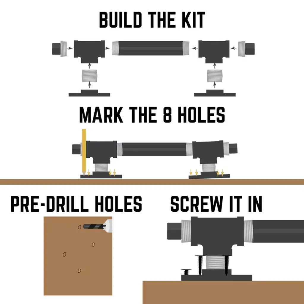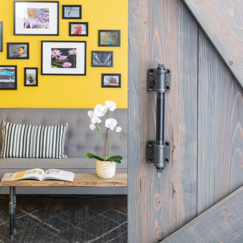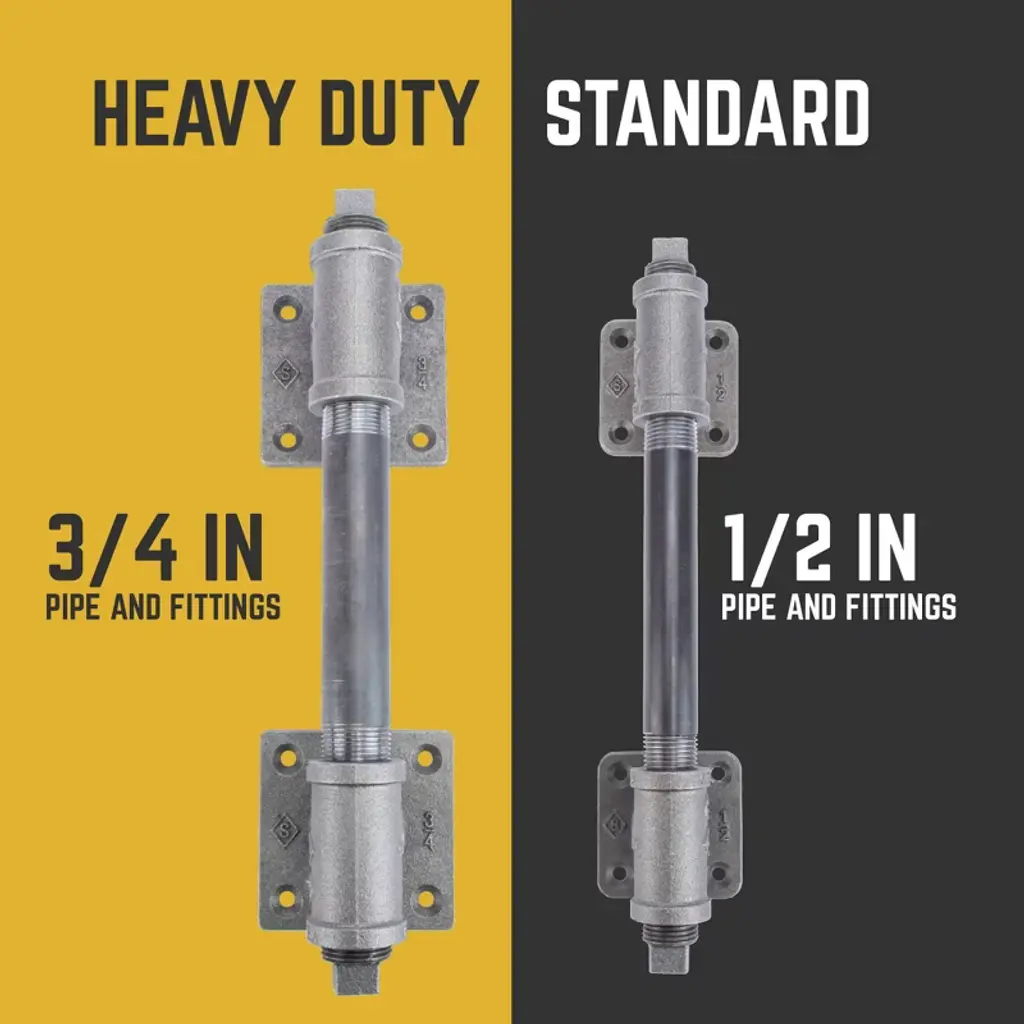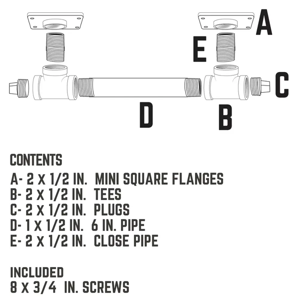 The Tee barn door handle has been redesigned with a sleek, modern edge to match today’s industrial farmhouse style. Rounded curves are replaced with straight tees, squared plugs, and our patented square mini flange. The ½-inch pipe and fittings look great on full-size doors or as drawer pulls for larger furniture. The mini flange adds a lighter touch for those who prefer a subtle industrial look. Made from authentic plumbing pipe and fittings, it can be painted to match your décor or sealed with a clear coat. For best results, use on solid wood doors. Works beautifully with modern, farmhouse, and rustic designs. The assembled handle measures 10.75 inches long with a 5.5-inch grip and 2.5-inch mini square flanges. The kit includes two ½-inch nipples, one ½-inch x 6-inch pipe, two ½-inch mini square flanges, two ½-inch tees, two ½-inch plugs, eight screws, instructions, and a clean and seal sheet. The pipe is made from welded Schedule 40 steel, with a dark gray to black finish. We recommend securing the flanges into a solid door. Features our exclusive patented square mini flange.