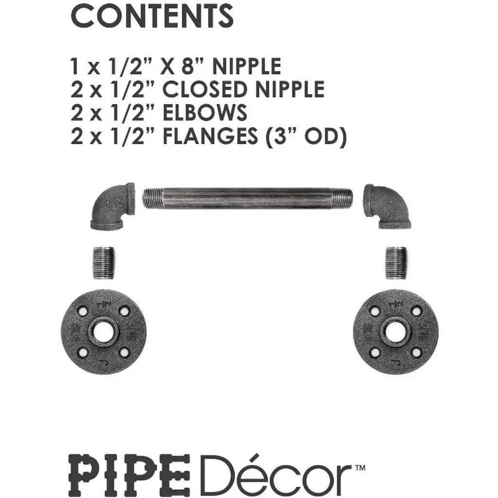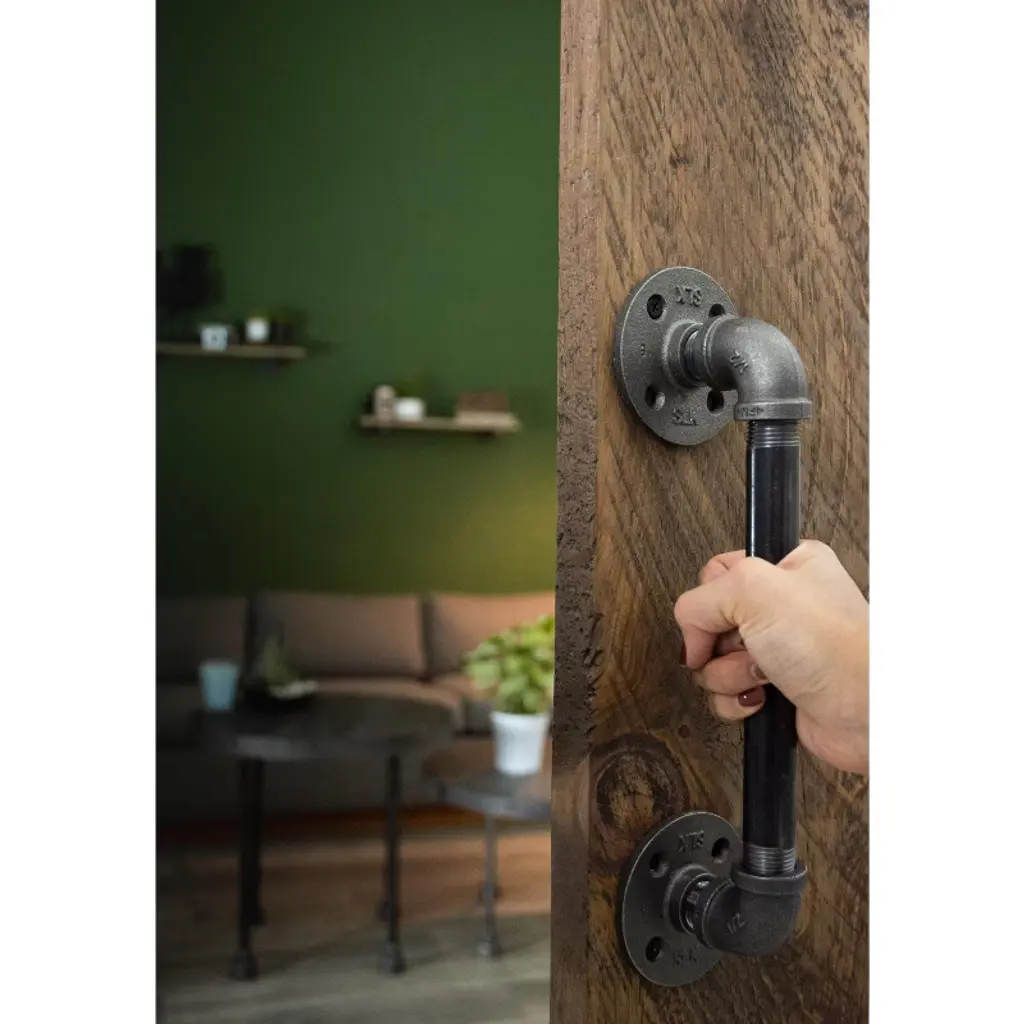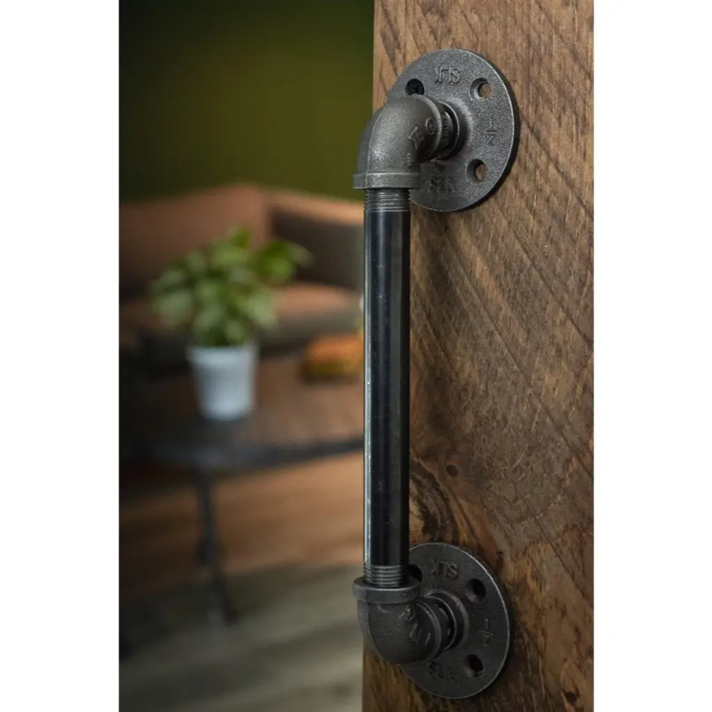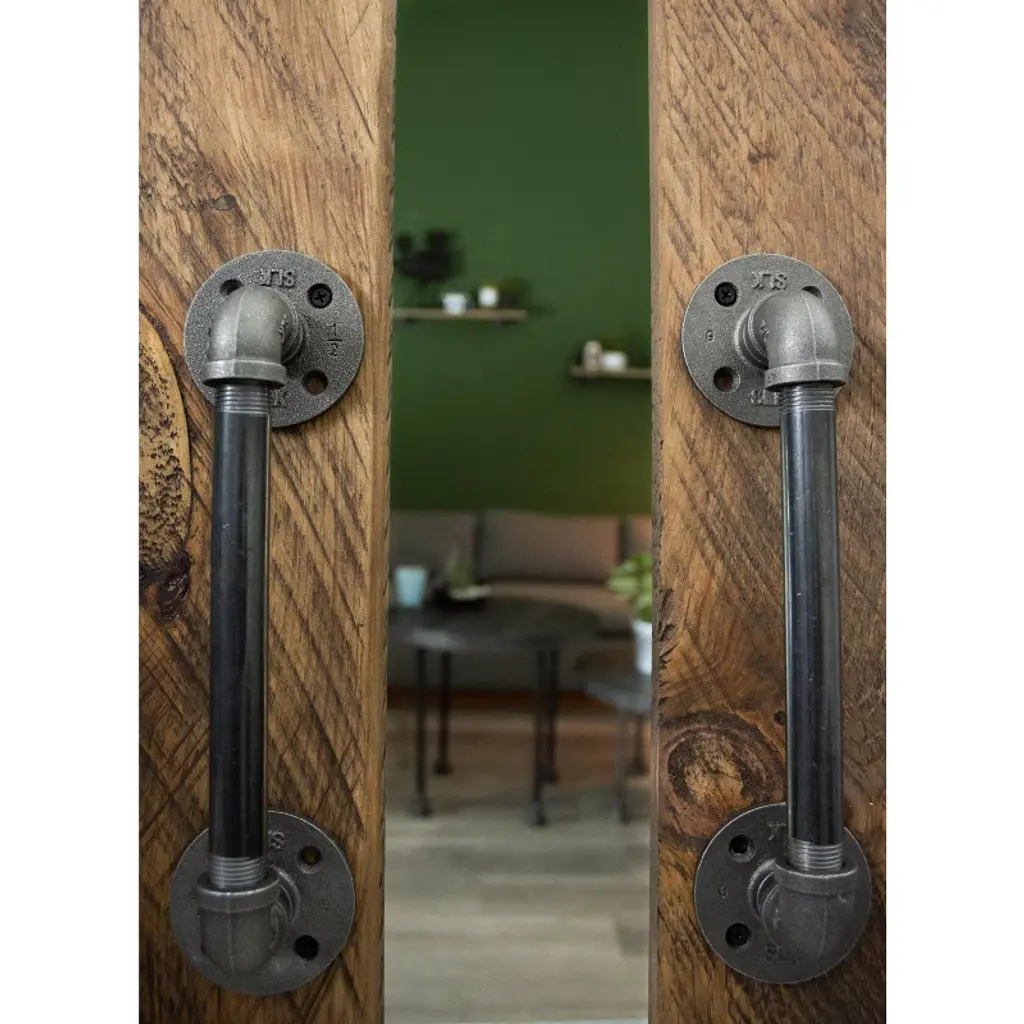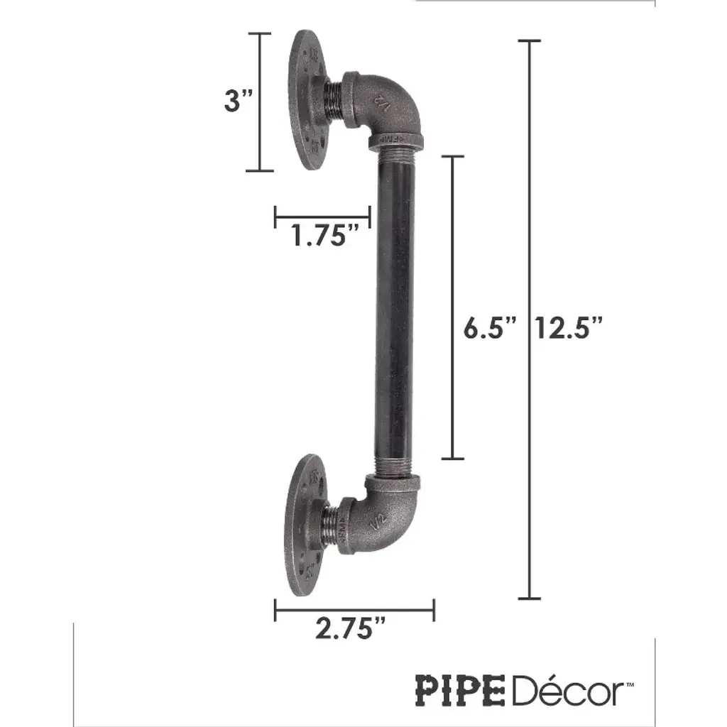 A perfect blend of function and style, these industrial farmhouse-style barn door pulls are the finishing touch for your rustic barn doors. These are not hollow, imitation barn door handles—they are genuine industrial pipe fittings that will stand the test of time. You will know Pipe Décor parts and accessories when you hold them: beauty and beast, strength and style. This is real industrial pipe for your decoration and designs. Accept no substitutes. Clean and seal each piece before assembly to ensure that they stay rust-free. After cleaning, seal the pipe with polyurethane spray to protect it from rust and scratches. The assembled barn door handle measures 12.5 in. H x 2.75 in. D and includes everything you need to put one handle together. For best results, we recommend screwing the flanges into a solid door. This kit uses 1/2-inch pipe and comes with all the necessary fittings for assembly. Cleaning and sealing directions are included, and we recommend wearing gloves during the cleaning process to prevent oil from getting on your hands. Assembly is required.