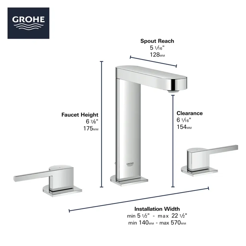 Elegant or minimalist, the Grohe Plus Wideset Bathroom Faucet combines the clean, linear angles of a cube with the gentle curves of a circle making it a distinctive choice no matter the design aesthetic. Engineered to bring comfort and convenience to your bathroom, the Plus Wideset Faucet features the durable Grohe starlight coating for easy care and lasting beauty.