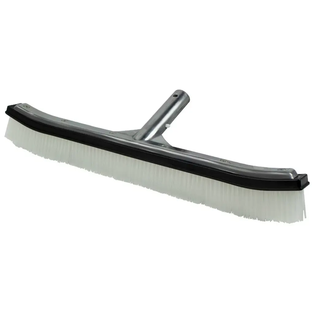 Say goodbye to unsightly stains with this sturdy pool brush. No more stress about cleaning your pool walls with this curved wall brush. Make your cleaning jobs easier than ever before. Product Features: Angled head in an ideal position for cleaning hard to reach crevices Stiff nylon bristles are effective against stubborn algae buildup Safe to use without damaging vinyl liners or painted surfaces Can be hand held or used with pole Fits most standard poles (1.25") - not included Pole slides over handle Push button release v-clip for secure pole fit Dimensions: 5.5"H x 7"W x 1.12"D Material(s): aluminum/nylon
