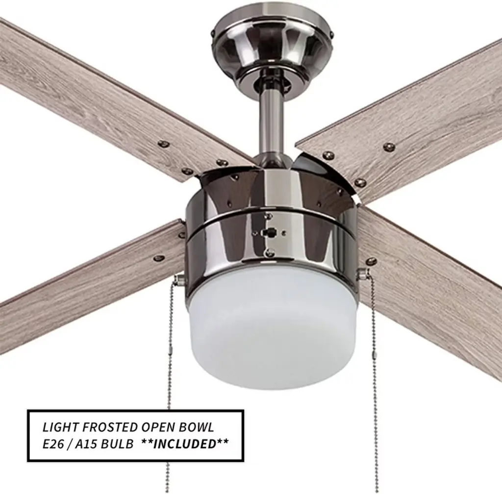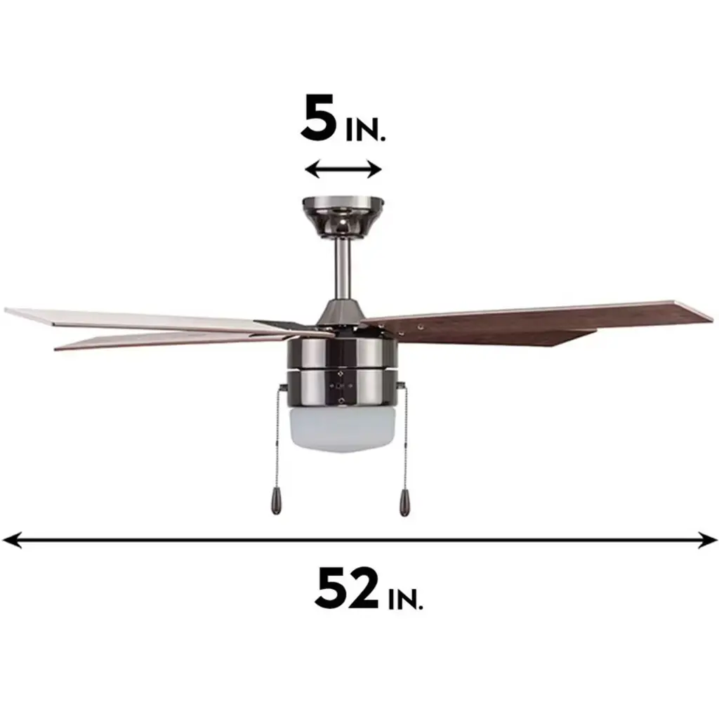 This 52-Inch Ceiling Fan with a quiet, reversible motor is the perfect addition to any room, providing a peaceful indoor environment year-round. The 3-speed reversible motor offers versatile performance, keeping you cool in the summer and circulating warm air in the winter to help reduce energy costs. Ideal for spaces up to 350 square feet, it’s perfect for living rooms, bedrooms, dining rooms, and family rooms. Included with the fan are energy-efficient LED bulbs to brighten up any room in the home or office space while offering long-lasting illumination. The fan is specifically designed for rooms with low ceilings, ensuring optimal air circulation without taking up valuable space. It also features reversible blades in gray oak and light oak, allowing it to seamlessly blend with your existing decor. With a pull chain control for easy operation, this fan is crafted from a combination of wood, glass, and metal in a sleek brushed nickel finish. The fan measures 52 inches long, making it a compact and stylish solution for medium-sized rooms. Installation can be completed in 45 to 60 minutes. Enjoy comfort, energy savings, and stylish, sleek design all in one with this Indoor Ceiling Fan with Quiet, Reversible Motor from Portage Bay, designed to fit your space and enhance your home's decor.