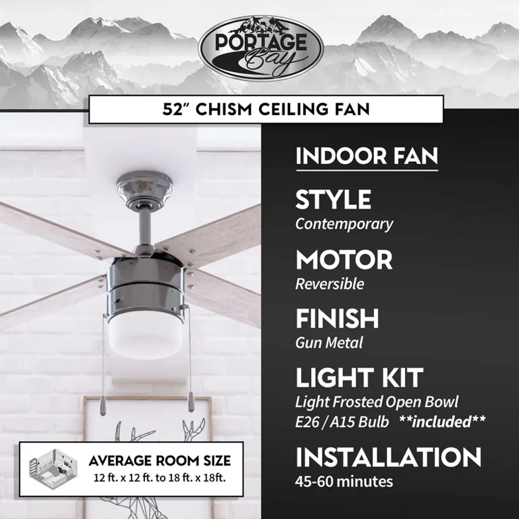 Portage Bay Madrona Indoor Home Ceiling Fan, Led Light Fixture With Quiet 3 Speed Reversible Motor And Pull Chain, 52 Inch, Gun Metal